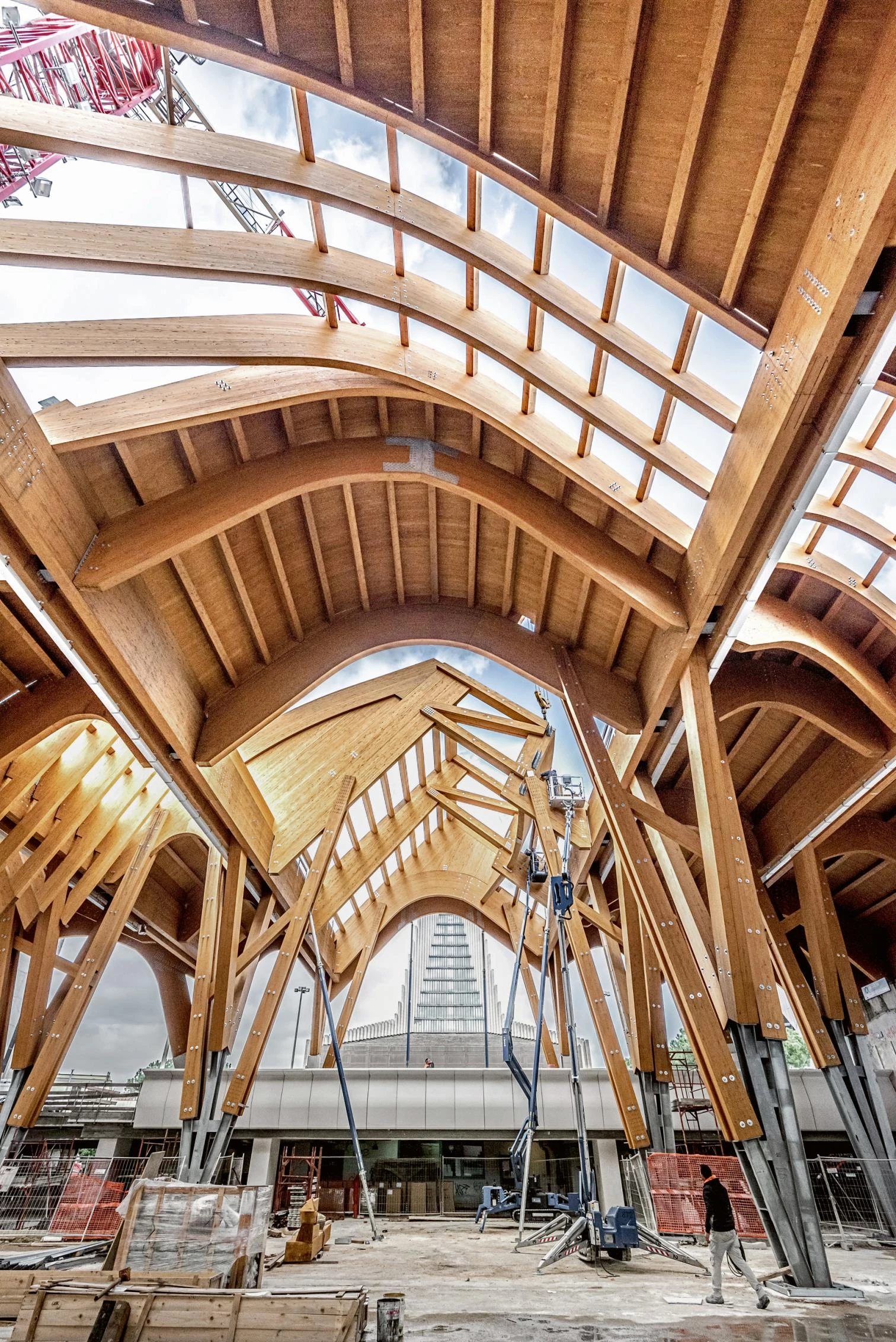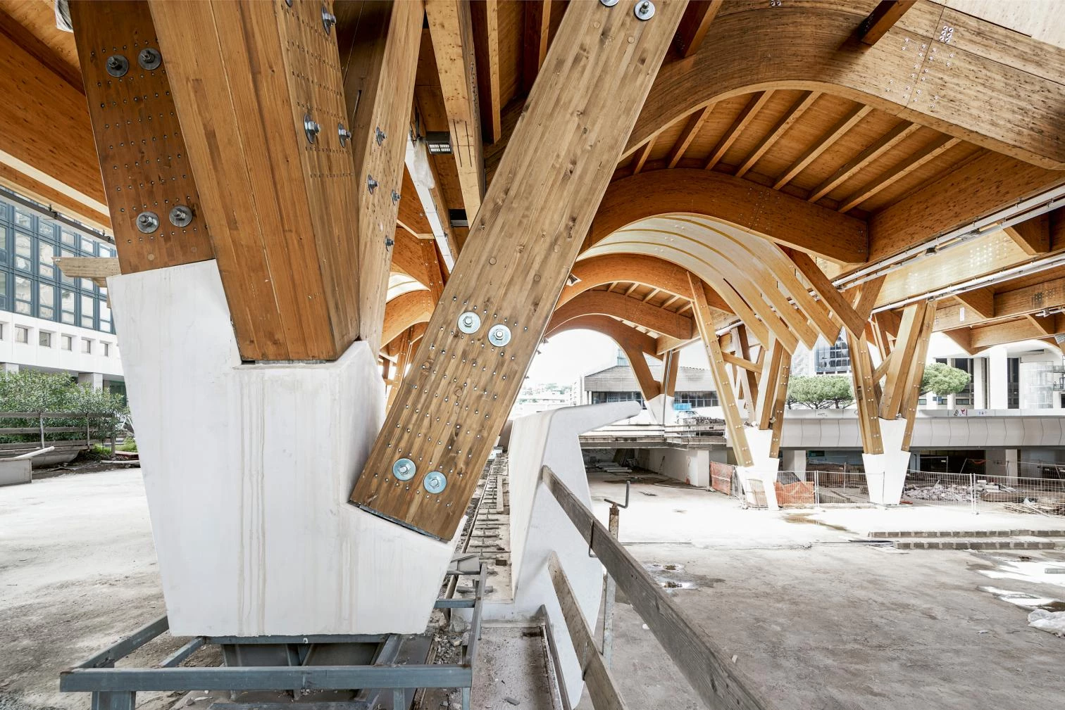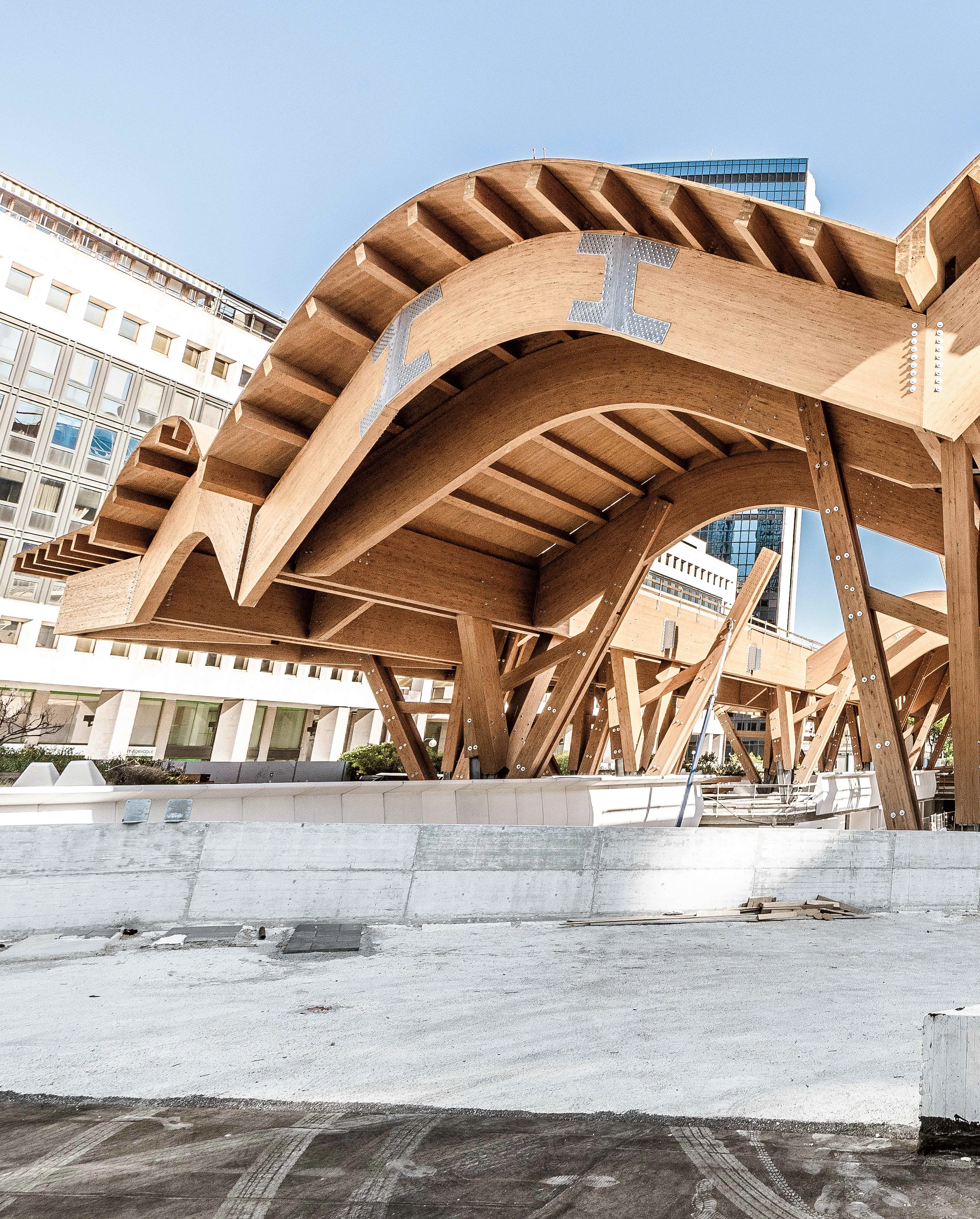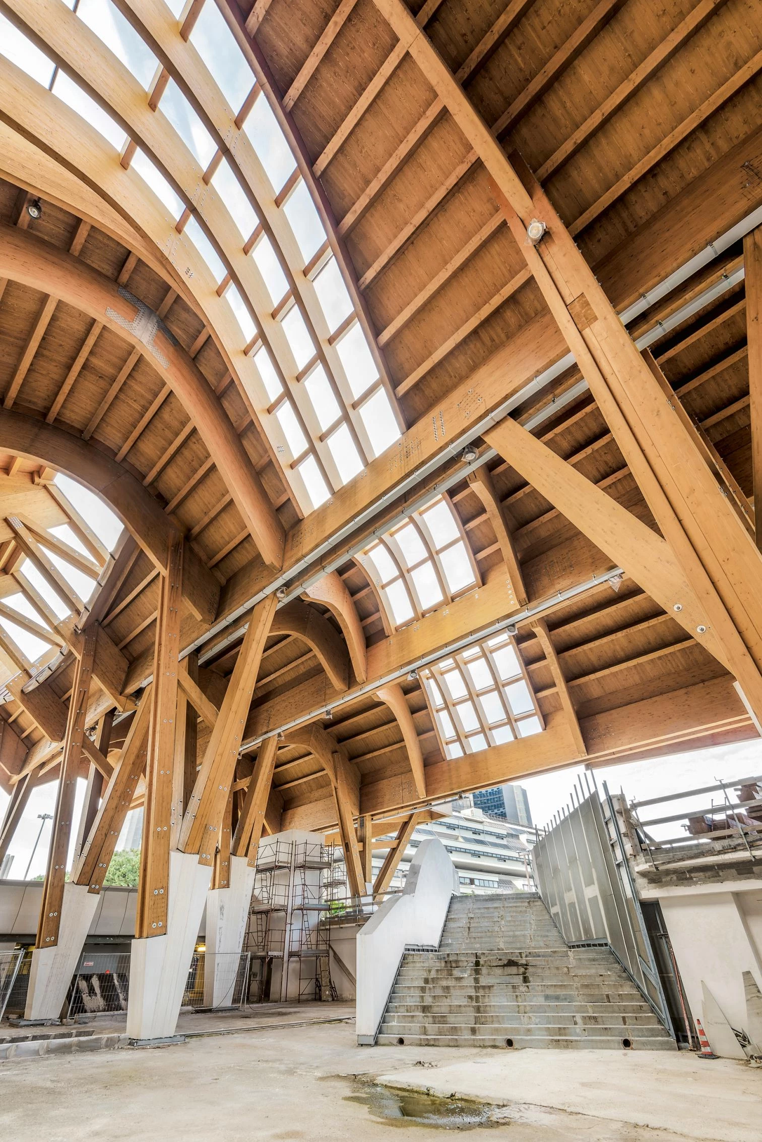 The roof and the supports are constructed with glued laminated timber. This material was selected because it permits creating sinuous forms that stand out against the strict urban pattern and buildings in the district designed by the Japanese Kenzo Tange.