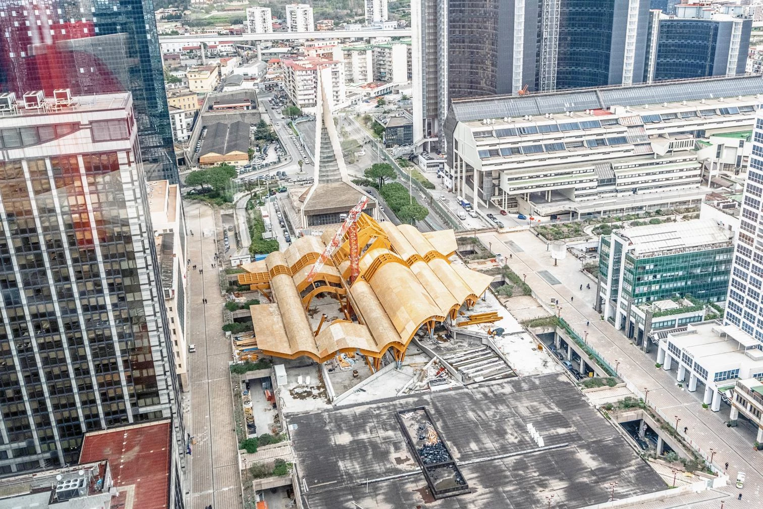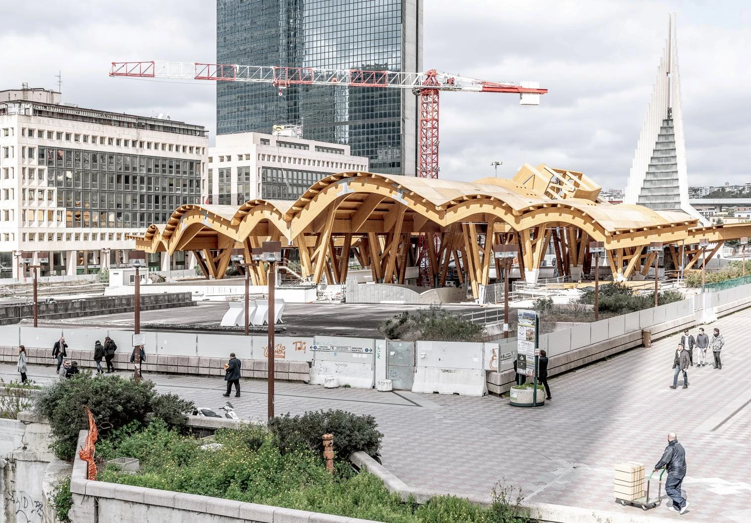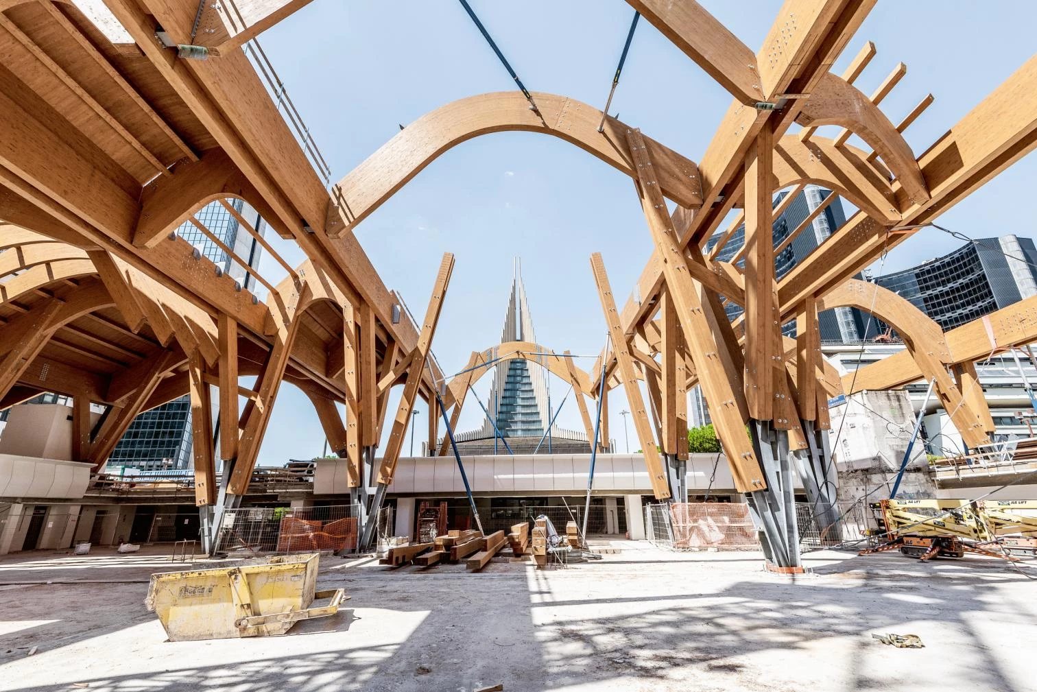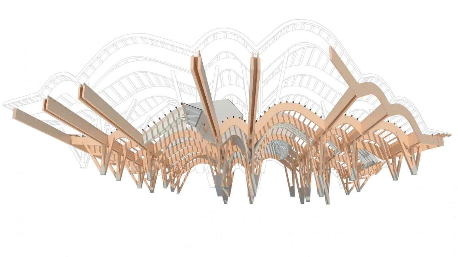 The roof and the supports are constructed with glued laminated timber. This material was selected because it permits creating sinuous forms that stand out against the strict urban pattern and buildings in the district designed by the Japanese Kenzo Tange.