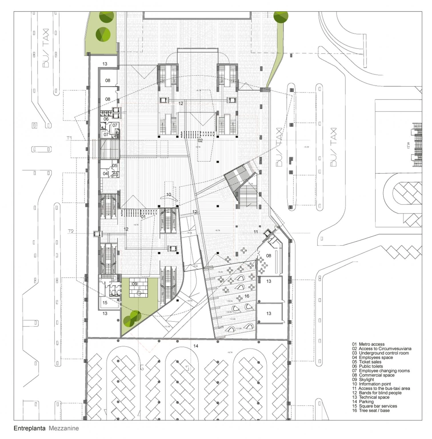 The station’s roof will be topped with an artwork based on an archaeological piece found in Pompeii, configuring in this way an organic and free-flowing plaza that gathers art, architecture, and archaeology under one same cover.