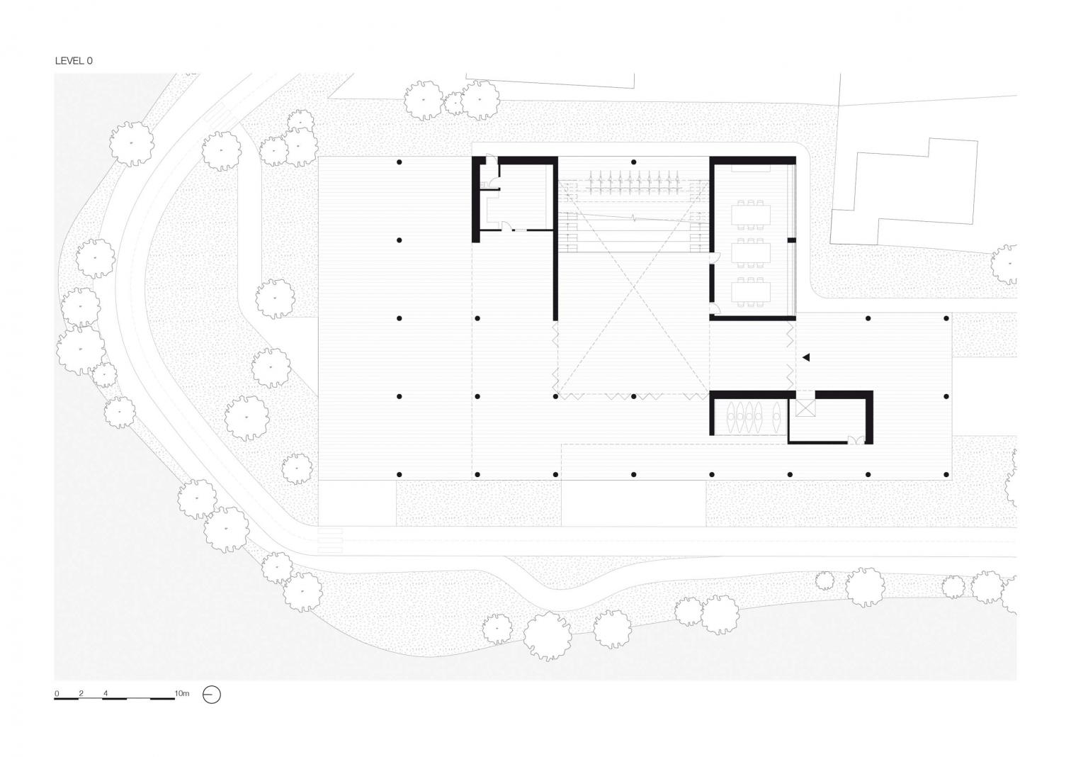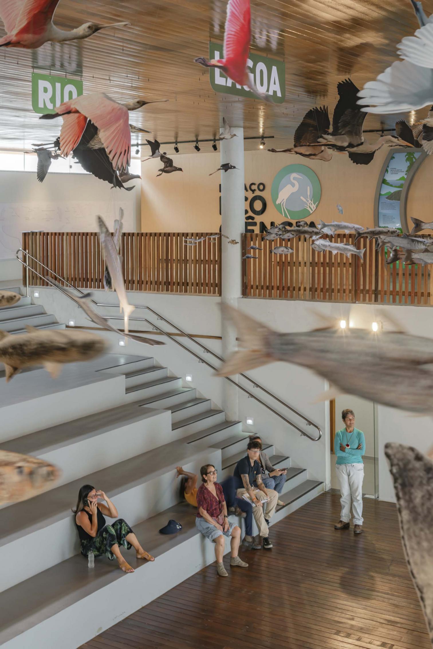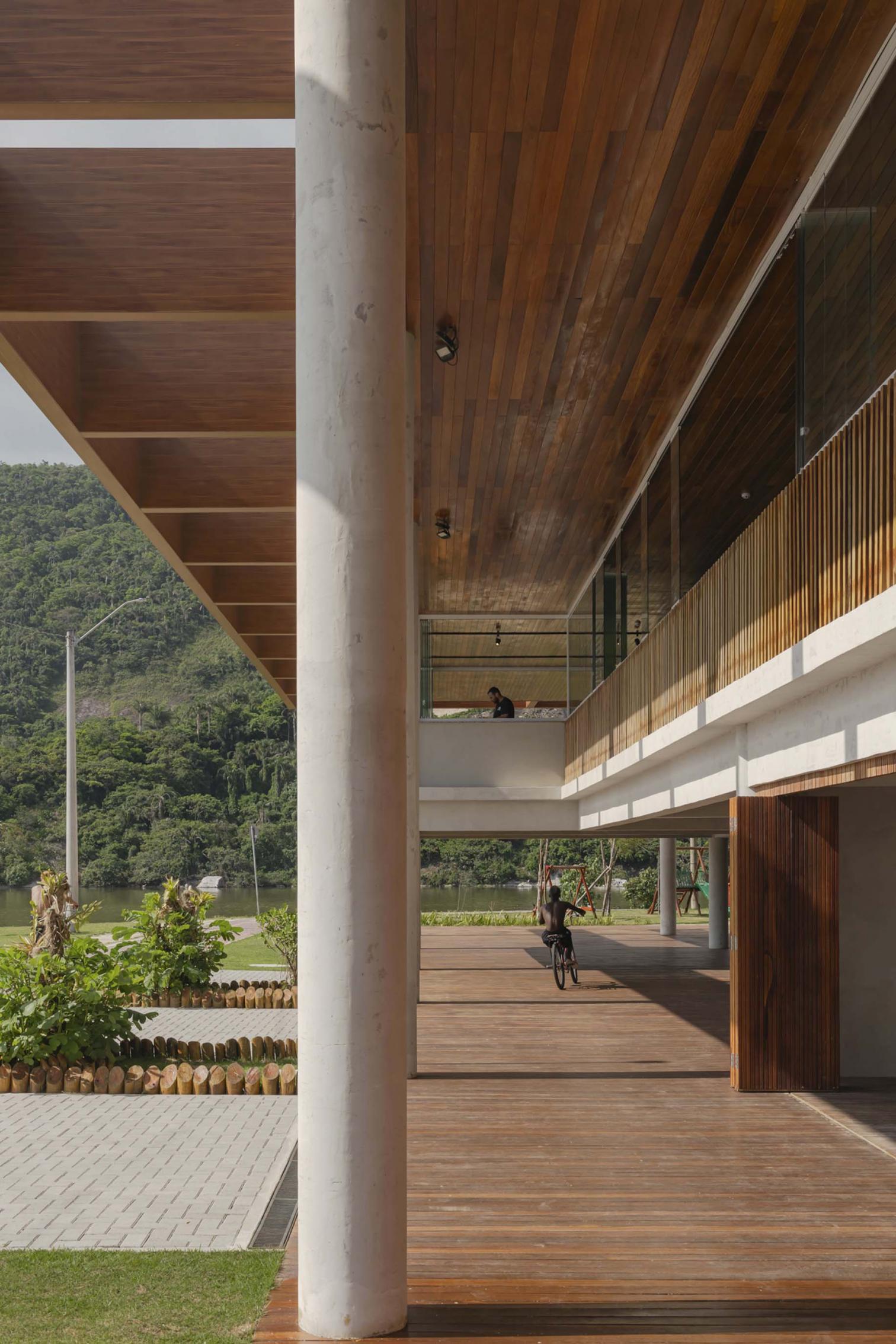 The building, two-story and mostly square in volume, is characterized by a rectangular roof that spreads out with generous eaves, held up by a series of columns. The 2,800-square-meter ecomuseum is built mainly with cumarú wood and features exhibition spaces, offices, a restaurant, multipurpose areas, and a storage place for kayaks, organized around an open central atrium. With a cladding of modules of wood and glass, the facade offers flexibility, allowing different configurations – whether closed or open – through doors and windows.