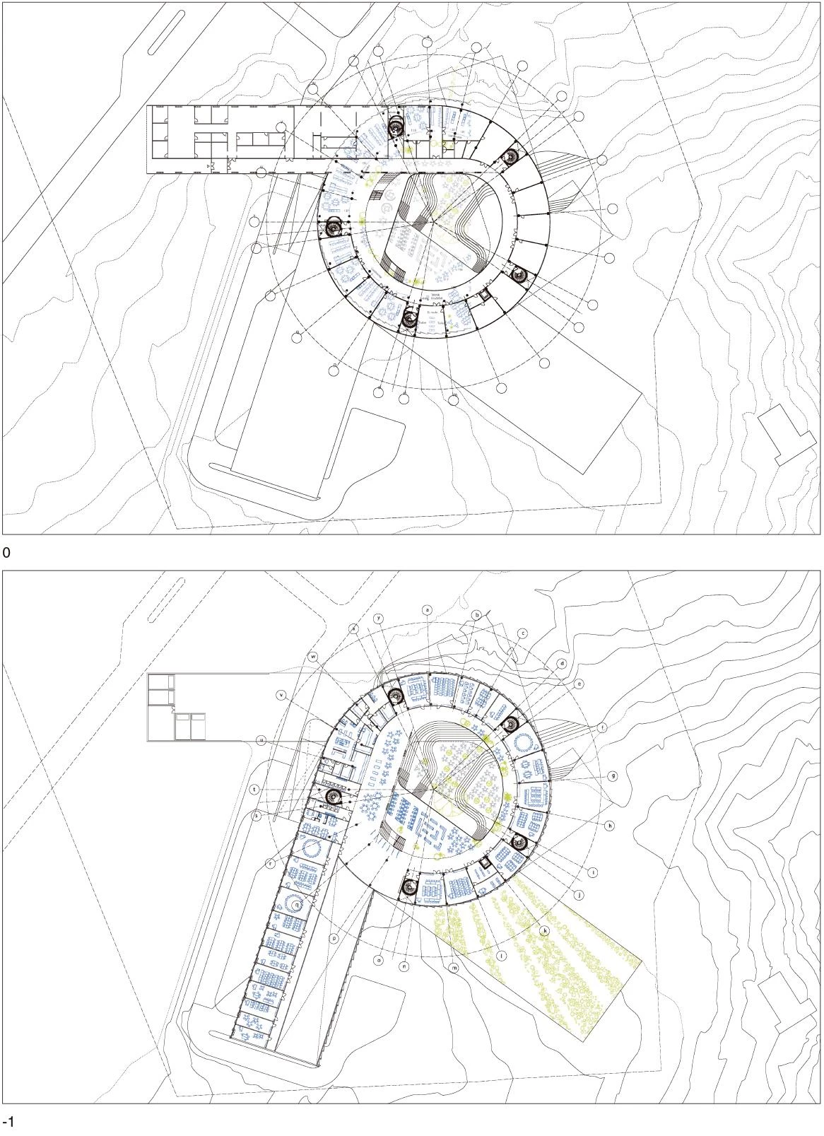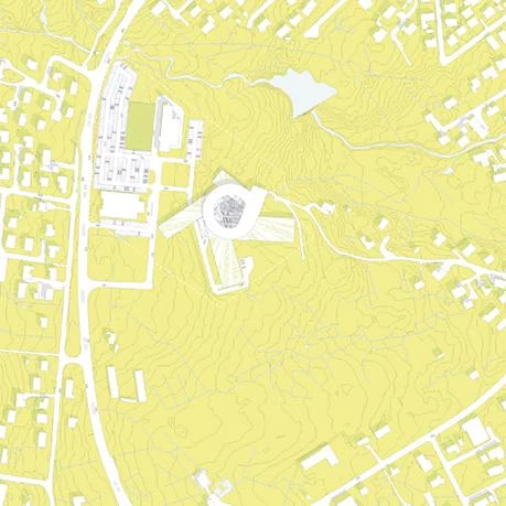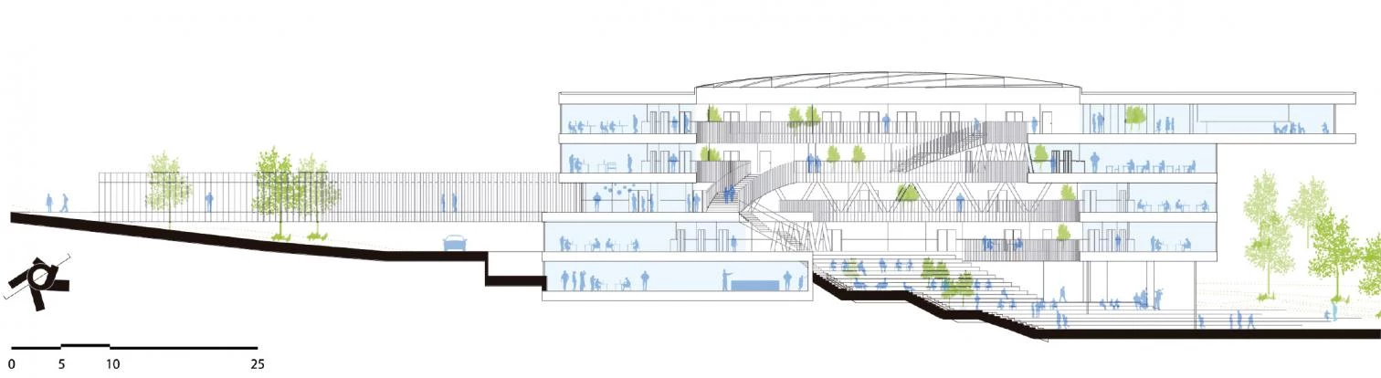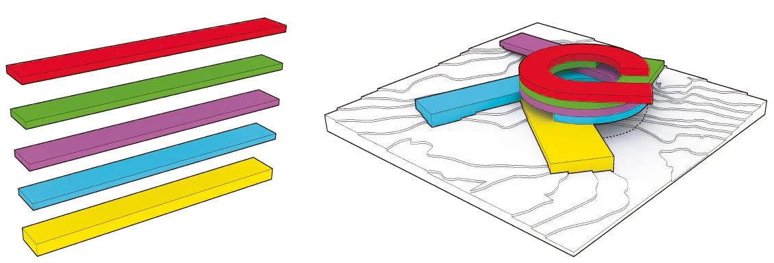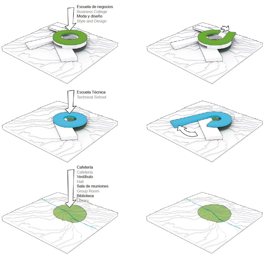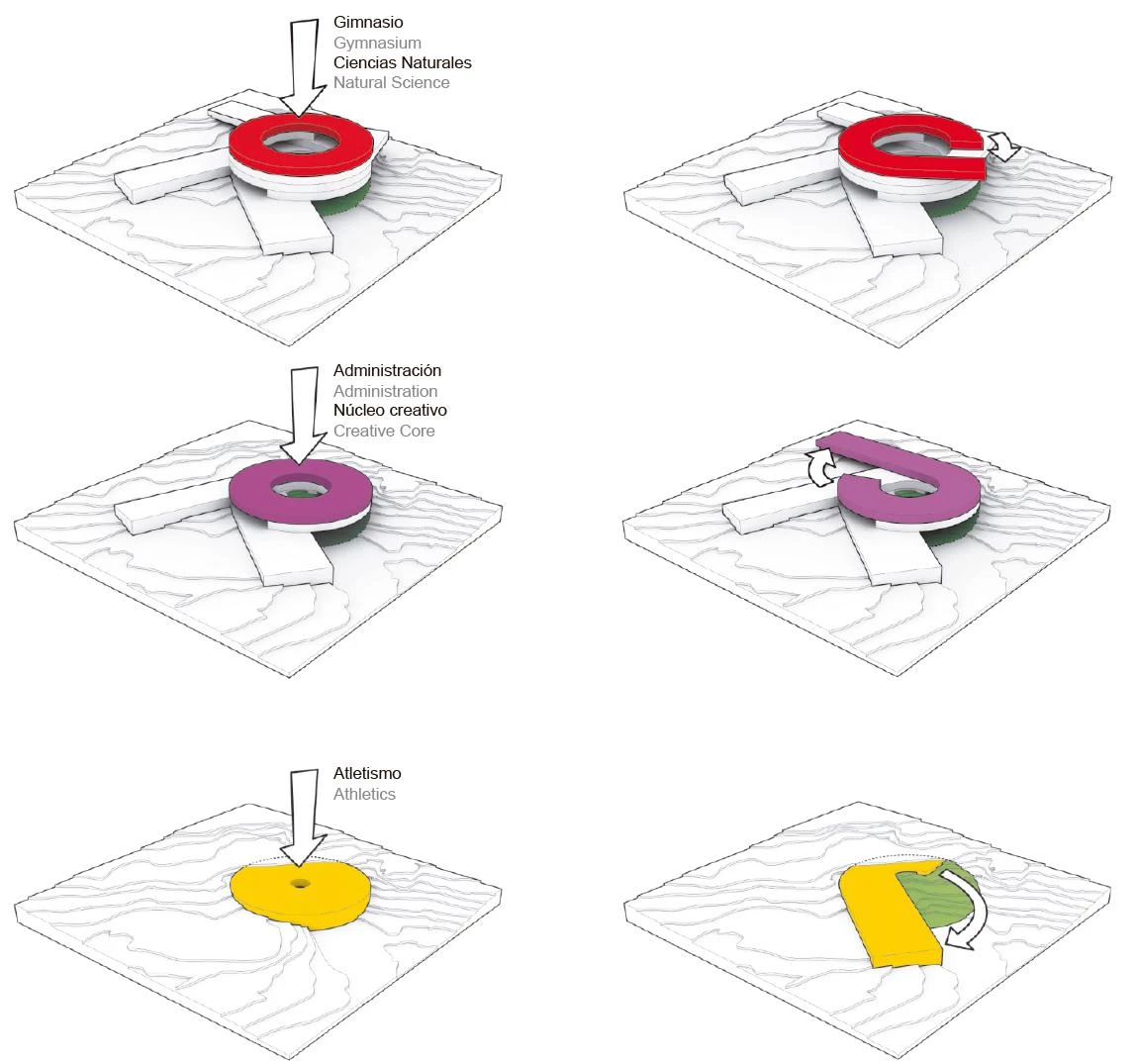 The project is designed as a vortex, radiating out towards the environment while at the same time flowing onto the school’s interior landscape. Each program is laid out on one level, curling up from the inside out. This shape permits projecting an expansion surface in case the programs are extended in the future, while maintaining their independence. The center of the volume is an open circular space that serves as a casual meeting point creating a vertical relationship between the different schools. A stepped interior space reflects the mountainous landscape of the islands with its alternating plateaus, stairwells and terraces where different social and academic activities take place.