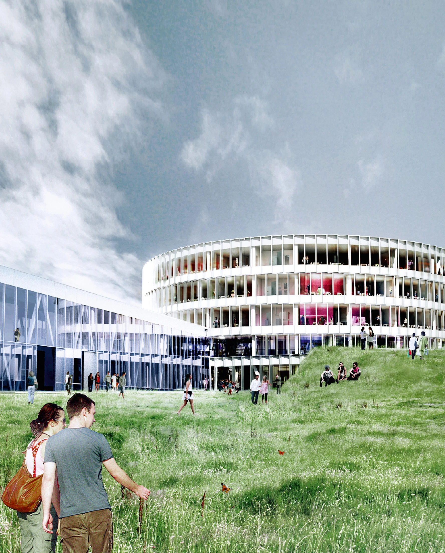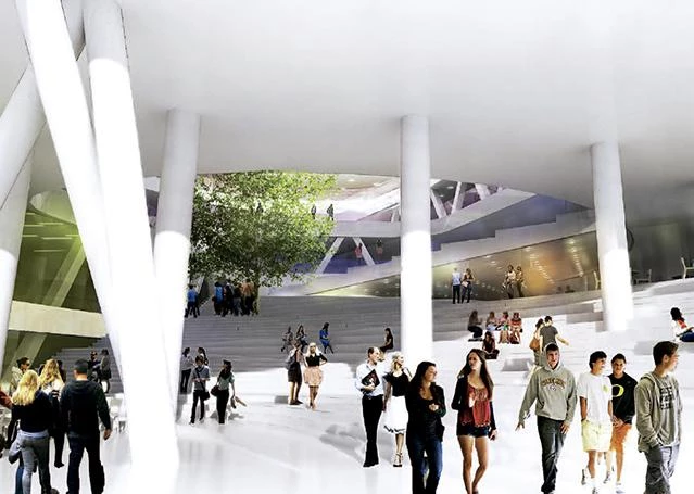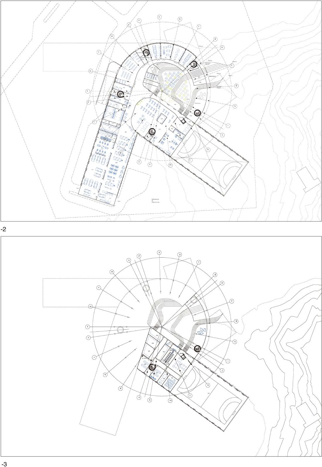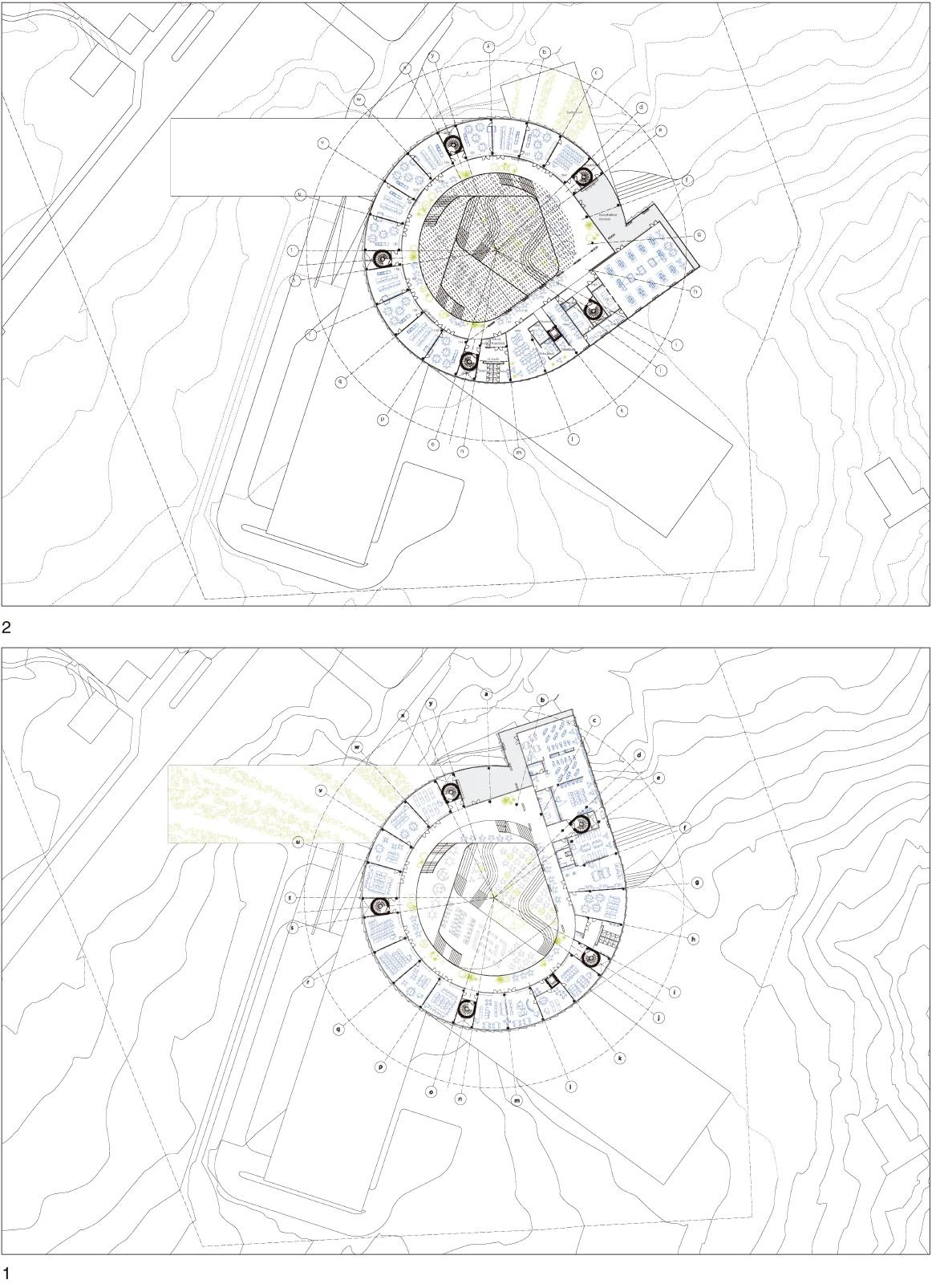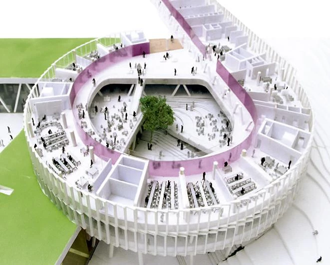 The project is designed as a vortex, radiating out towards the environment while at the same time flowing onto the school’s interior landscape. Each program is laid out on one level, curling up from the inside out. This shape permits projecting an expansion surface in case the programs are extended in the future, while maintaining their independence. The center of the volume is an open circular space that serves as a casual meeting point creating a vertical relationship between the different schools. A stepped interior space reflects the mountainous landscape of the islands with its alternating plateaus, stairwells and terraces where different social and academic activities take place.