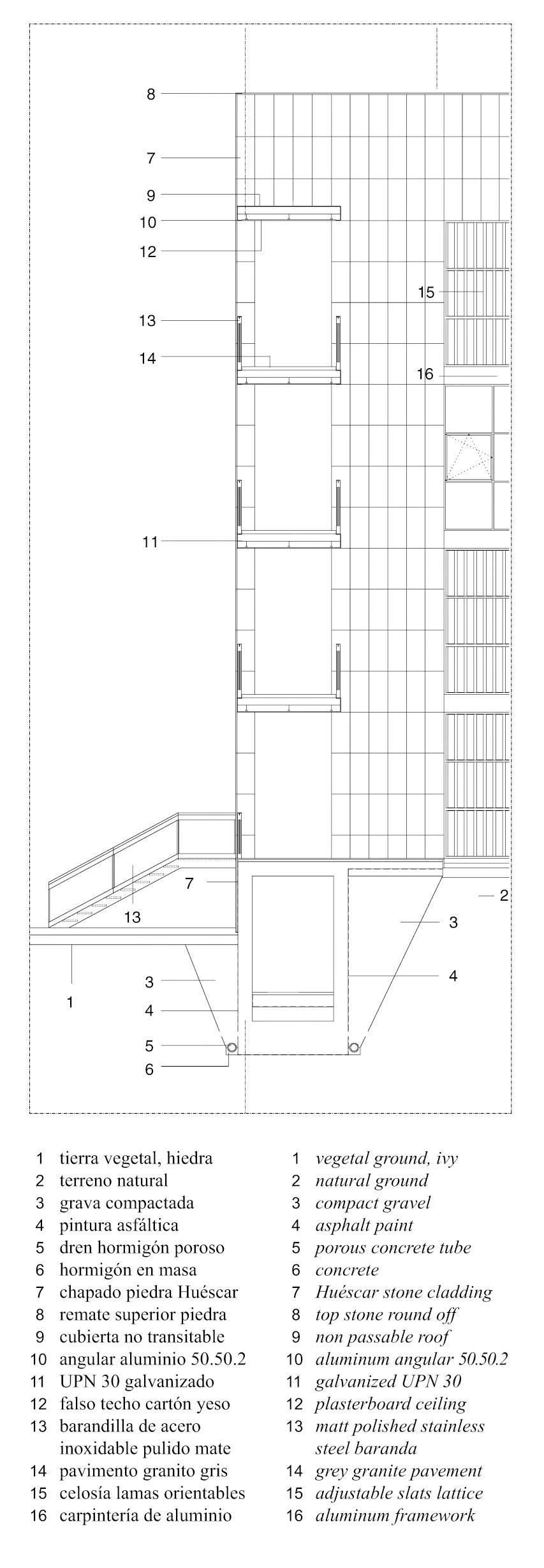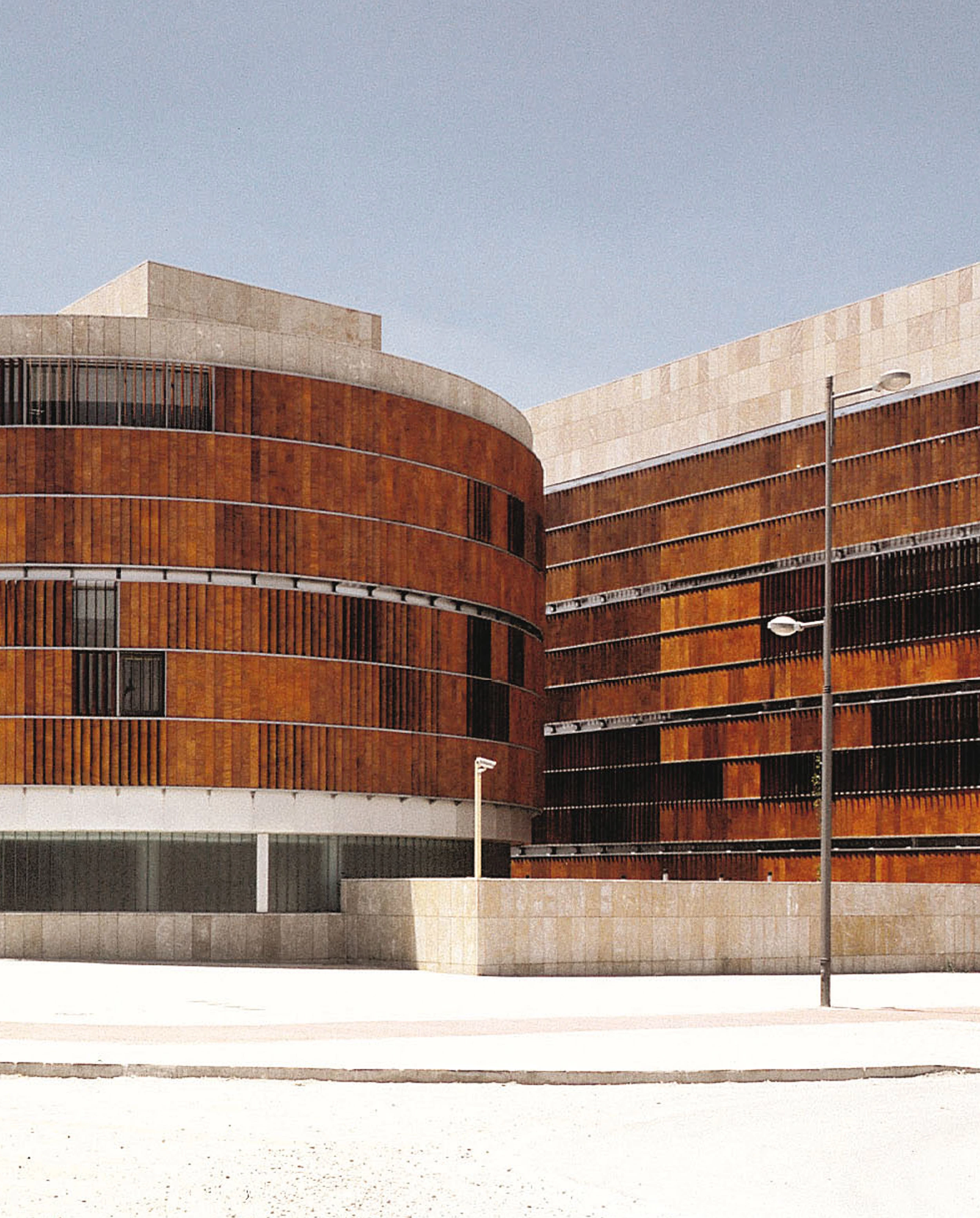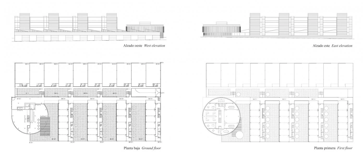 The buildings which contain the small businesses are located by the highway, acting as acoustic barrier for the remaining facilities and allowing the access of heavy vehicles. On the opposite side of the central corridor are four identical blocks that house the laboratories and offices. With an open-plan they look towards the south, where they meet the gardened courtyards in the foreground and the tops of Sierra Nevada at a distance. Stone, glass and wide latticeworks form these prisms, while a wooden box is attached to the opposite side of each block to wrap corridors, staircases and systems. A cylindrical volume of lower height stands out in the entrance of the complex and houses the management and administration offices, classrooms and common facilities. The geometric simplicity and the use of the same materials –limestone on the facades, granite on the paving, wood on the latticeworks and communication cores – allow to identify the complex as a unique entity, giving it a friendly and expressive appearance of technological building.