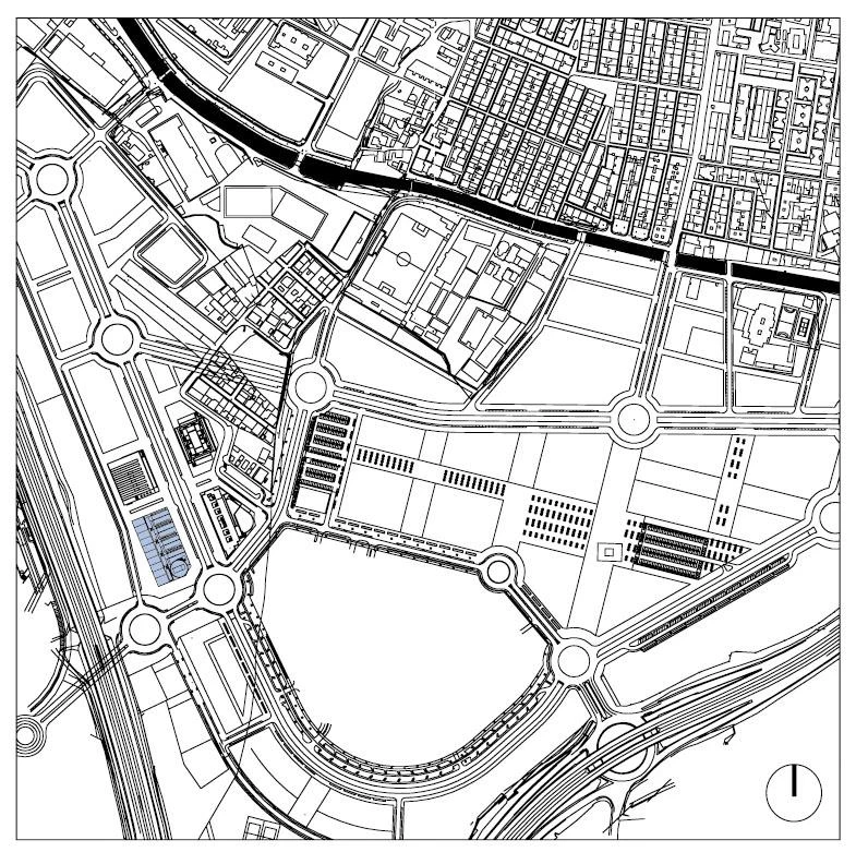 Four transversal blocks (offices and laboratories), a longitudinal bay (factories and storage sheds) and a cylindrical volume (training and management) make up, joined by an outdoor corridor, the new center.