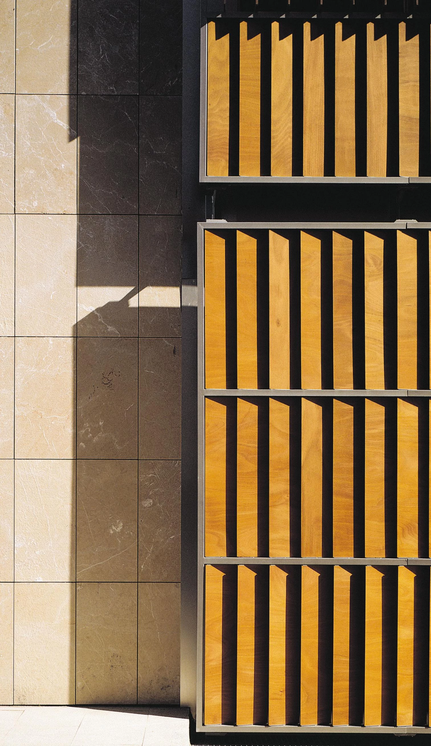 The use of different materials (limestone on the facades, wood on the latticeworks and communication cores, and stainless steel on the sheds) reflects the variety of functions that the building serves.