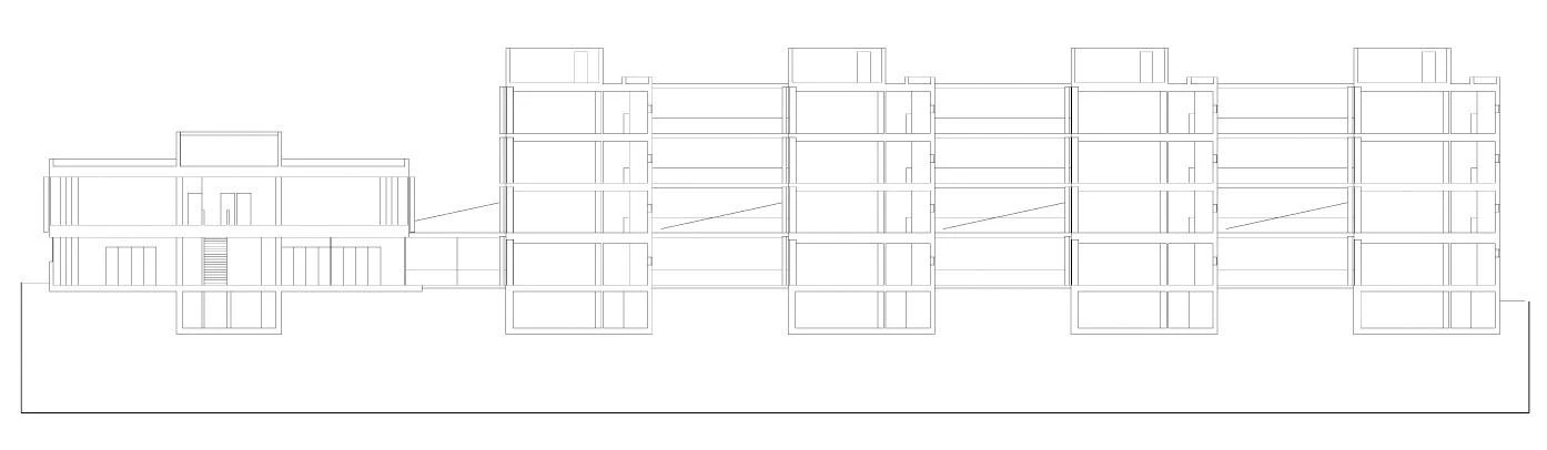 The complexity of the program, that was to include offices, laboratories and warehouses, as well as communal facilities and parking lots, lead to designing freestanding pieces articulated by an open longitudinal space that also serves as communication corridor. This scheme is repeated in height when the corridor adopts the shape of a gallery and connects the different levels. The result is a sort of small urban pattern that includes landscaped courtyards in transversal direction, and thereby, natural illumination and a blurring of the frontier between the workspaces and the outdoor leisure areas.