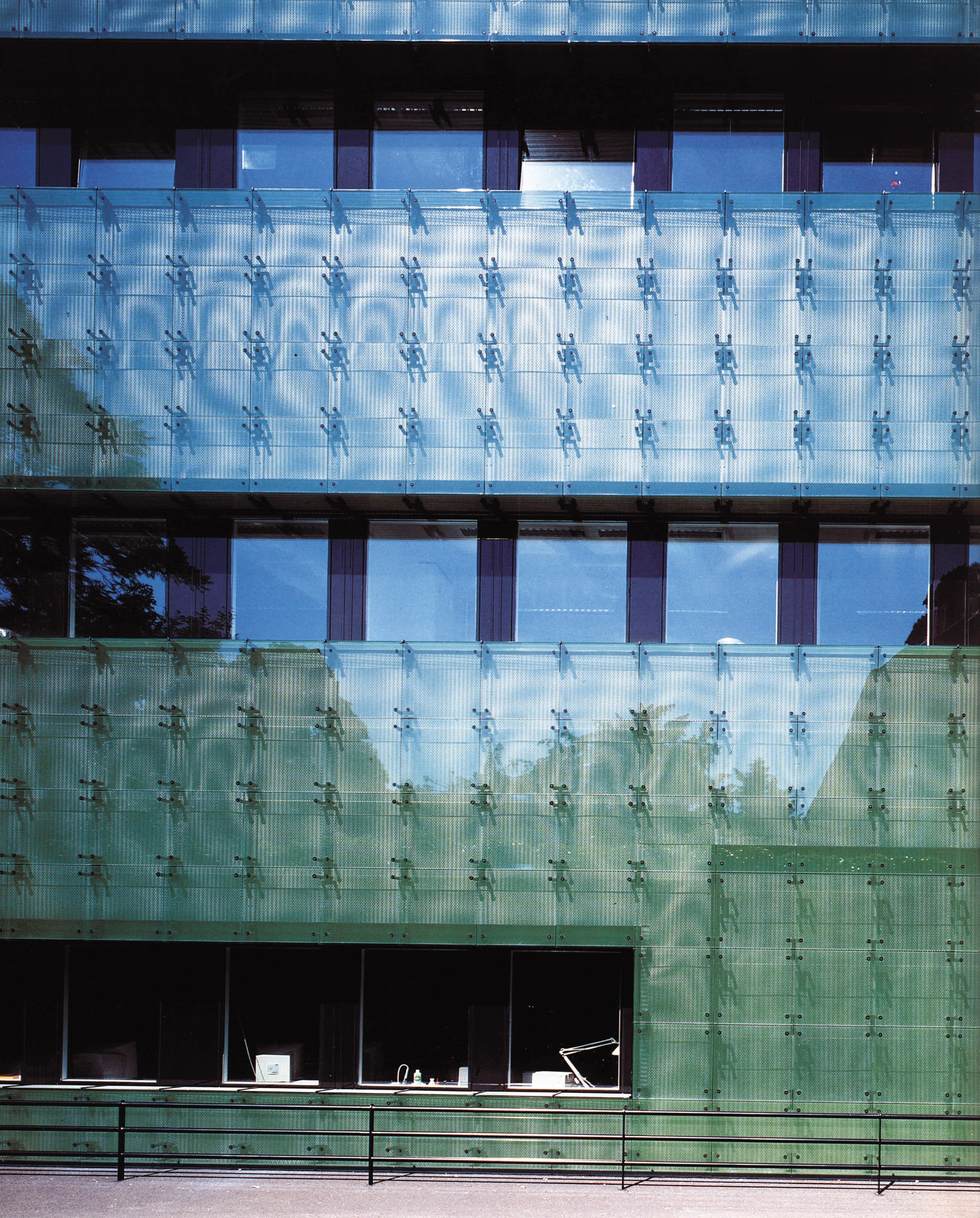 El proyecto es fruto de la búsqueda iniciada hace una década con la sede de la compañía aseguradora Suva, también en Basilea, que explora los aspectos concernientes a la definición material y conceptual del cerramiento. Esta vez, el volumen resultante —una mera extrusión de las incidencias de la planta— aparece definido por un halo de vidrio serigrafiado con puntos verdes, separado unos treinta centímetros de la chapa perforada que oculta el aislante térmico. La superposición de las tramas de puntos de ambas capas provoca un efecto moaré que desmaterializa el contorno y disminuye ópticamente el tamaño del edificio. Los elementos de sujeción de las piezas de vidrio —espaciados con una regularidad que responde al despiece cuadrado— forman con sus sombras una retícula de mayor escala que subraya la profundidad del cerramiento. Sensible a las condiciones cambiantes de luz, esta piel camaleónica puede presentarse como una barrera sólida e impenetrable que refleja los árboles del entorno, o bien como un filtro etéreo que revela sus capas interiores. El vidrio serigrafiado pierde aquí la función que este material ha desempeñado tradicionalmente como parte del muro cortina para enriquecer con efectos ópticos el cerramiento opaco. Los huecos que realmente conectan el interior con el exterior se recortan en esta superficie, poniendo de manifiesto su espesor. Este tratamiento homogéneo del perímetro encuentra su única excepción en el paño de fachada que indica la entrada desde la calle. En este punto, la tersura vidriada se sustituye por plantas trepadoras que se superponen con la hiedra artificial suspendida de la comisa. Síntesis de naturaleza y artificio, la envolvente del edificio alude así de forma explícita al origen vegetal de muchos medicamentos, pero asumiendo los procesos químicos que dominan actualmente su producción.