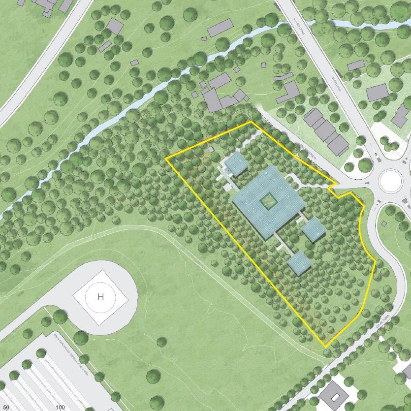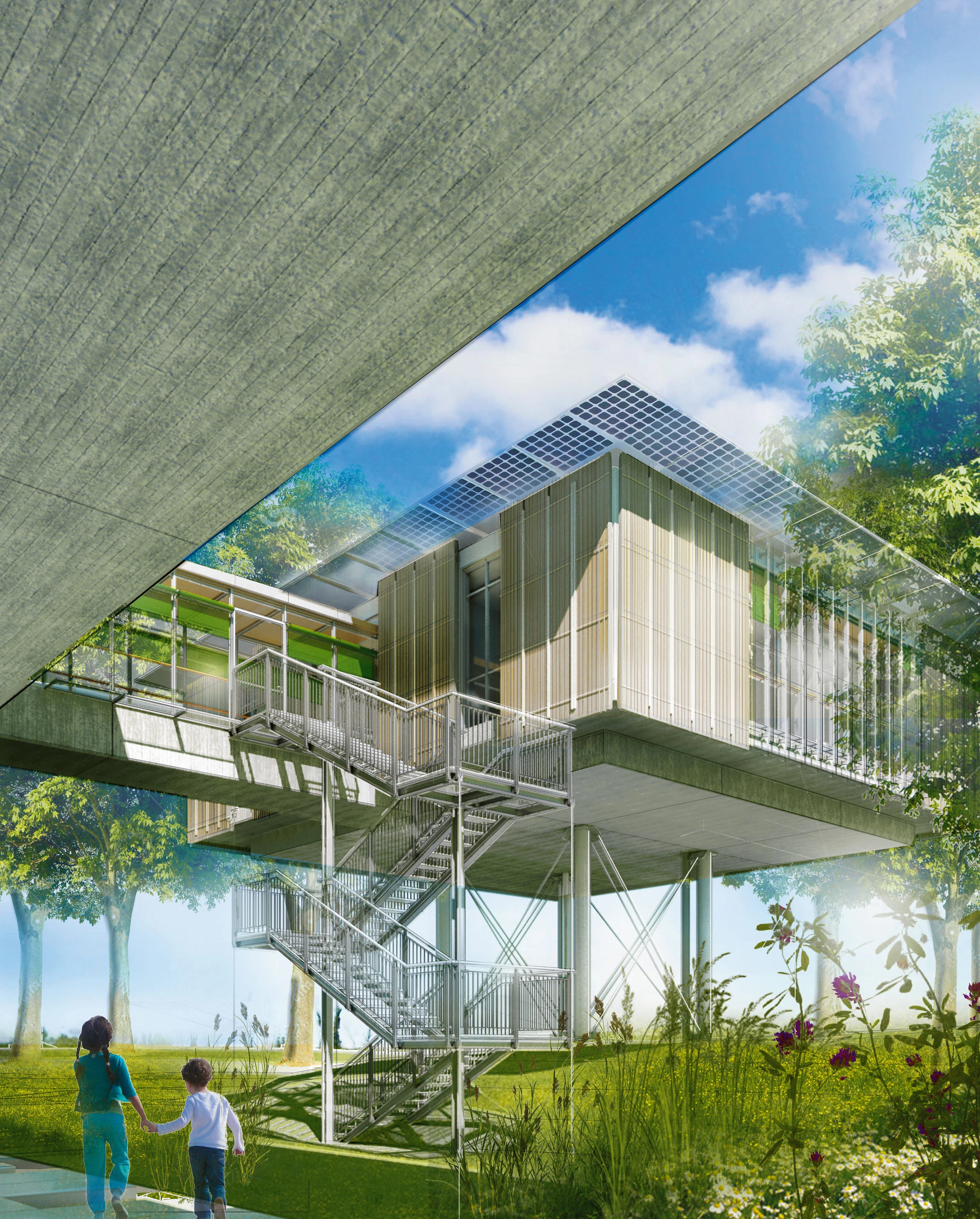 The seed of the project was the idea of a building rising from the ground to create the picture of children – leading characters here – living in a bright, cheerful space set in mid-air, as if on treetops. The idea of ‘lifting’ is closely associated with that of ‘helping’ – the alleviation of pain – and the metaphor perfectly fits the program of an institution devoted to providing palliative care: a place whose mission is to give relief to sick children and their loved ones. The surrounding natural environment only reinforces it: the trees and the garden areas have a very important presence in the project.
