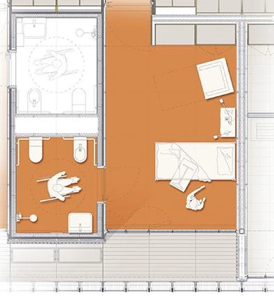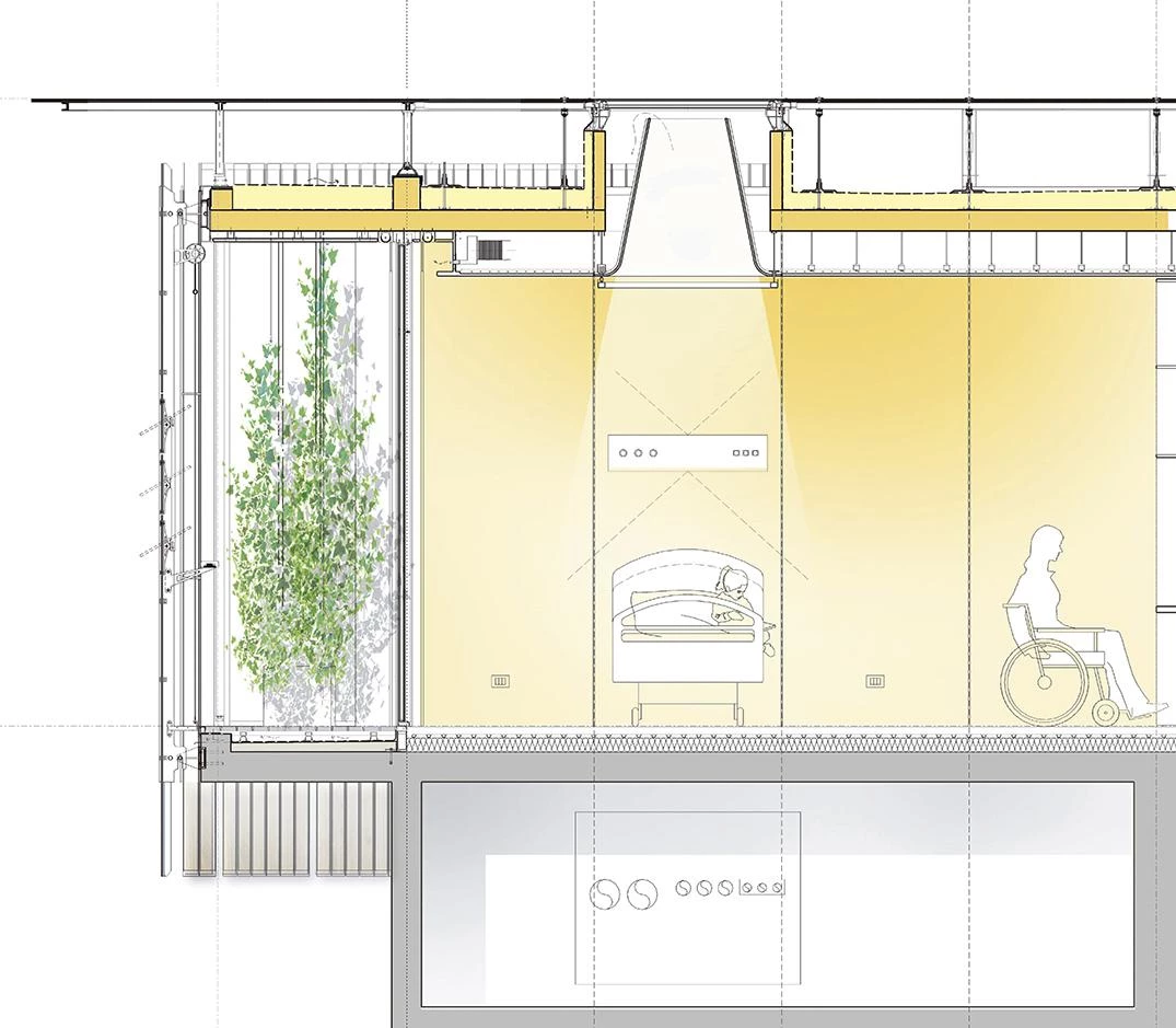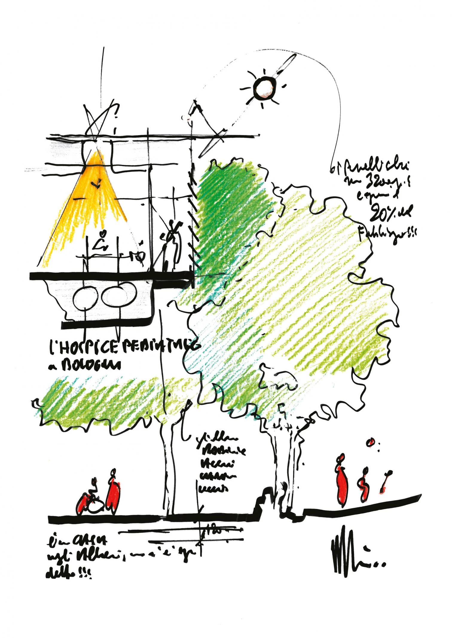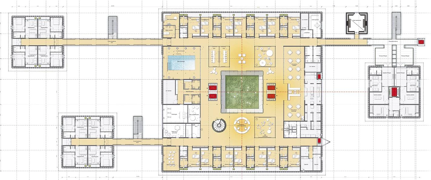 The building presents three pavilions connected to a main block in the middle, which takes the form of a courtyard-garden. The two satellites to the south contain eight apartments for the families of the youngest patients, while those on the other side provide the most delicate, most spiritual parts of the program: a chapel or meditation space, and a terrace with views over the Savena Valley, connected to a funeral parlor.