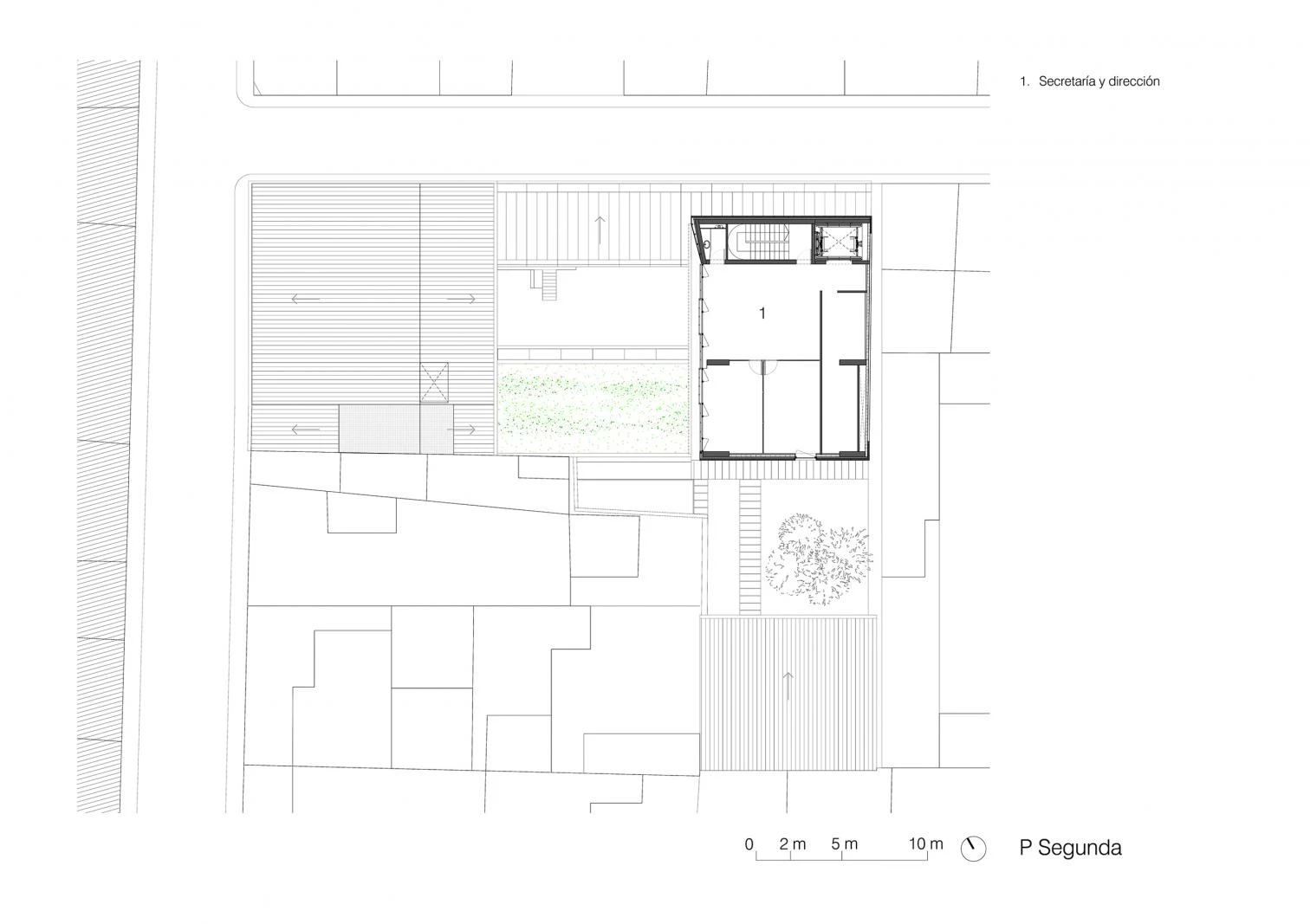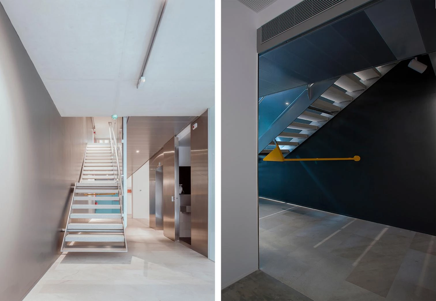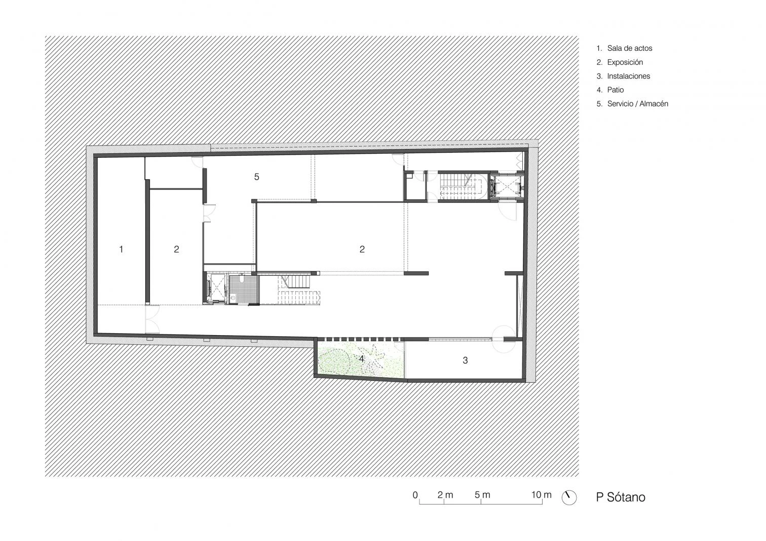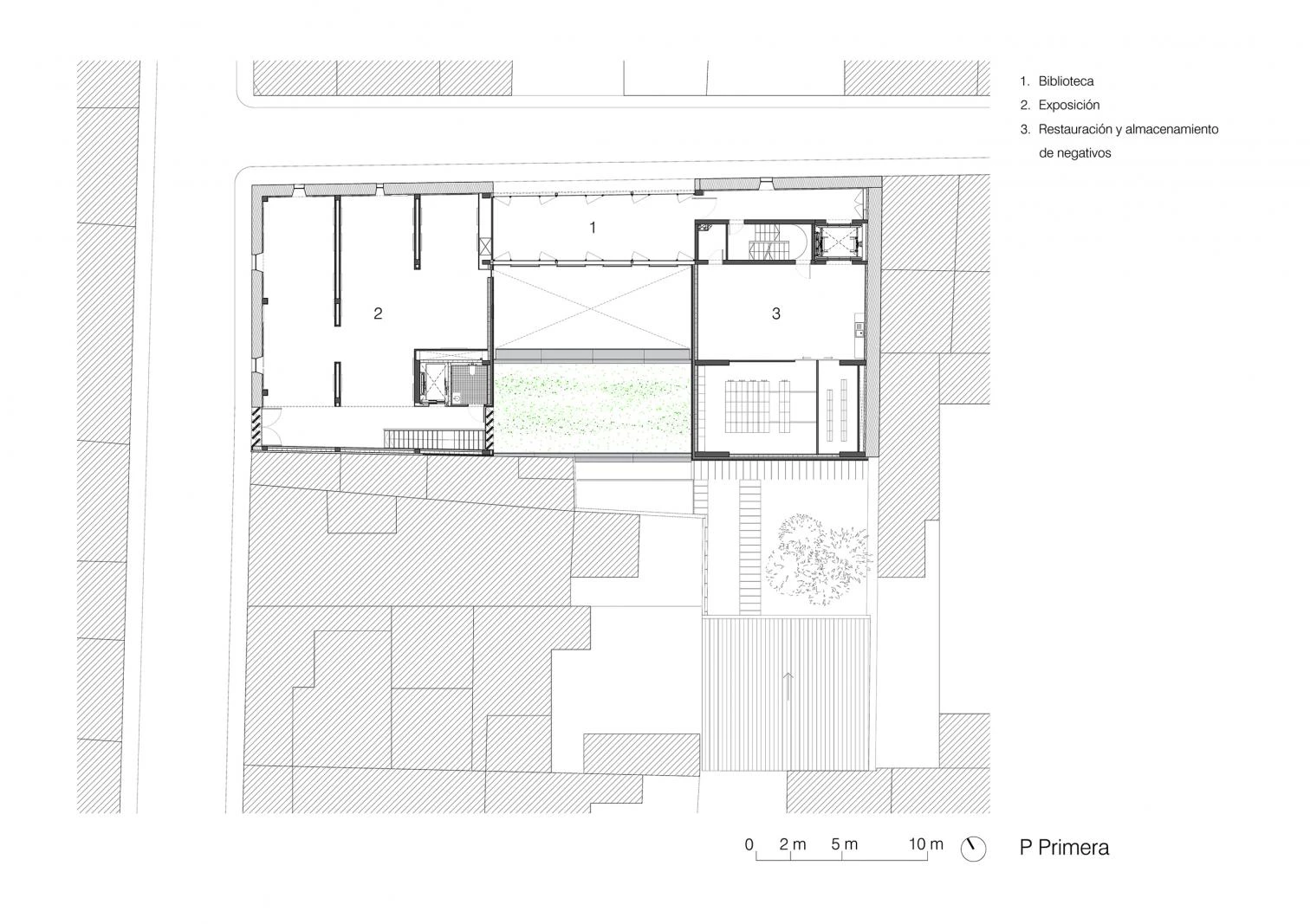 All the spaces that make up the center are articulated around a large central courtyard that welcomes visitors and organizes the different uses of the program. The exhibition areas, for Catany’s work and for other temporary shows, are laid out in the basement, ground, and first floors. The library is on the central courtyard, like a bridge connecting the two parts of the building. Next to it are the archives, with a dark area that offers optimum conditions for the preservation of photographic material. The upper floor accommodates management and administration areas.