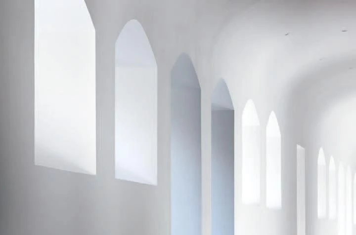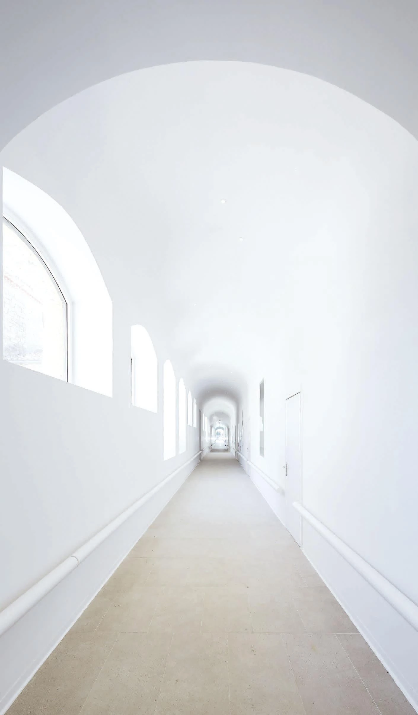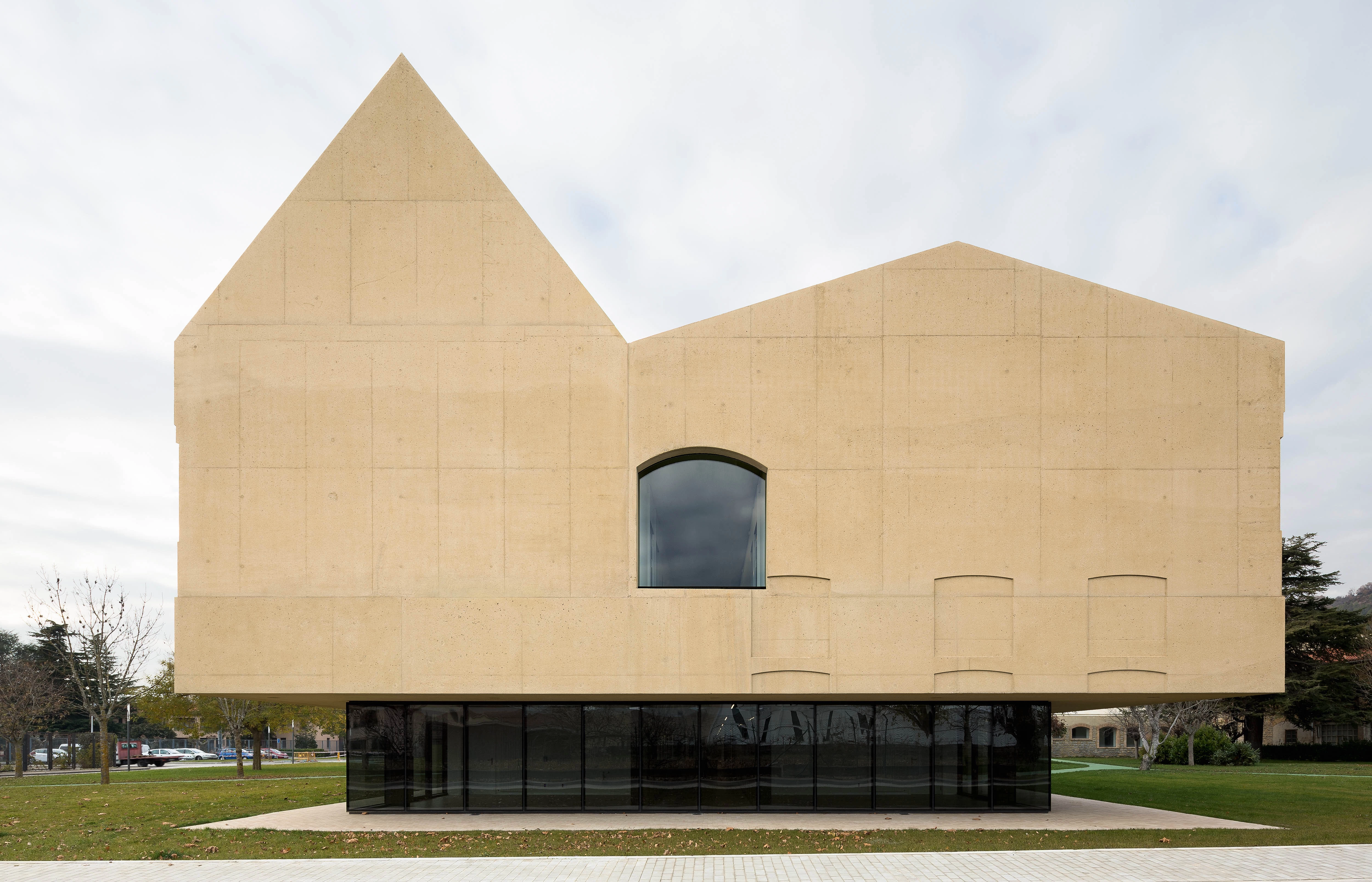 The completed phase includes the transformation of the southeast wing, where the two large volumes added soundly articulate the dialogue between the old and the new. The sharp profile of the two new buildings responds to the desire to blend with the surroundings and to abstractly reinterpret the pitched building archetype, offering a formal and lyrical synthesis of the existing architecture. The project is materialized as a critical reflection on memory and time, and in this sense, the concrete used to complete the enclosure is dyed in the color of the mortar that joins the brick and the stone in the adjoining historic buildings. Depending on orientation and wind strength, the new facades are also expected to darken gradually until mimicking the old ones. Furthermore, the elevations recover the arched motif of the windows in the old pavilions, which are recorded on the material and form a rhythmic and hermetic palimpsest. This pattern provides a homogeneous backdrop, perforated however by windows that break the monotony and hint at the distribution and uses of the rooms.