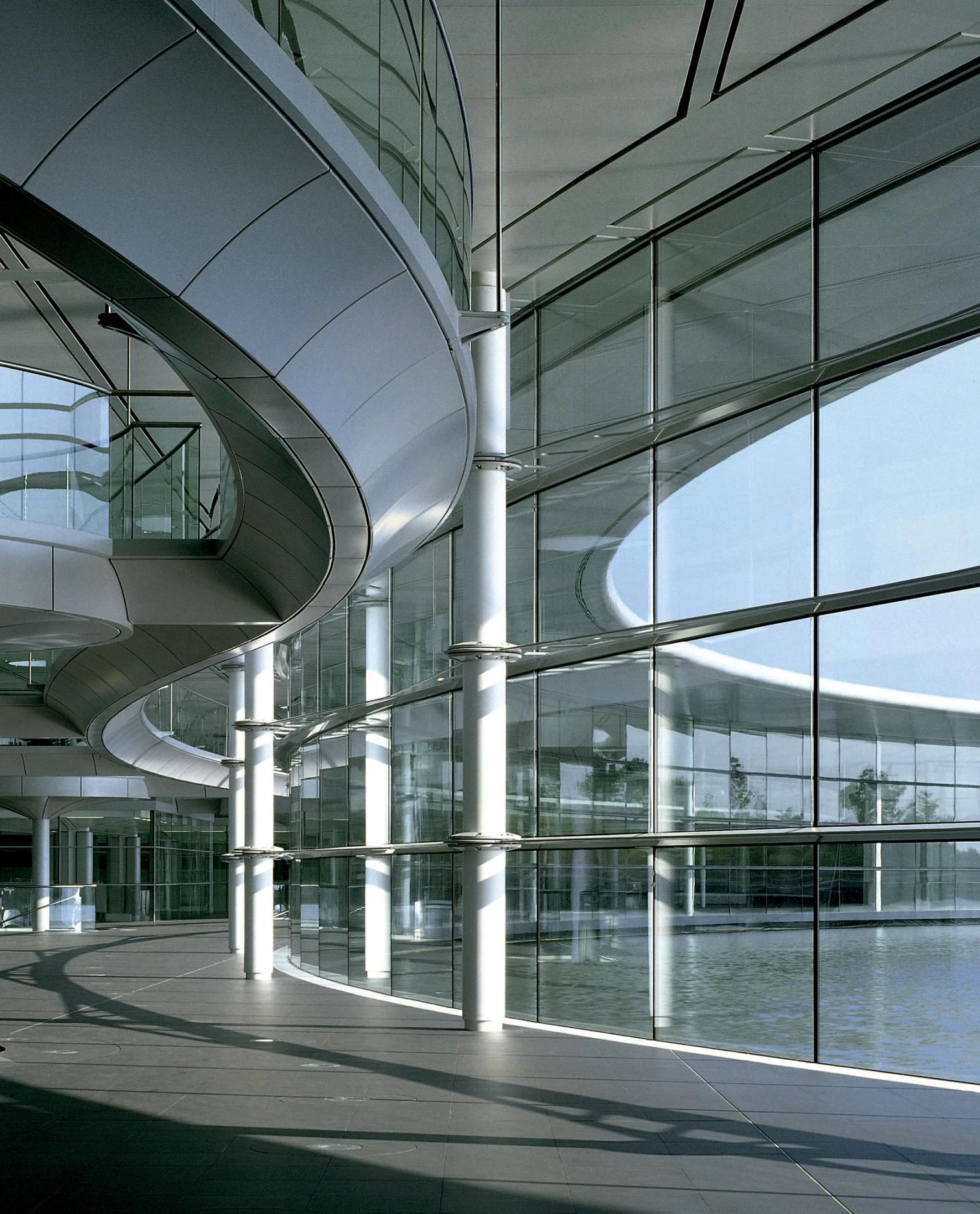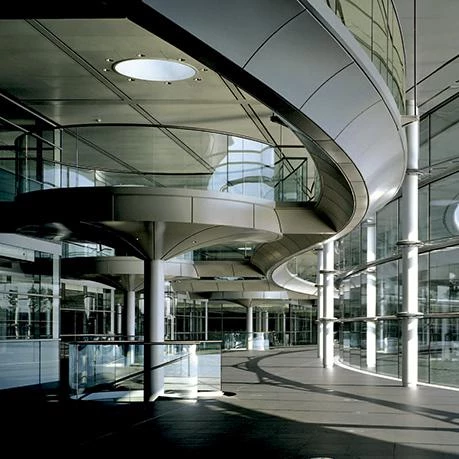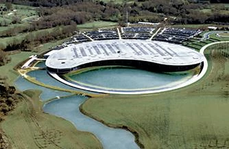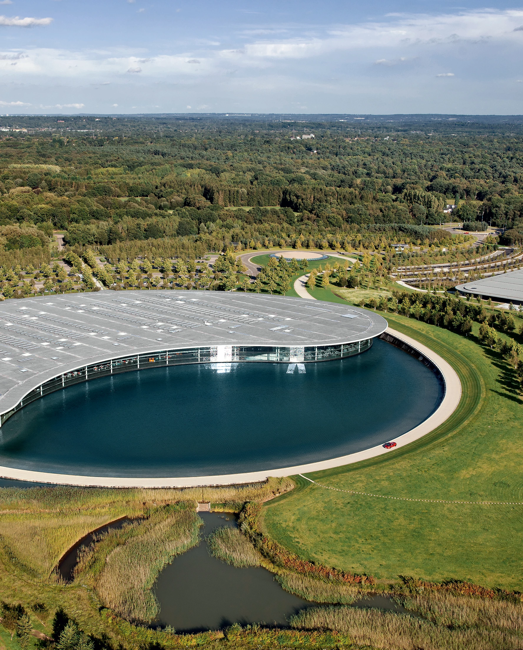 Designed to reflect the company’s design and engineering expertise, the Technology Centre provides a headquarters for the group, including design studios, laboratories and testing and production facilities for Formula One and high-performance sports cars. Viewed on plan, the building is roughly semi-circular; the circle being completed by a lake, which forms an integral part of the building’s cooling system.