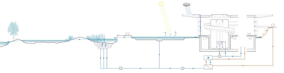 Although it provides 32,000-square-metres of accommodation, over two floors, the building is dug discreetly into the landscape to minimise its physical presence. A Visitor Centre with educational facilities is located in a separate building at the entrance to the complex. This two-storey structure is also buried underground. It houses an exhibition space and lecture theatre and is reached via a subterranean link.