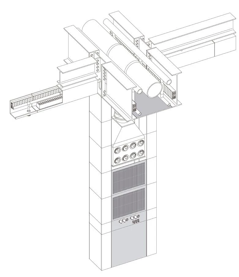 The two buildings are connected by a subterranean walkway, lined with interactive exhibition spaces. Sharing a common language of details and materials, the new building is clad in aluminium tubes, the rounded corners of its rectilinear plan reference the curves of the Technology Centre and the entrance, echoing the existing building, is a circular glass drum beneath the overhang of the roof canopy. The linear arrangement of the two-storey structure mirrors the flow of the production line.