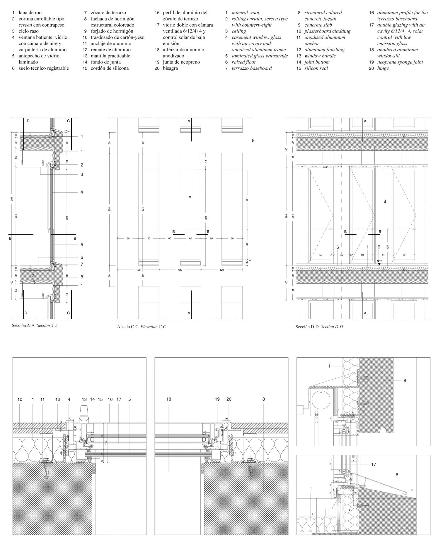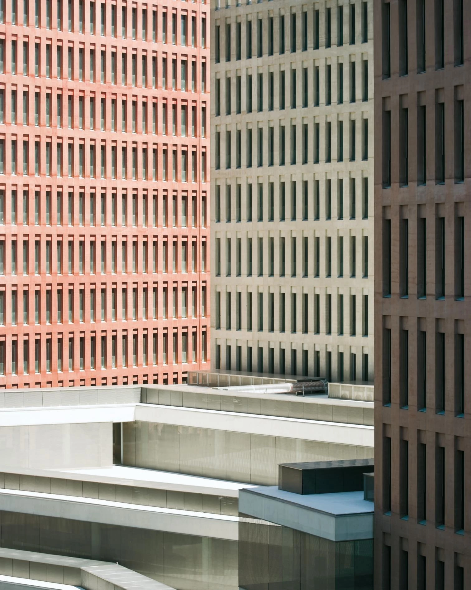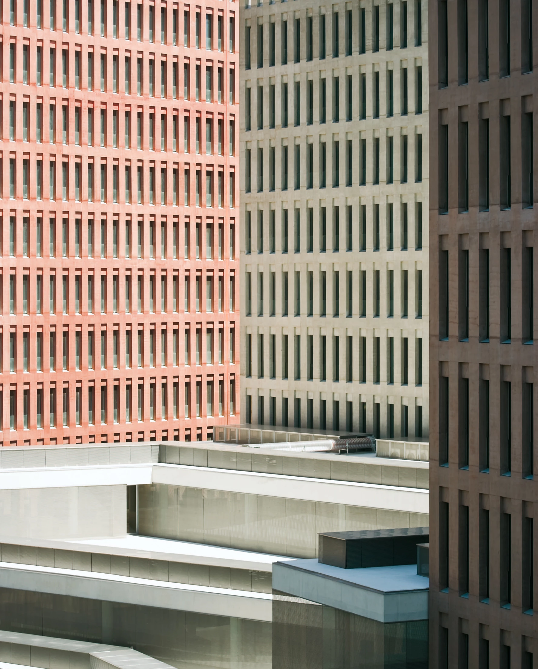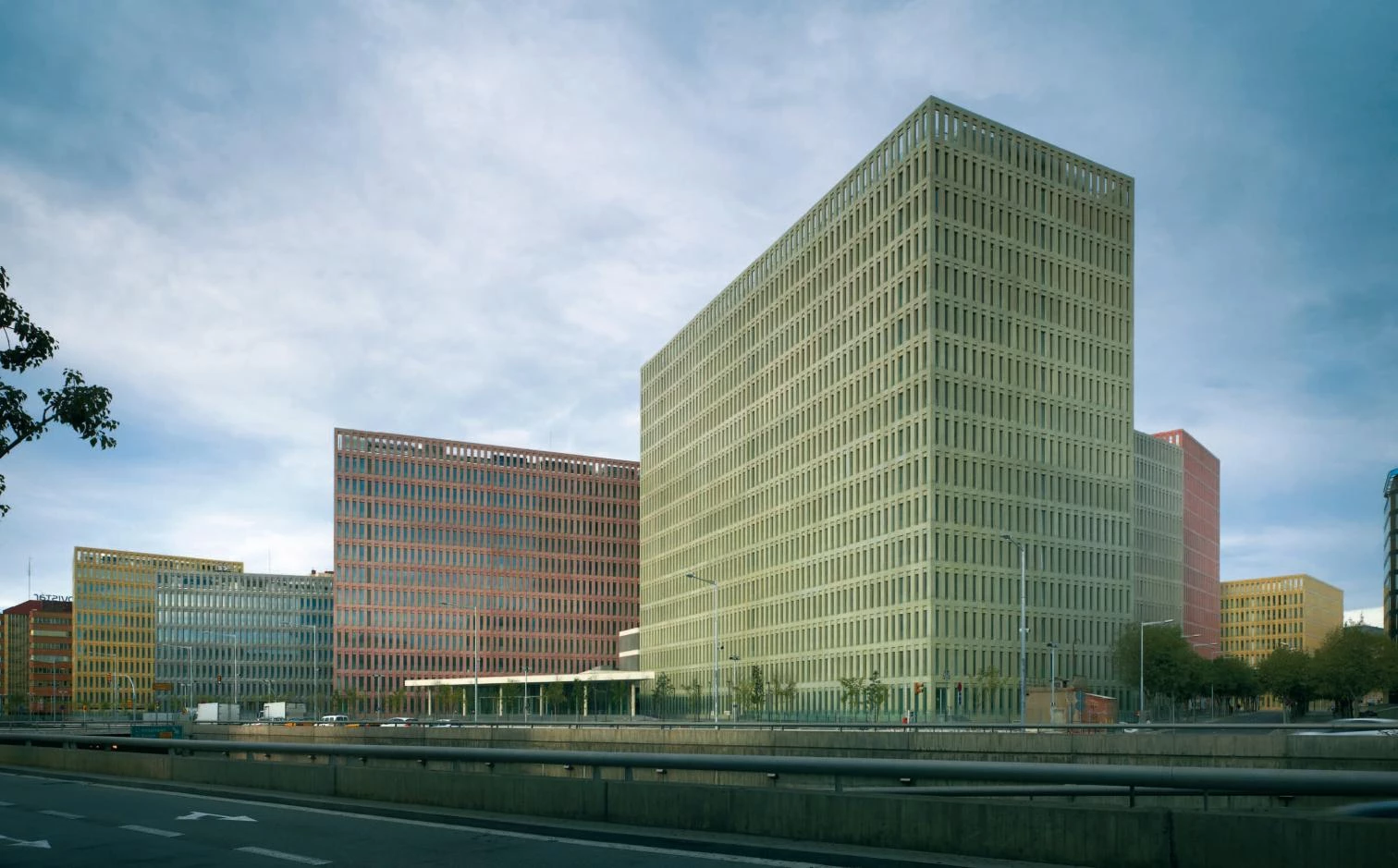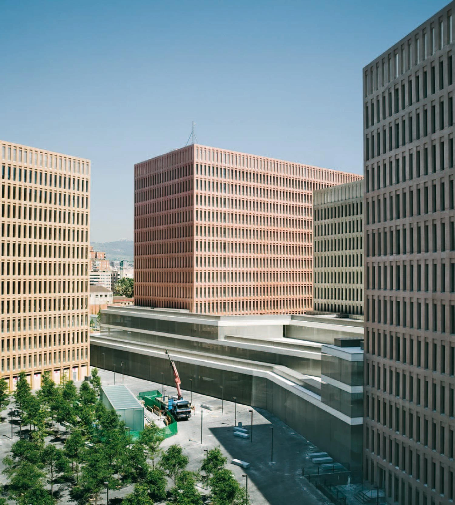 Four other independent buildings comprise a judicial services building for L’Hospitalet, a forensic sciences building, and two commercial buildings with retail facilities at ground floor. A further building is planned to contain both residential and commercial retail activities. All eight buildings are conceived as formally restrained blocks with load bearing coloured concrete ‘cage’ facades. Each building has a different and contrasting, although muted, color tone. The concourse building has a more free form plan with deep exposed concrete slabs and woven mesh screens in front of frameless glazing.