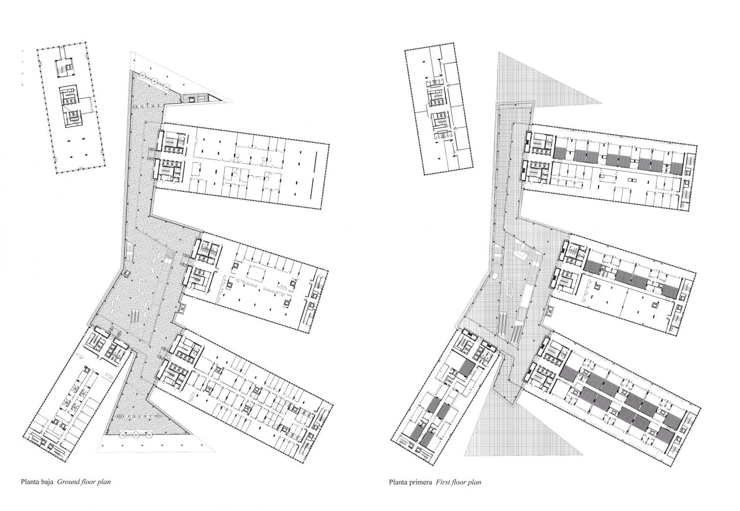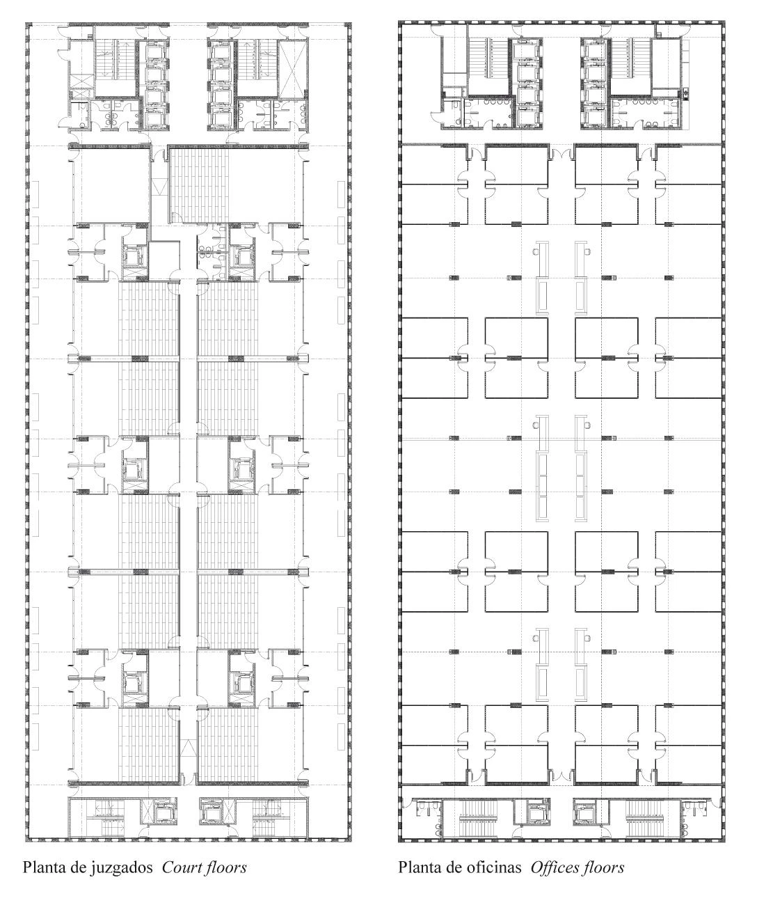 The principal proposition of the project breaks down the massive programme into a series of separate but interrelated blocks on a public plaza, giving a spatial composition that attempts to break the rigid and monolithic image of justice. The proposal also attempts to provide equilibrium to the relationships between the different working areas, public areas and landscape. A group of four large judicial buildings are situated around the perimeter of a four-storey high linking concourse building. All of these floors are accessed directly from the concourse building which acts as a filter. The concourse building also gathers people at the start and completion of their judicial visit within a central public room, which overlooks the exterior plaza.