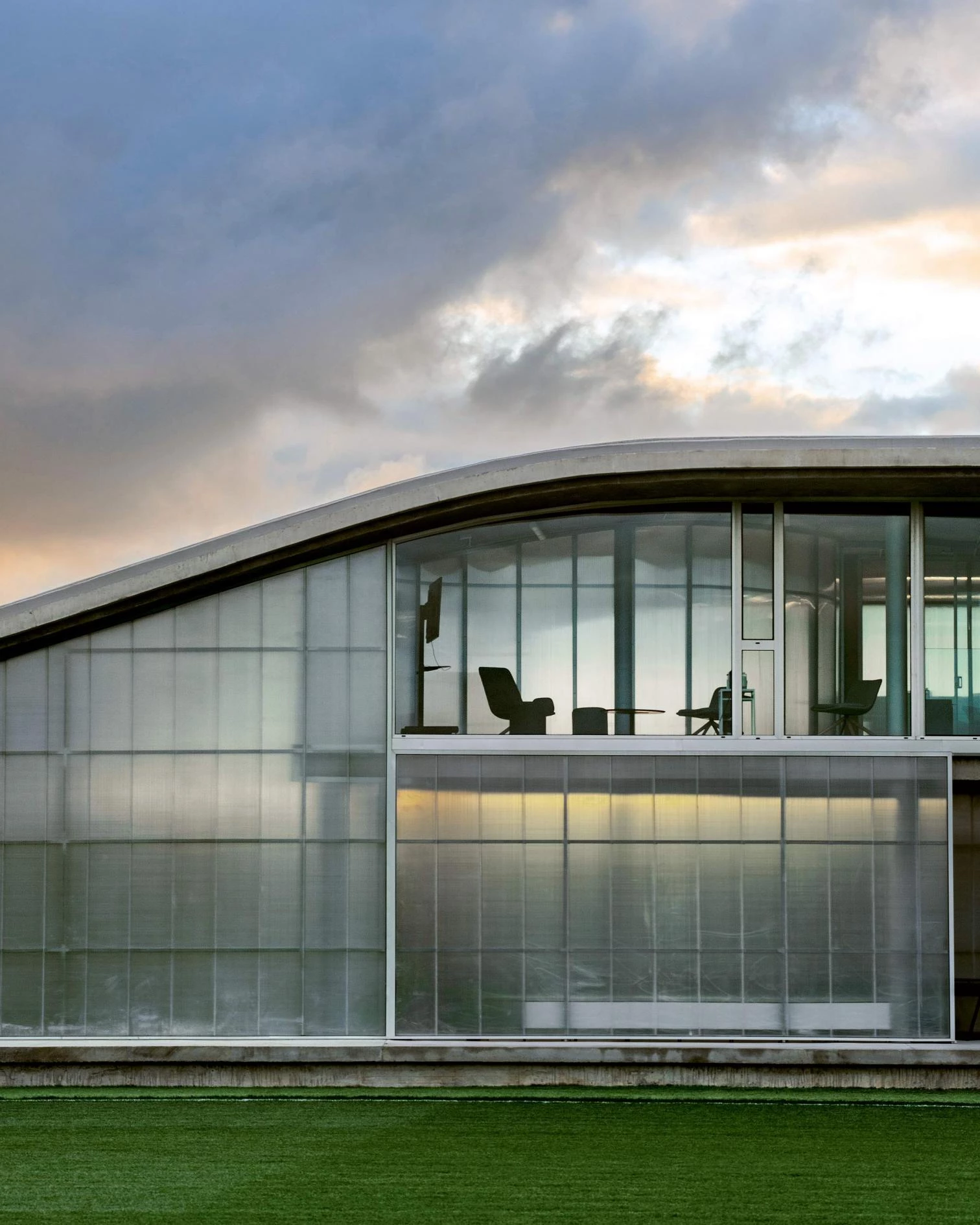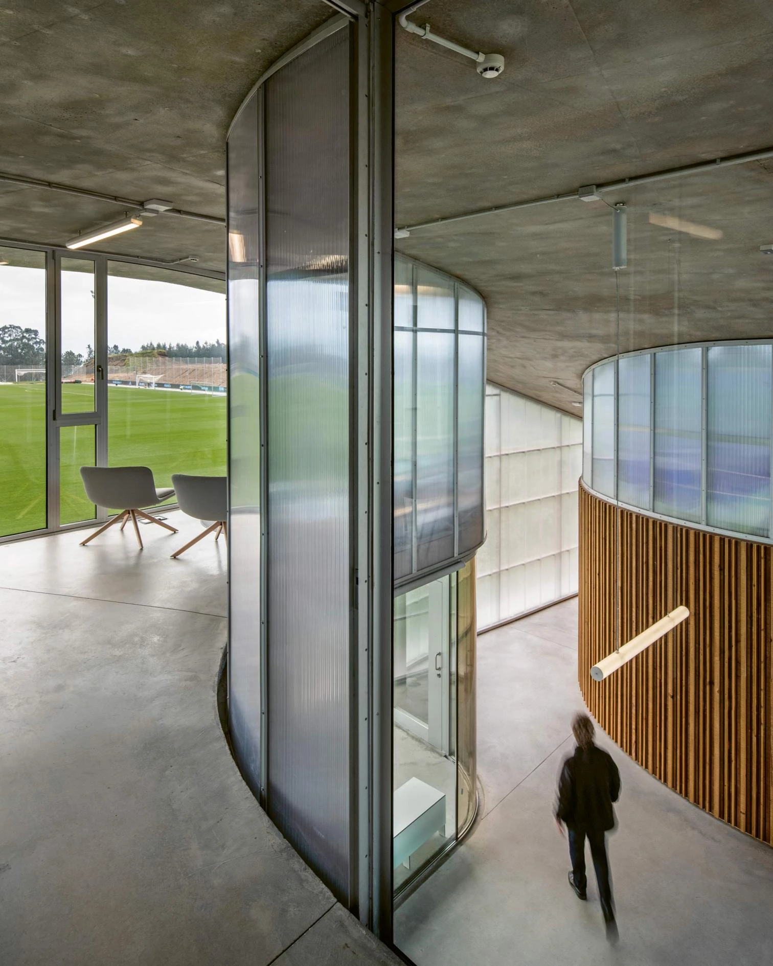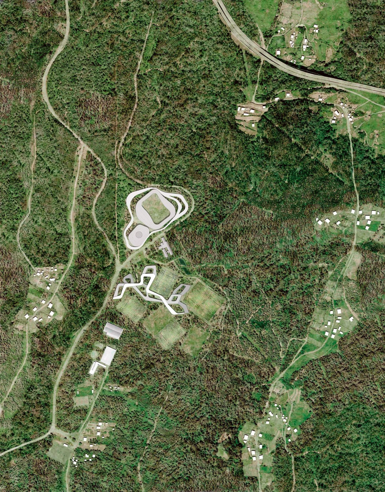 Football fields and training facilities are now part of the landscape of forests, prairies, and crops. The project aims to blend into the landscape, generating steps to extend the forest that in turn offers the scale for the different spaces, recovering the green trees, heathers, and gorses that make the building autonomous and sustainable. The objective is to achieve an architecture that is complete and coherent – like the city – already from its first buildings adapted to the place and independently from the size of each piece or of its programmatic complexity. In this way, the architecture proposed is the result of the grouping of specialized components in a complex connected by semi-climatized and intermediate spaces that respond to one desire: that of favoring the encounter with nature through the diversity of atmospheres and rhythms of life. Three atmospheres address the different possibilities that the rural environment offers, which are built with three materials in accordance with their character: introverted wood-filled spaces for indoor activities; translucid bubble-spaces that favor an outdoor-like experience; and ‘semi-climatized’ air to offer a total immersion in nature, its seasons, and scale.