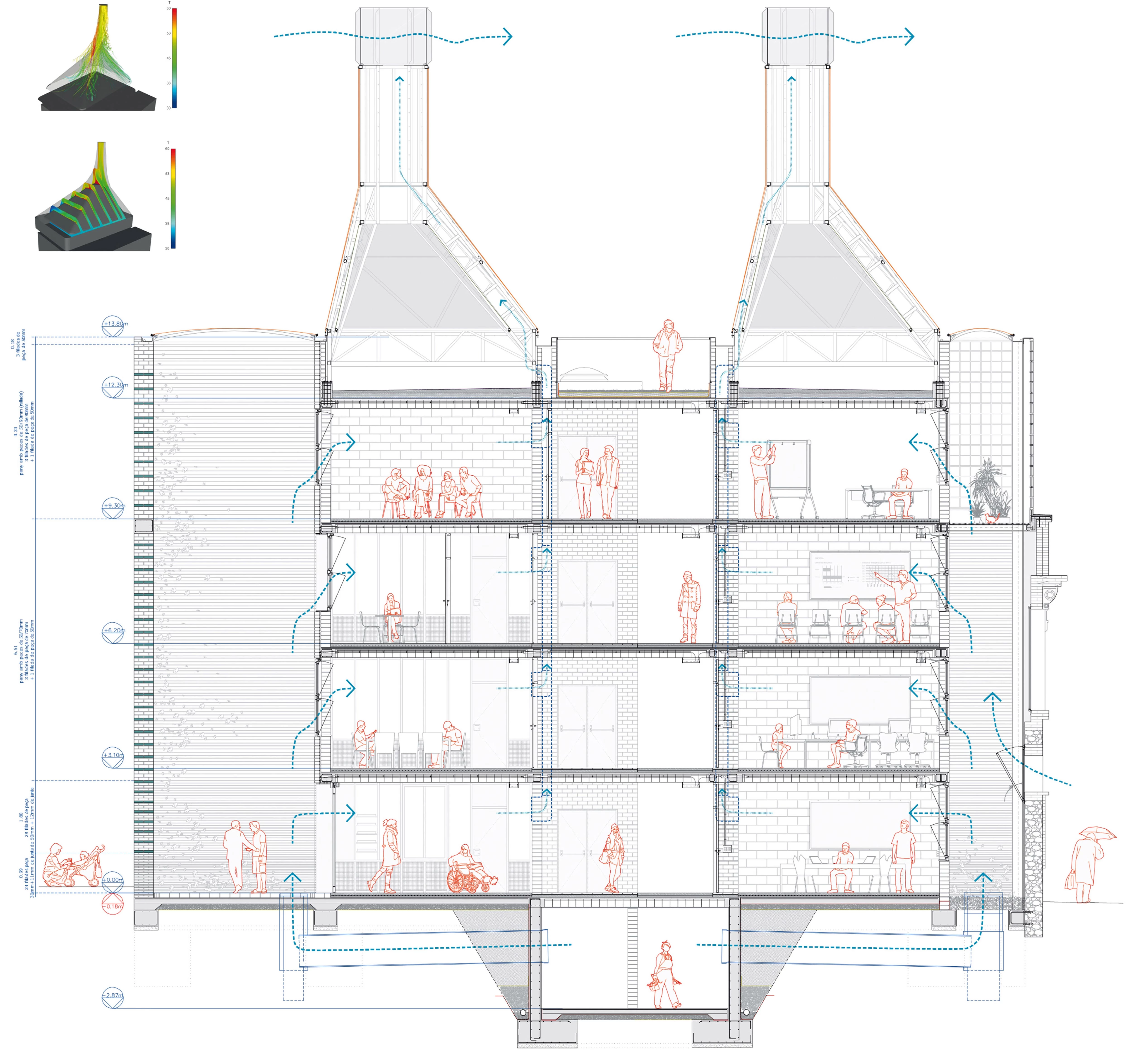 The building section shows how it manages the air under natural conditions. In winter, it is necessary to control heat loss due to air renewal, redeem the heavy internal load built up due to the inertia of the wall structure, and draw fresh air in from the atrium, which thus acts as a natural air recycler. In summer, heat has to be dissipated by moving the largest possible volume of air and fresh air must be strictly natural, based on solar chimneys and caps that apply the Venturi effect. Cross-ventilation between the courtyards is ruled out by the programme and the need to avoid conflicting noises. The building therefore gives each strip of usage space a long structural break where the air circulates vertically, ‘pulled upwards’ by the power of the sun in the chimneys, which also give the building a silhouette and a distinctive, transparent materiality.