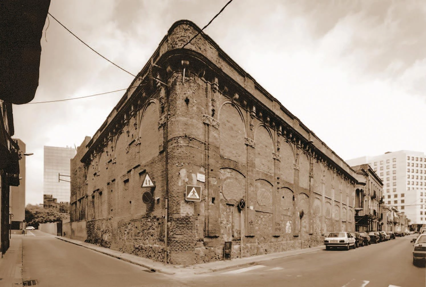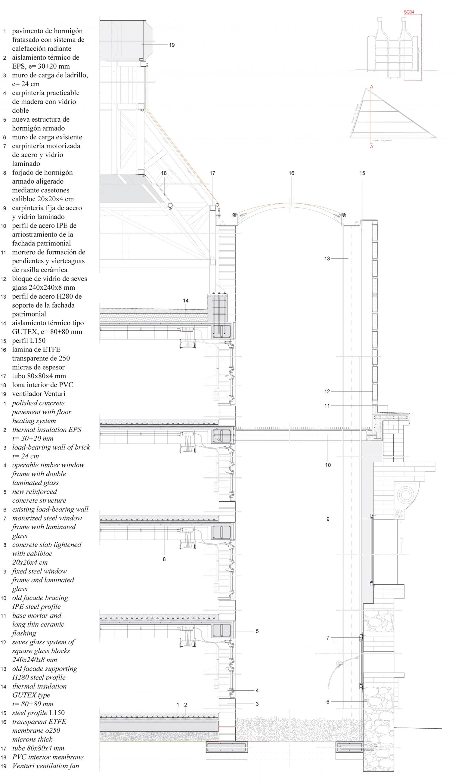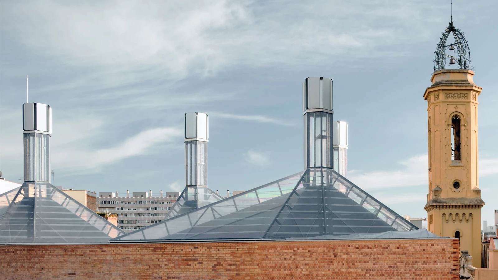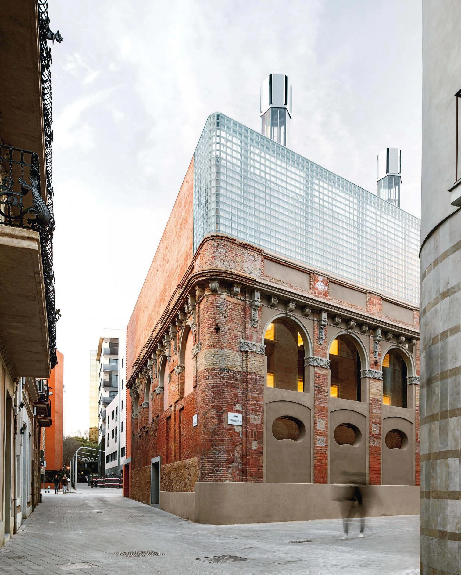 This public facility houses an adult education center, a language standardization consortium, and a hotel on a triangular plot in the Les Corts district. Two of the three sides of the site are defined by the heritage-listed frontage of the former Planell glass factory, built on Calle Anglesola in 1913.