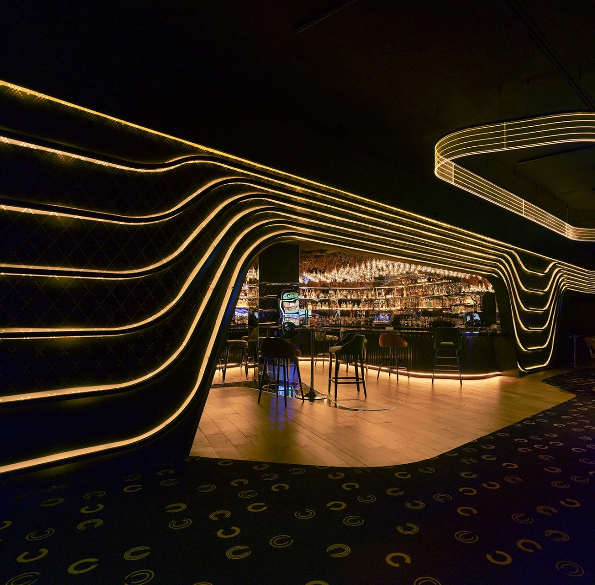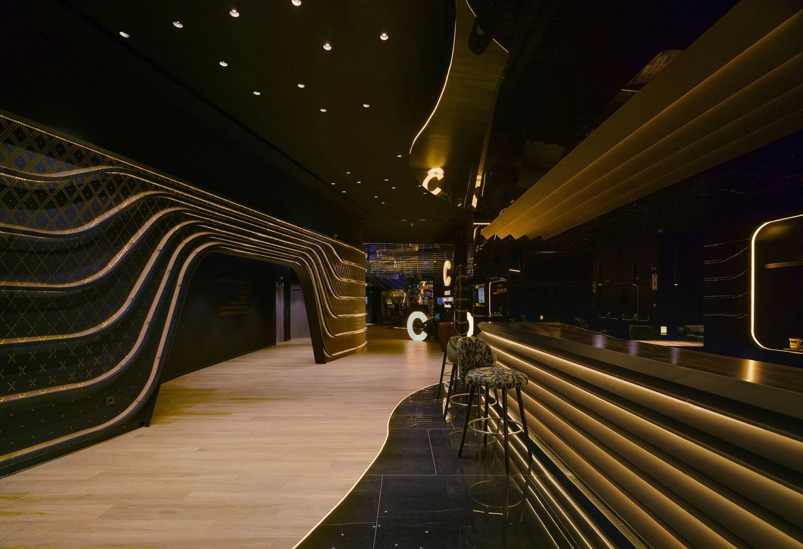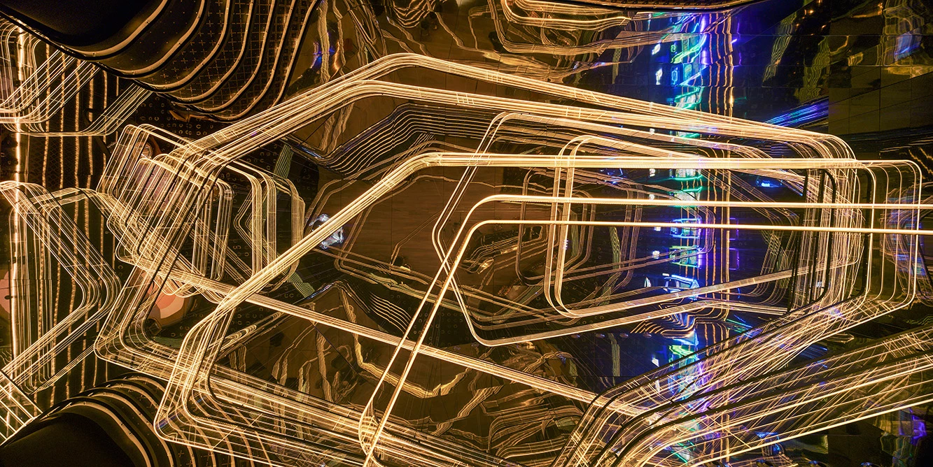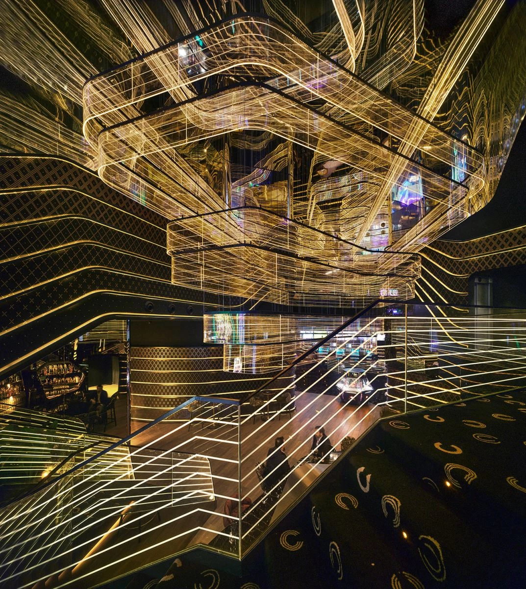 The transformation of the four-height atrium, which structures the building, breaks the preexisting symmetry, forming a central space with a play of curvilinear lights and reflections on mirror surfaces. It is here that a huge lamp, over 7 meters high, snakes its way like a cascade of illuminated methacrylate rings. The flowing circuit of light embraces the leisure areas as well as the restaurant and the terrace.