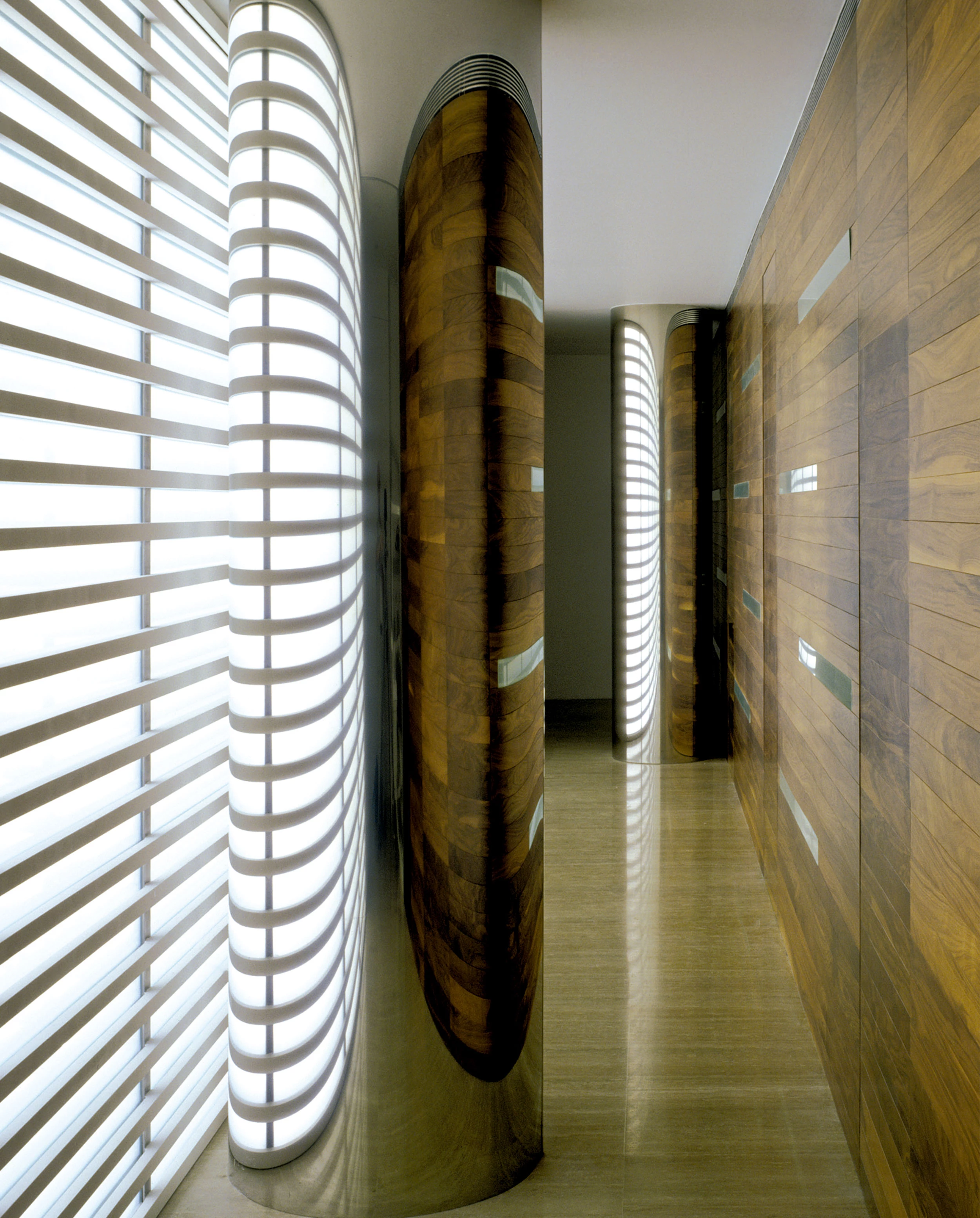 Dicho espacio intersticial requiere de la tensión y el movimiento que proporciona la luz, único elemento interesante del contexto, frente al que la clínica se protege con una coraza metálica oportunamente rasgada para convertirse en filtro solar. Fruto de la continuidad material de esta superficie —aluminio— y de su carácter opaco, la imagen exterior es abstracta. Pero en el interior esa neutralidad encontrará el necesario contrapunto mediante la elección de los materiales: el travertino y el nogal dominantes garantizan el confort ambiental y desvelan el gusto por una expresividad con matices, elaborada al margen de la figuración y patente sobre todo en el diseño minucioso de la pared de la caja, donde la manipulación decorativa de la madera evoca la sensualidad natural de los muebles del ebanista. La elocuencia interna se manifiesta asimismo en la exploración llevada a cabo en torno a las cualidades escenográficas de la luz. Envueltos en una funda pulida y atrapados por una fuente de iluminación natural y otra artificial, los incómodos pilares ‘desaparecen’; convertidos en potentes reflectores, deforman dinámicamente la realidad, dotando de vida propia al interior. La monotonía monocroma hacia afuera y la expresividad texturada puertas adentro entran en juego, solapándose para encontrar el punto álgido de tensión entre ellas y ofreciendo una interpretación contemporánea y contenida de la idea de ornamento... [+]
