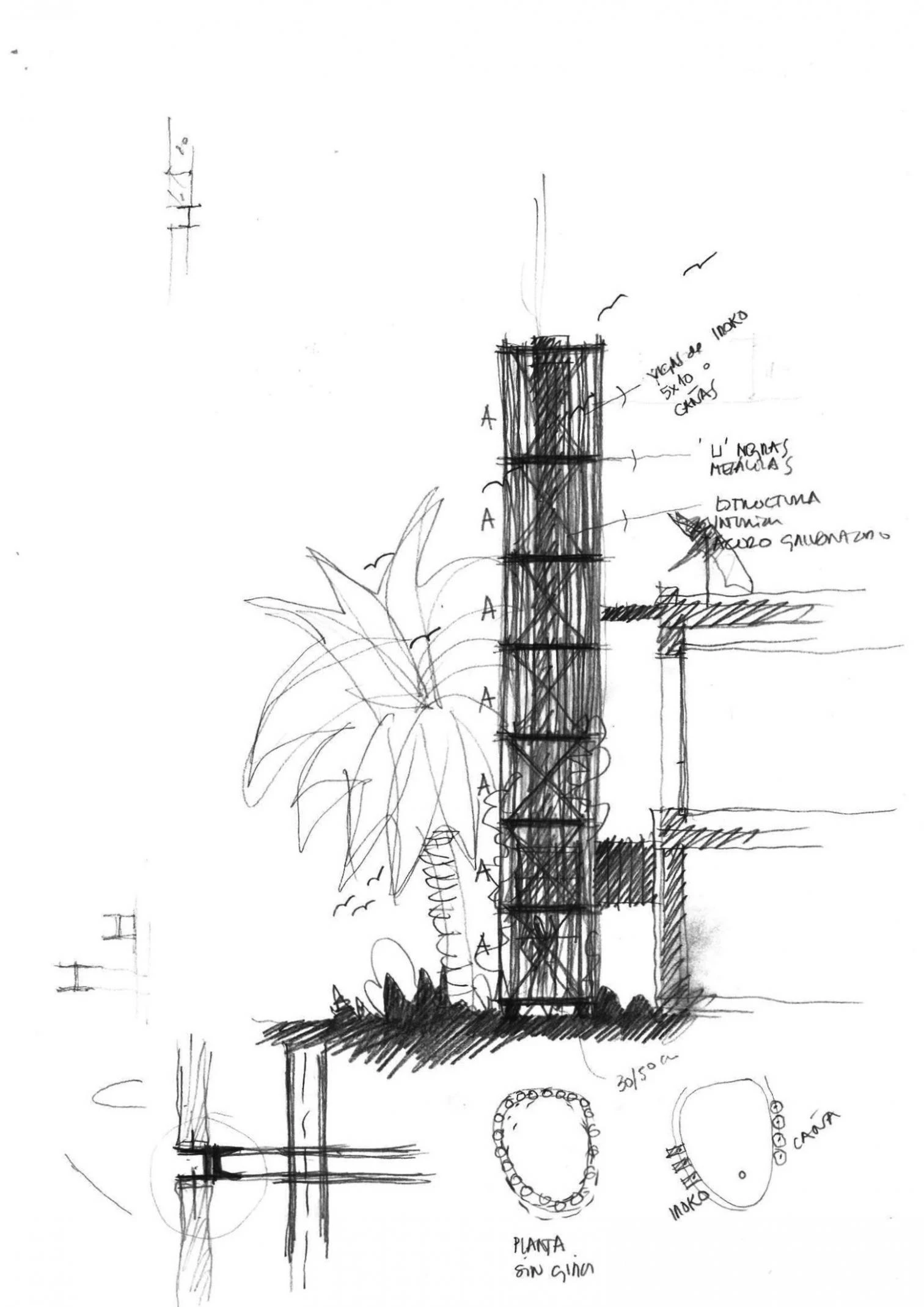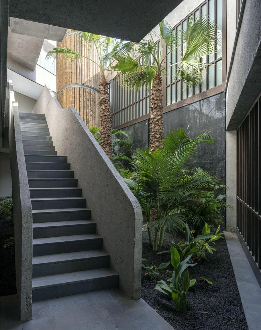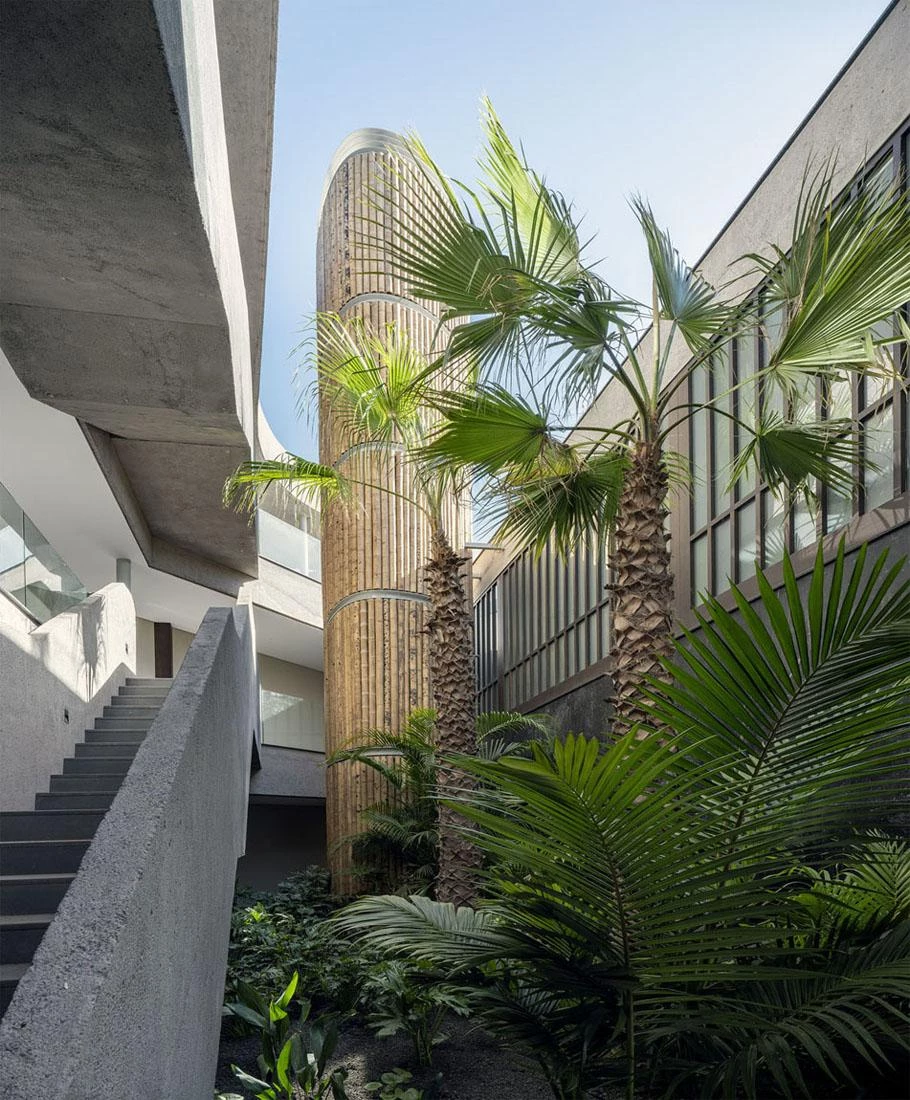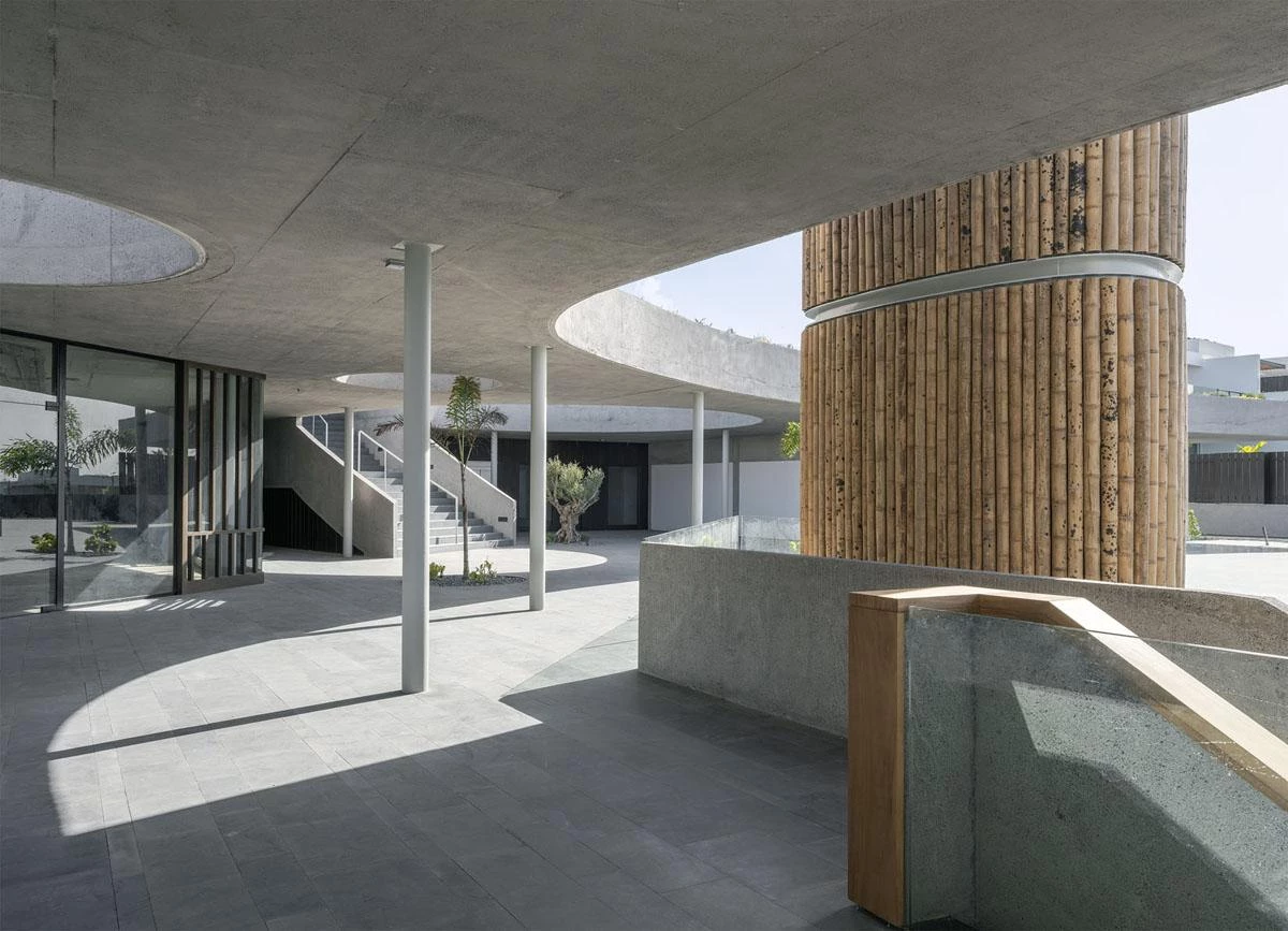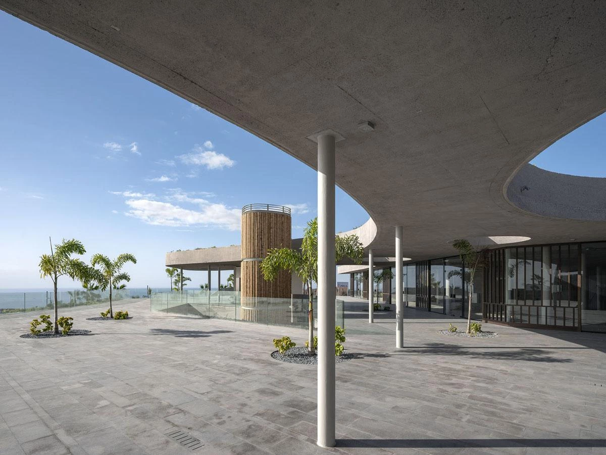This club is located in the Canarian municipality of Guía de Isora, on the island of Tenerife. The site has an irregular shape and a gentle descent westward, commanding views of La Gomera. The amenities set down in the brief – swimming pool, solarium, public square, shops, restaurants, and underground parking – are organized in four stepped levels embedded into the sloping terrain. The frames are arranged in parallels and strictly towards the sunset, determining the strategy for the layout of uses. The chimney appeared shortly before completion of construction, when it was decided that a new restaurant, with its kitchen, should be included on the lower floor. A metal structure with an oval-shaped floor plan and rising 13 meters, clad in wood, conceals the gas-extraction system and nestles itself into the garden.