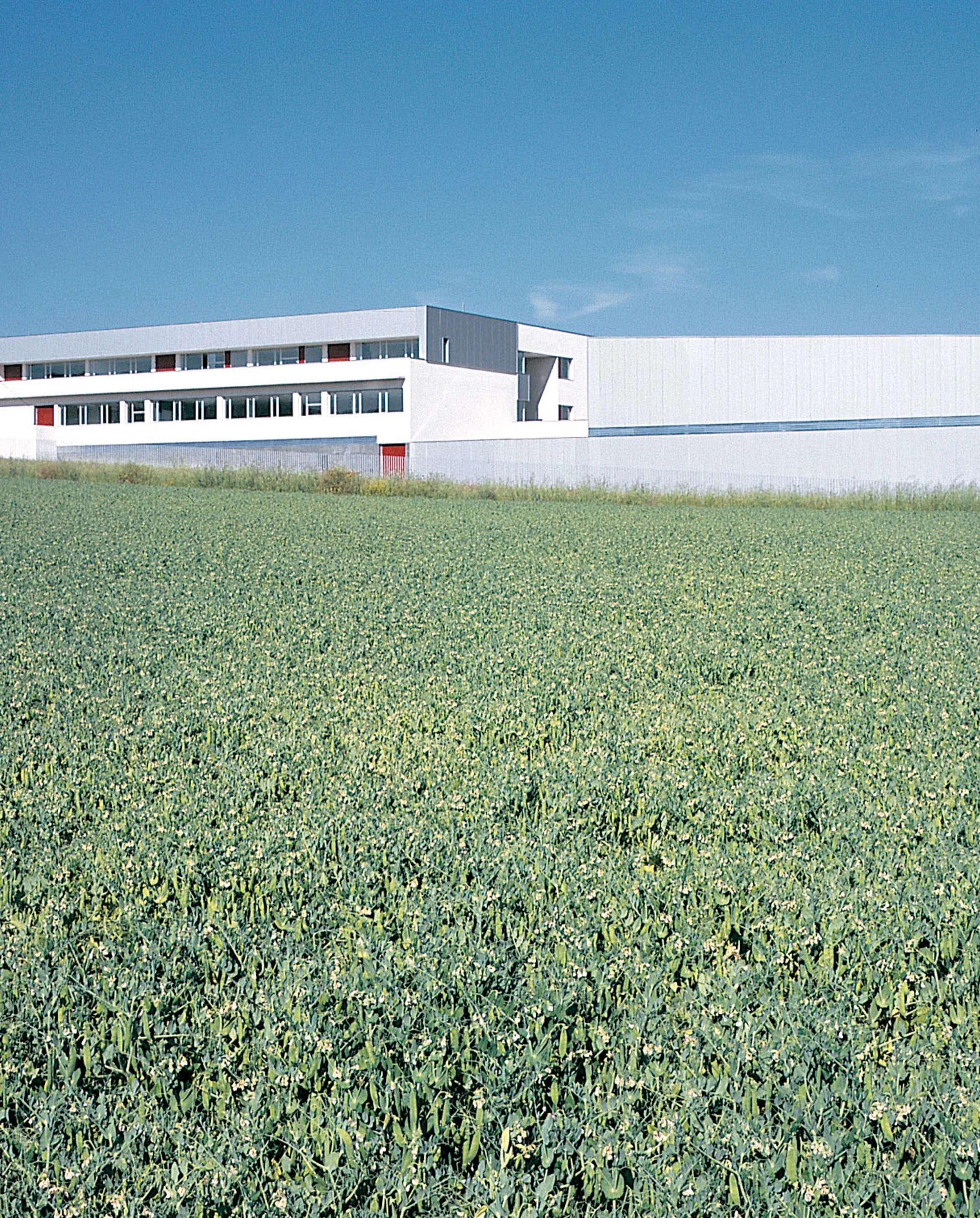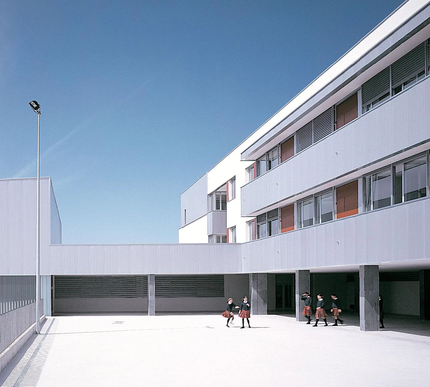 Laid out towards the south, this building takes up a plot that is buried two meters with respect to the level of the access street, next to which is the parking area for school buses; and from a marked horizontal volumetry it establishes an order by which it seizes the encircling semi-rural landscape. Two volumes articulate the complex over the smooth slope: the sports pavilion is dug out of a lower level, further away from the road, blurring its presence between the sky and the ground with an industrial sheet finish; and the main volume, which houses the classrooms, lies on the higher part of the terrain and stands out from afar thanks to its white parging finish, leaving the playground to the slope beside it. This horizontal prism is articulated around four open courtyards and five blocks of equal dimensions, linked to the collective spaces by a double-height lobby. The porch of access constitutes the fifth courtyard, formed by the overhang of the volume on the first floor. Two prismatic pieces rise over the roof to bring light into the chapel and the central corridor.