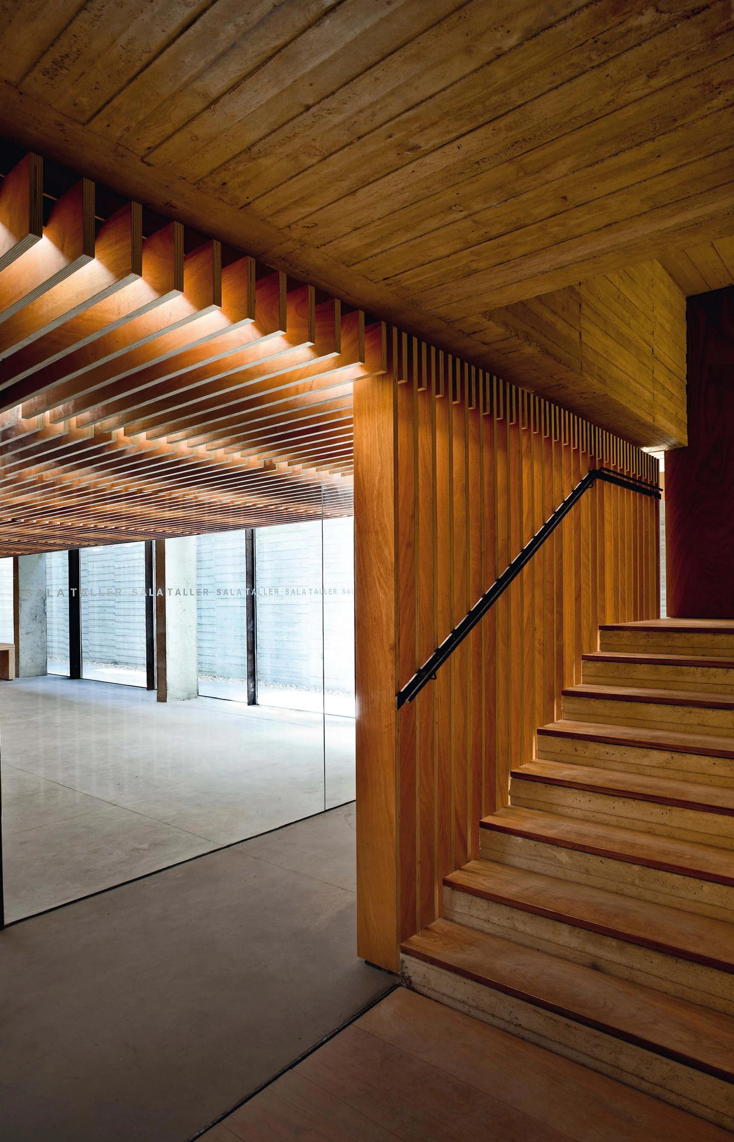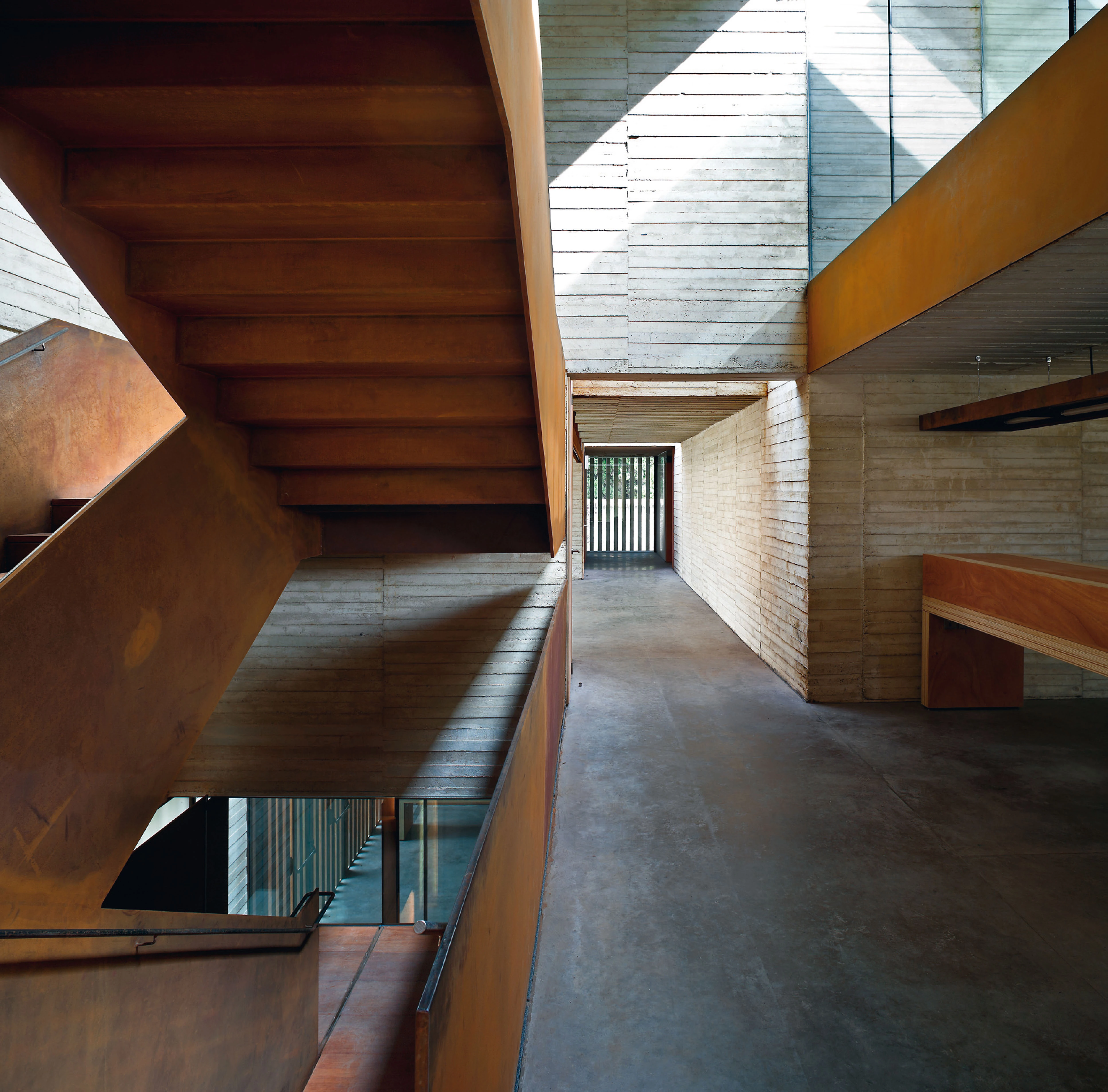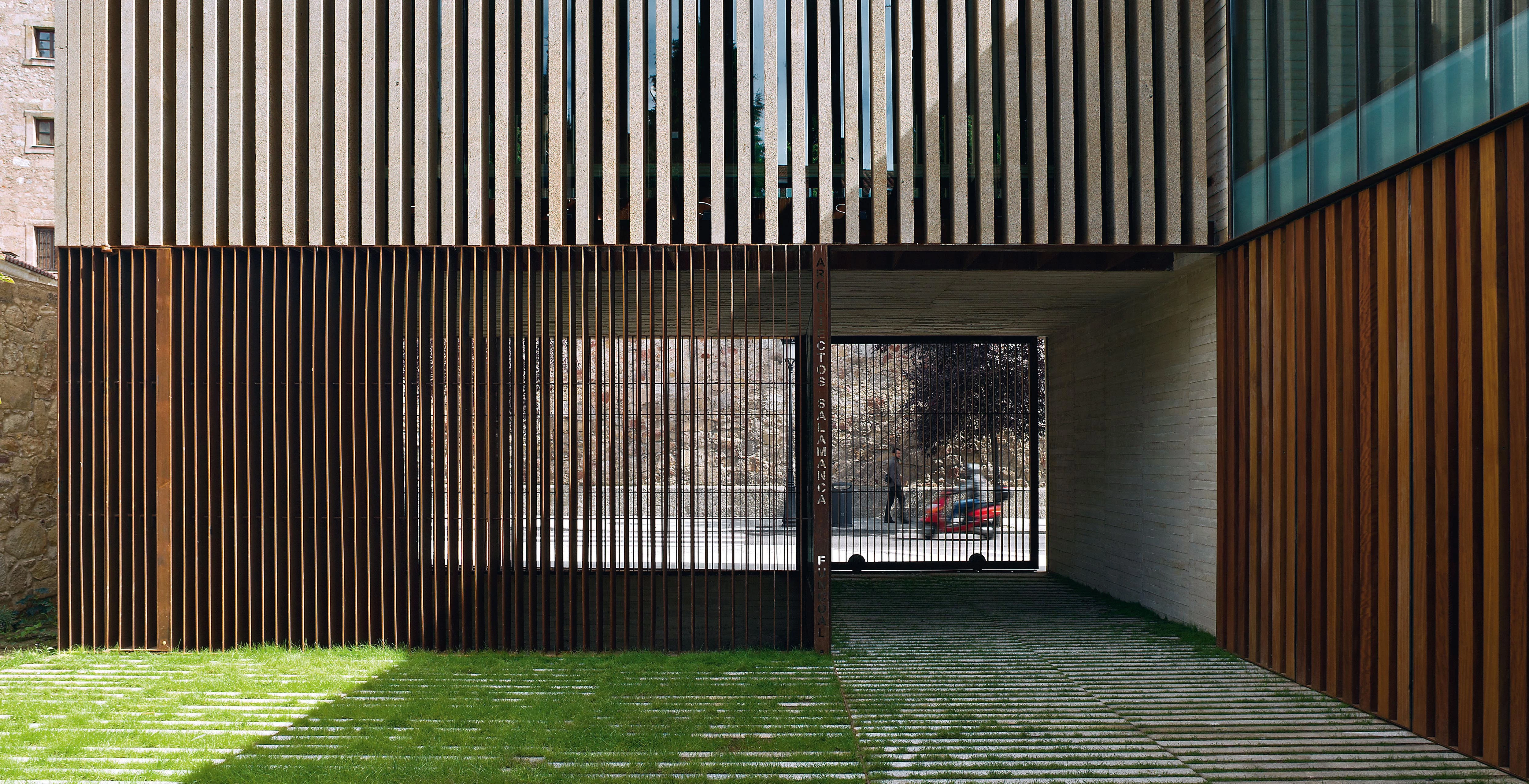 To address such varied conditions the building adapts to the conditions in different ways. In the first place, it rises only two floors above ground level by the street, and a third level is more set back in the rear part of the plot, with the aim of adjusting to the scale of the environment and ensuring views of the cathedral. Furthermore, the choice of materials pursues that golden tone that is so characteristic of Salamanca. For this reason the facade onto the street uses large bush-hammered granite pieces, and inside the golden concrete is combined with wood and corten steel.