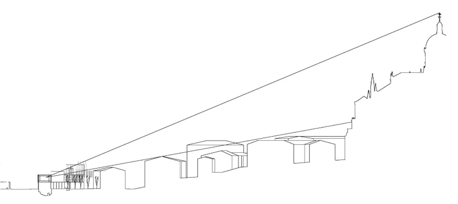 of archaeological remains urged to change the project, and to design the area of entrance to the first bay of the building as a bridge with no intermediate supports, thus protecting the archaeological site, which is placed in a double-height open space. This space is separated from the street and the entry courtyard by a corten steel grille and from the walk-through area by a glass sheet, letting passers-by contemplate the strata of the city’s history.