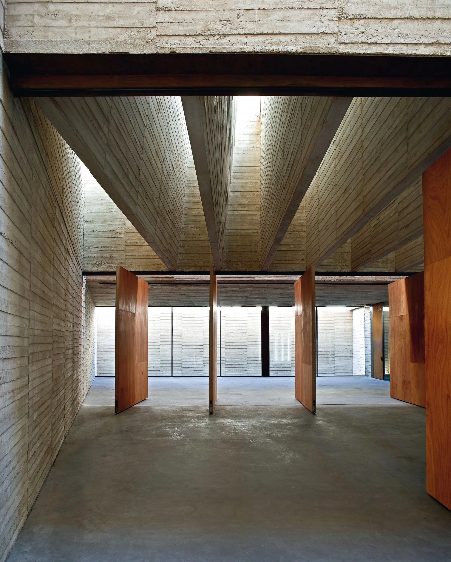 The building is articulated as a sequence of bays parallel to the street. The thick walls of reinforced concrete complete the structure, the services and equipment. Since aside from housing the headquarters for the local architects and its administration areas the building also accommodates the cultural foundation, the ground floor had to be an open-plan space for meetings and exhibitions. To achieve this, the structure of the upper walls is completed with deep wall beams, eliminating the intermediate pillars on ground floor. This large space is divided into three by a system of large wood panels that can be removed when a larger space is needed. In the third bay, on the first and second floors, several courtyards bring light in and create an interplay of transparencies and reflections between the different office spaces.