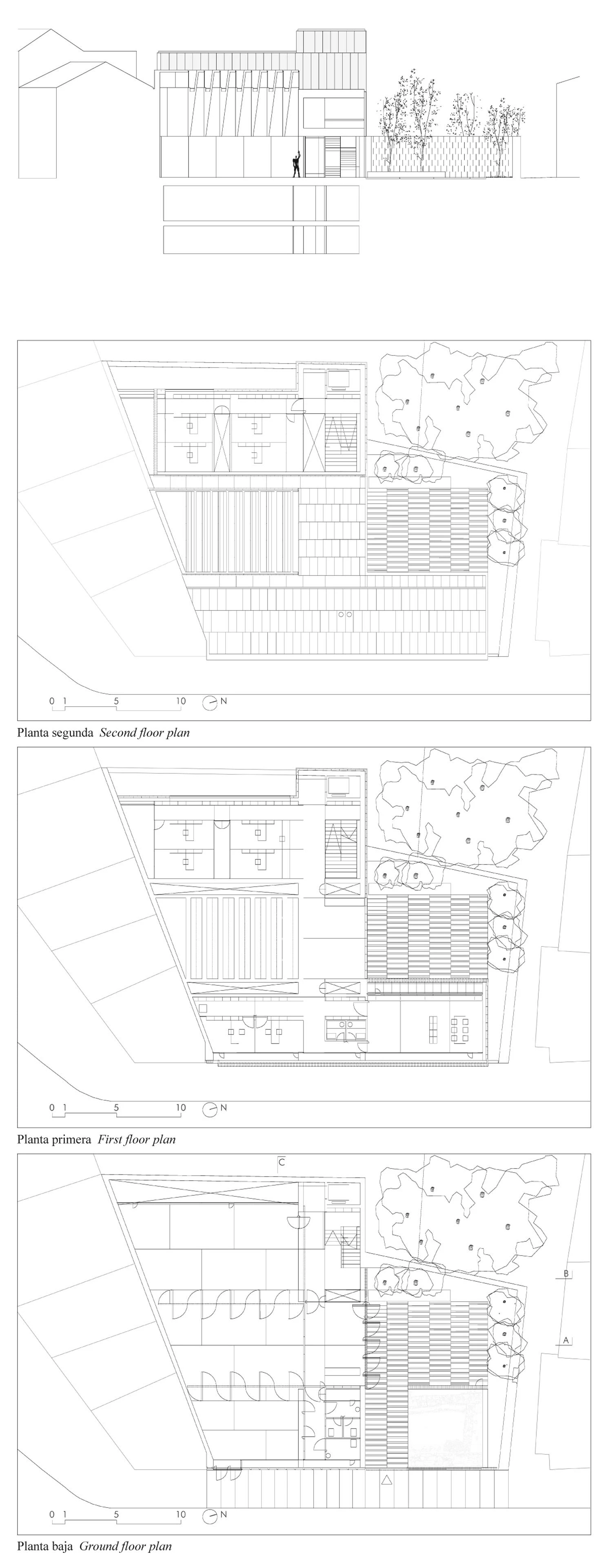 The administration areas of the upper floors receive light through the stone trusses of the facades or of the courtyards in the interior spaces, achieving in this way an introspective atmosphere in the building.