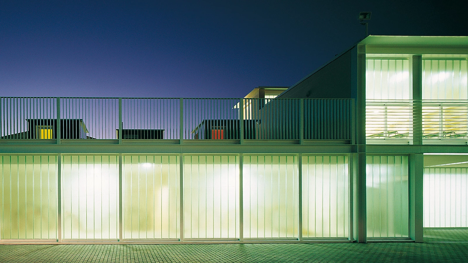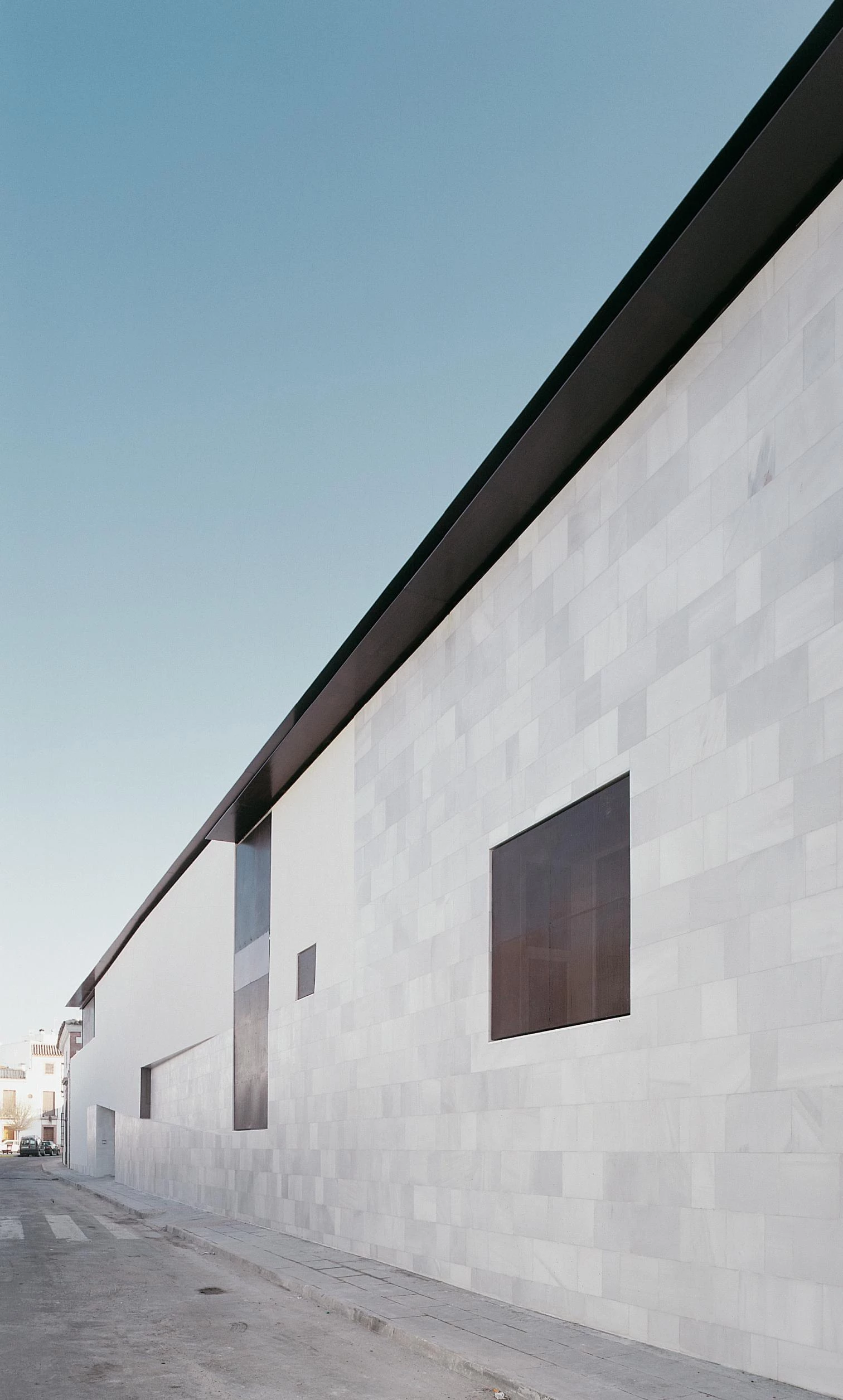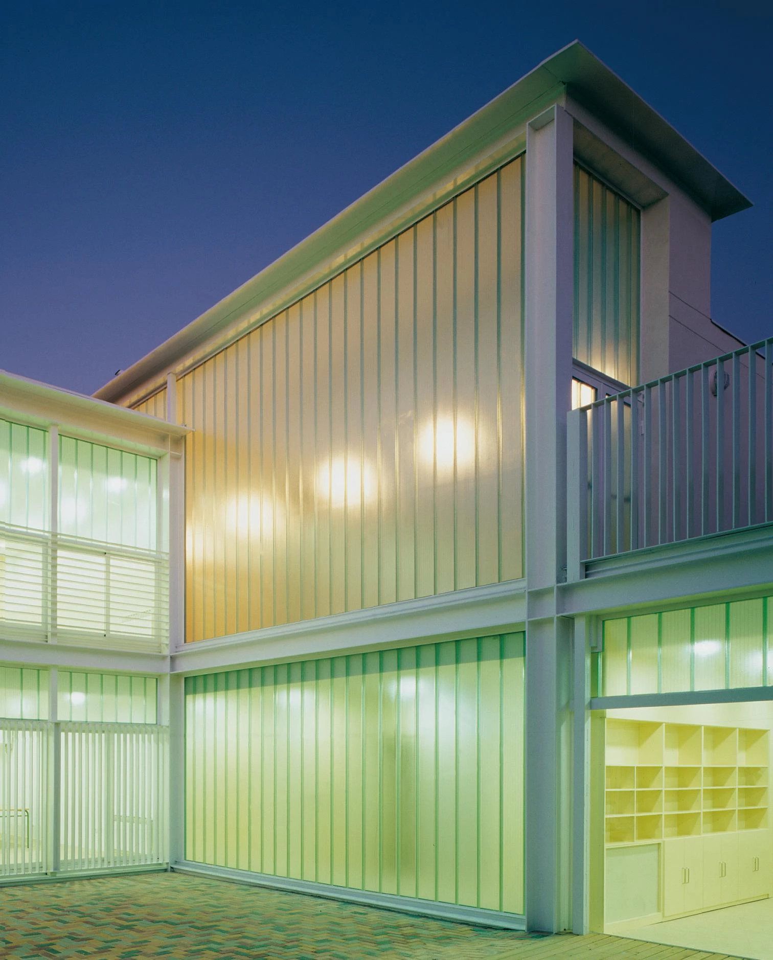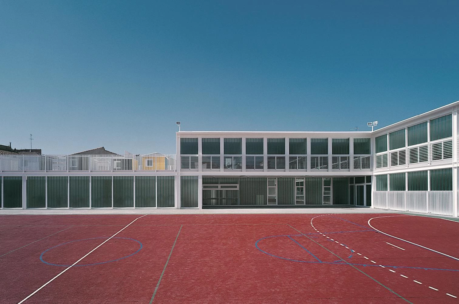 Towards the courtyards, the school facades respond to the need to capture a well distributed light for the educational space. The upper part of the structure is closed with U-shaped industrial glass sections that give off light and the lower part with glass protected by slats. All painted in white, color appears in the outside field and the playground terrace fit out on the roof of the preschool classrooms. Towards the street, however, the building stands with a closed facade that reconciles the small scale of the houses with the dimensions of a public facility, such as the school, by means of a petreous and continuous wall with small crevices that break its linearity.