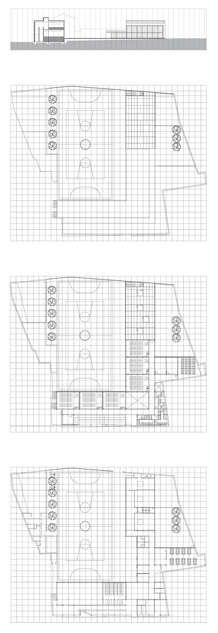 The building adapts to the shifting profile of the plot to conceal the party walls. The gymnasium in front of the children’s wing has an independent access that allows its use on public holidays.