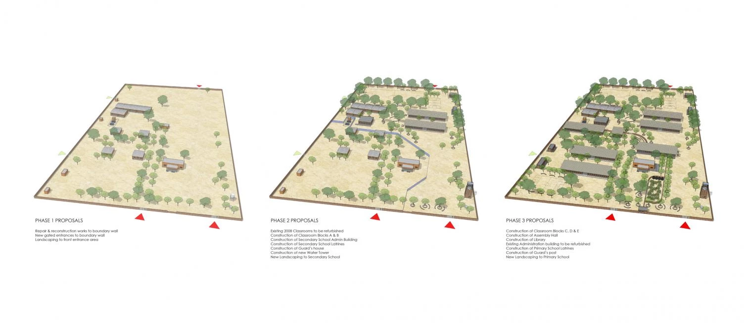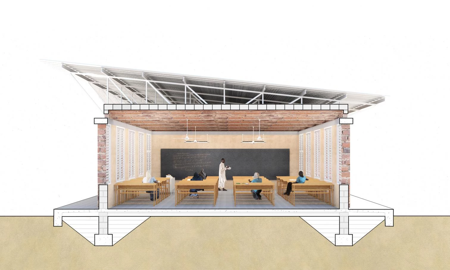 The buildings harness passive design principles to mitigate high temperaturas and create comfortable spaces for teaching and learning. The classrooms present a double roof system. The existing roof cavity between the vaults of rammed-earth brick and the flying metal roof above lets air circulate and prevents the sun’s heat from radiating into the classrooms.