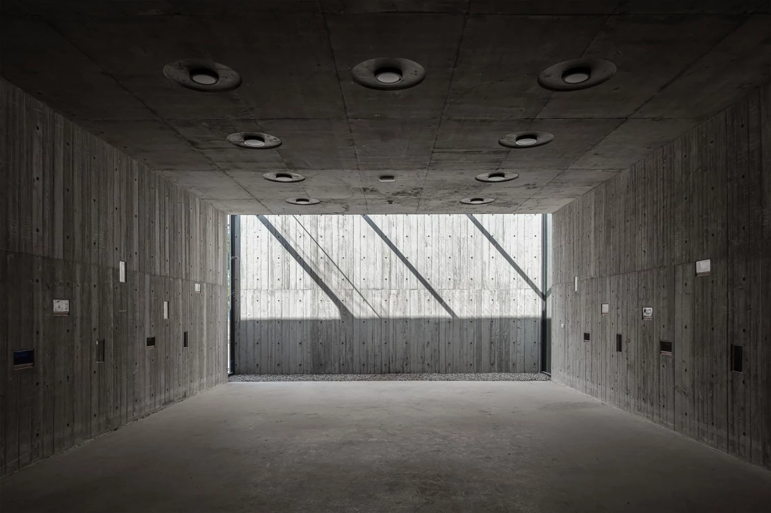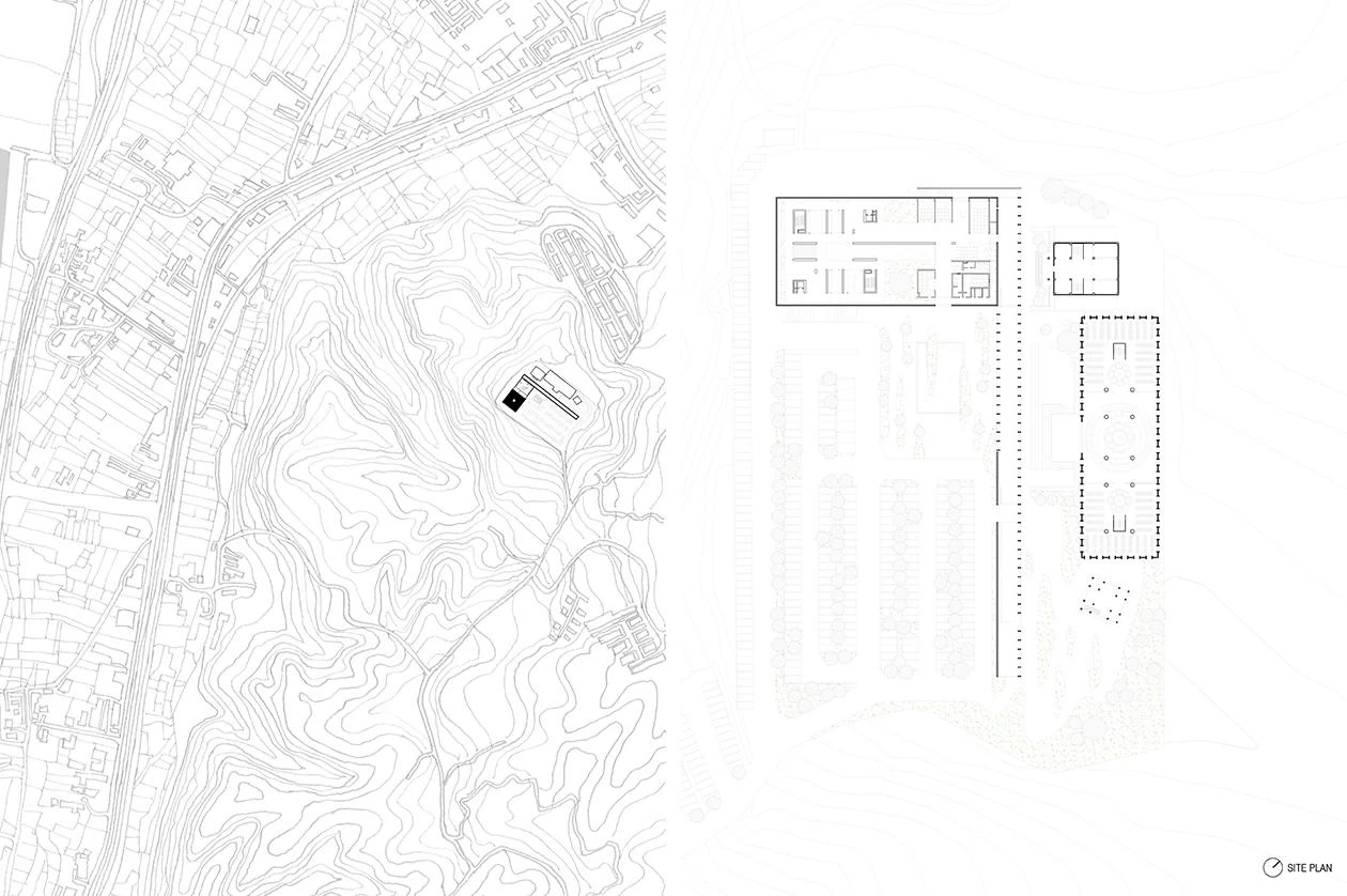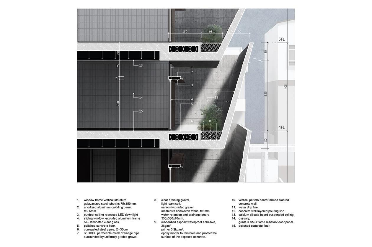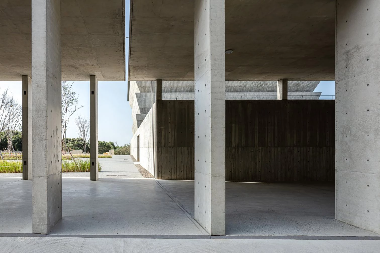 The cemetery in Hsinchu, known as ‘the wind city’, is located high up on Xiangshan Hill, overlooking the sea and exposed to gusts crossing the Taiwan Strait. Protected by an introspective concrete skin, the main volume harboring the columbarium is formed by the stacking of slanting walls, with perimetral rows of vegetation inserted at the base.