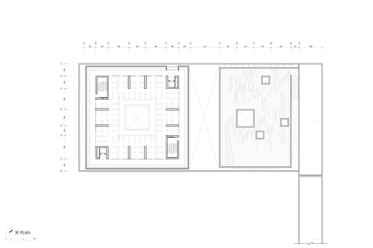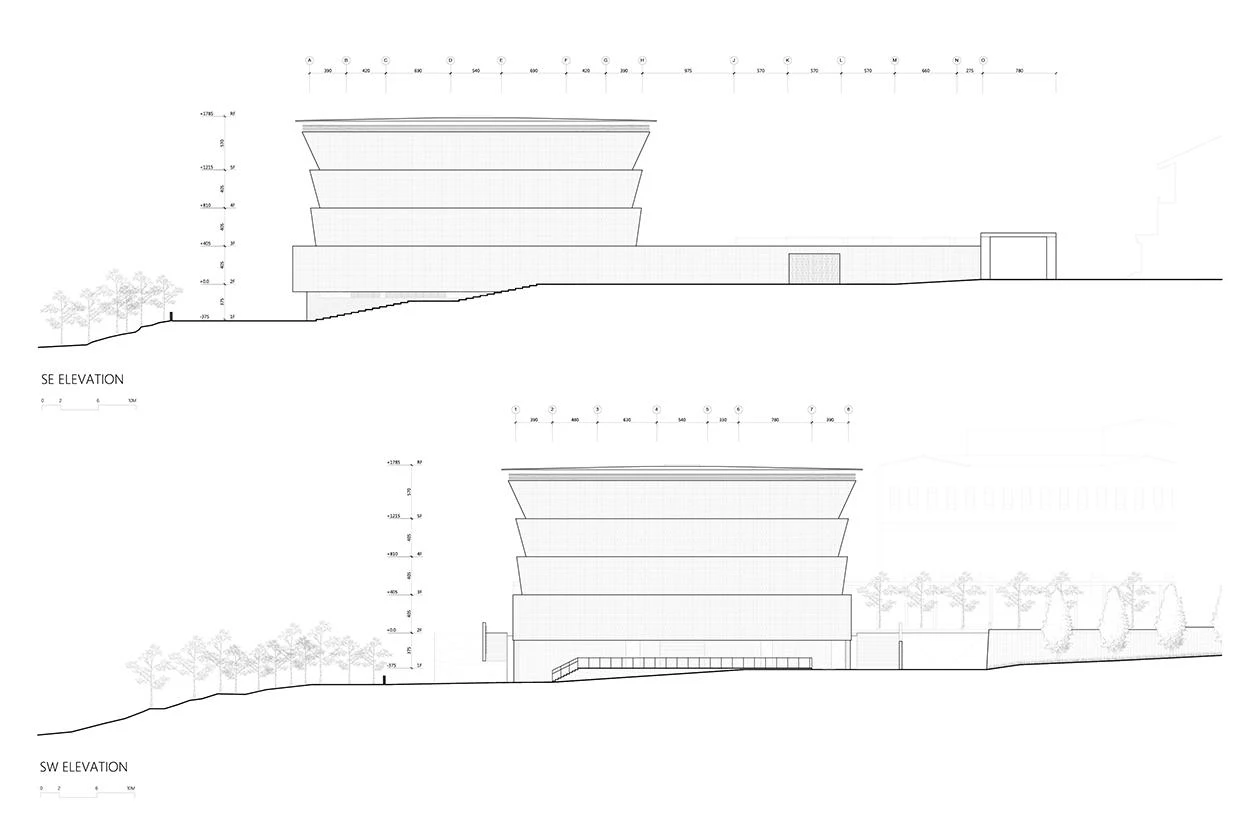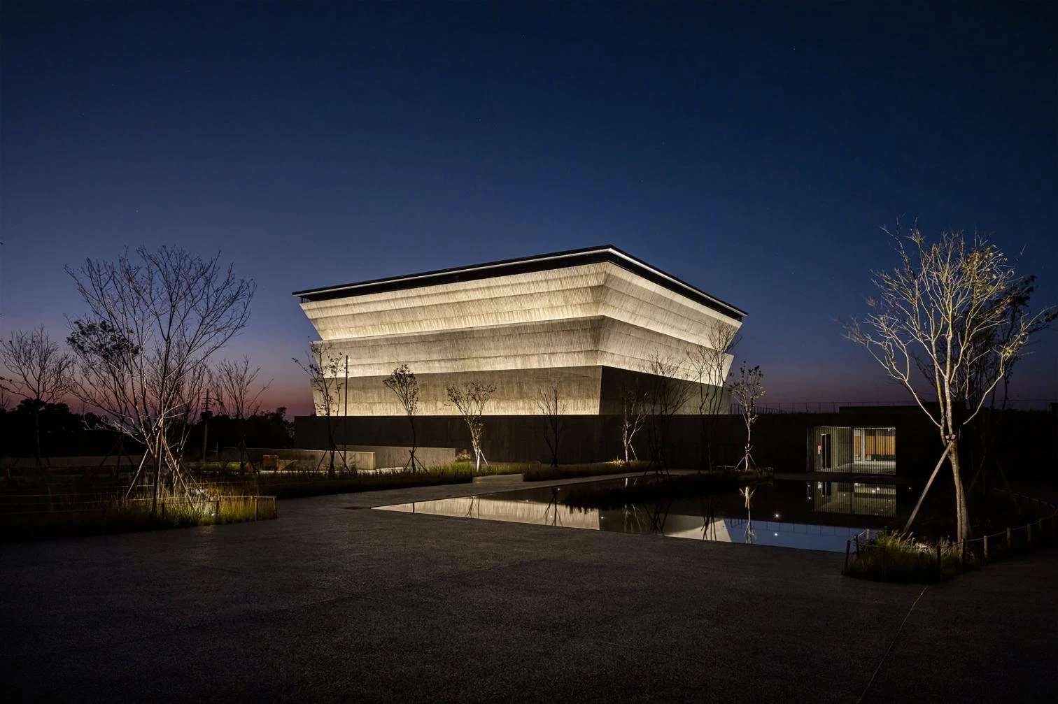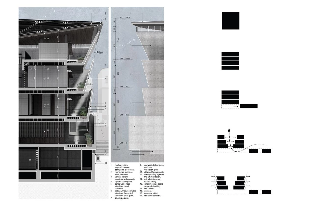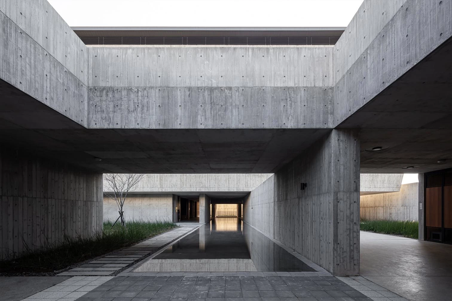 The cemetery in Hsinchu, known as ‘the wind city’, is located high up on Xiangshan Hill, overlooking the sea and exposed to gusts crossing the Taiwan Strait. Protected by an introspective concrete skin, the main volume harboring the columbarium is formed by the stacking of slanting walls, with perimetral rows of vegetation inserted at the base.