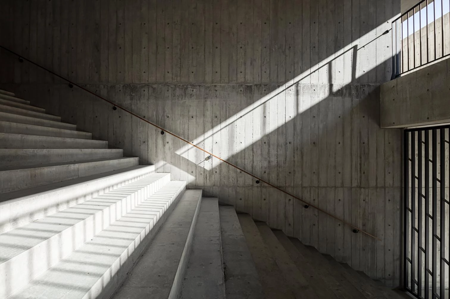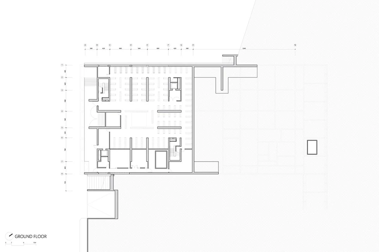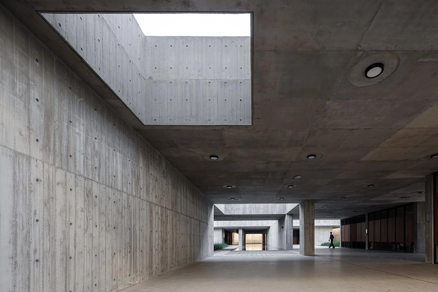 A 159-meter loggia connects the old building to the new one. This colonnade shelters the traditional spots for offerings and leads to the columbarium. The plinth that raises this main volume contains the worship spaces and the courtyards where mourners gather. This platform is perforated by a series of shaded patios interconnected by pools of water. The atrium is formed by the cantilevered stacking of four levels that create the columbarium zone: a simple gesture that gives rise to a naturally lit perimetral cloister.