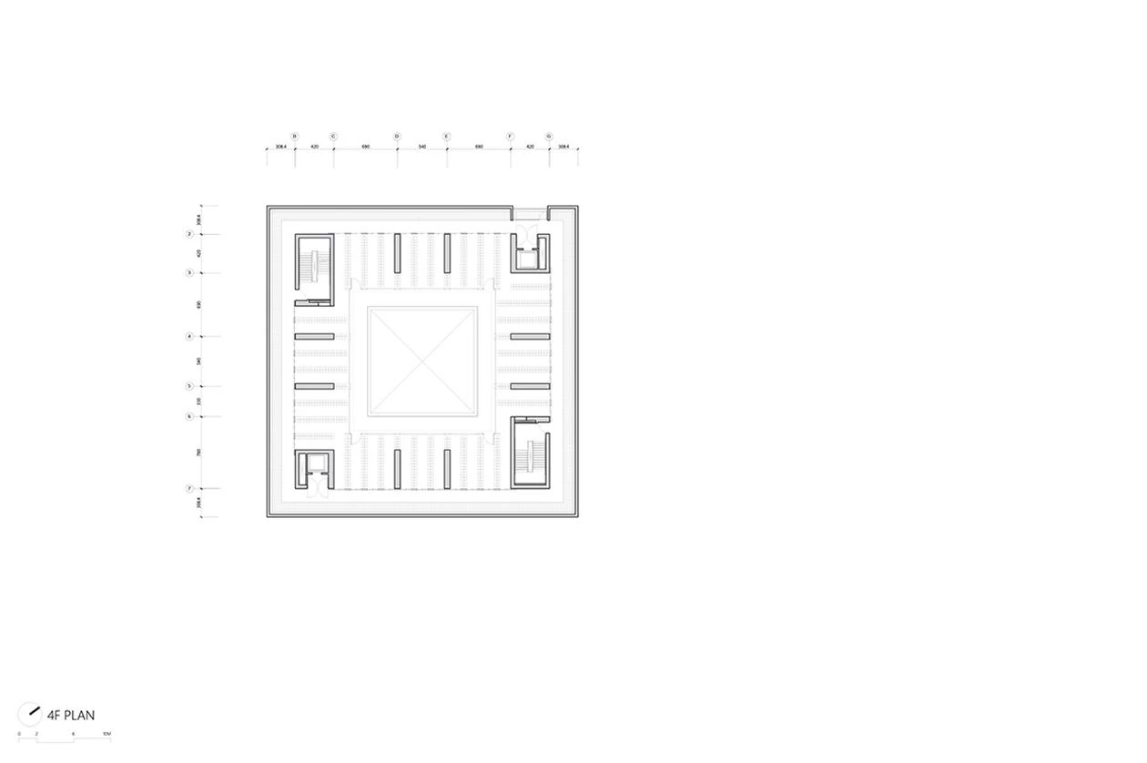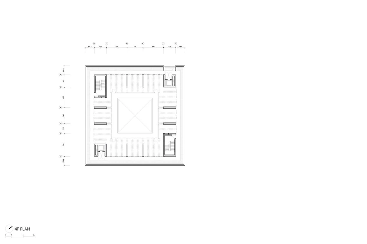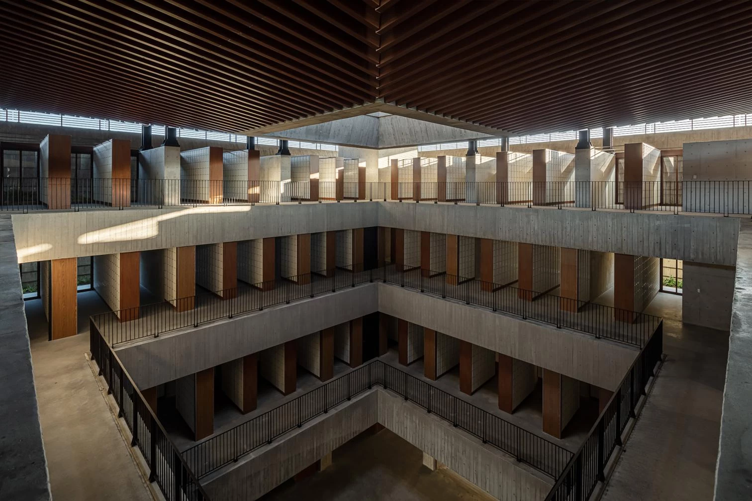 A 159-meter loggia connects the old building to the new one. This colonnade shelters the traditional spots for offerings and leads to the columbarium. The plinth that raises this main volume contains the worship spaces and the courtyards where mourners gather. This platform is perforated by a series of shaded patios interconnected by pools of water. The atrium is formed by the cantilevered stacking of four levels that create the columbarium zone: a simple gesture that gives rise to a naturally lit perimetral cloister.