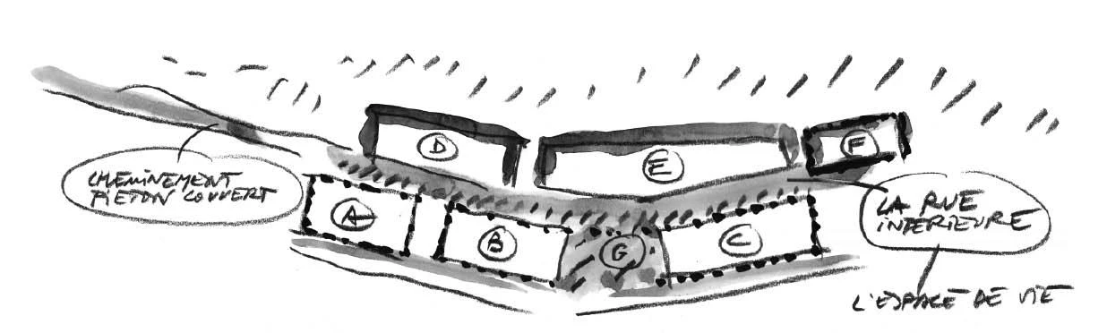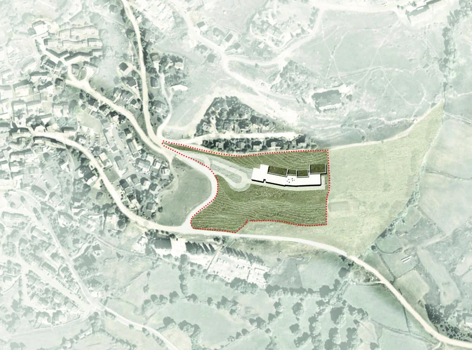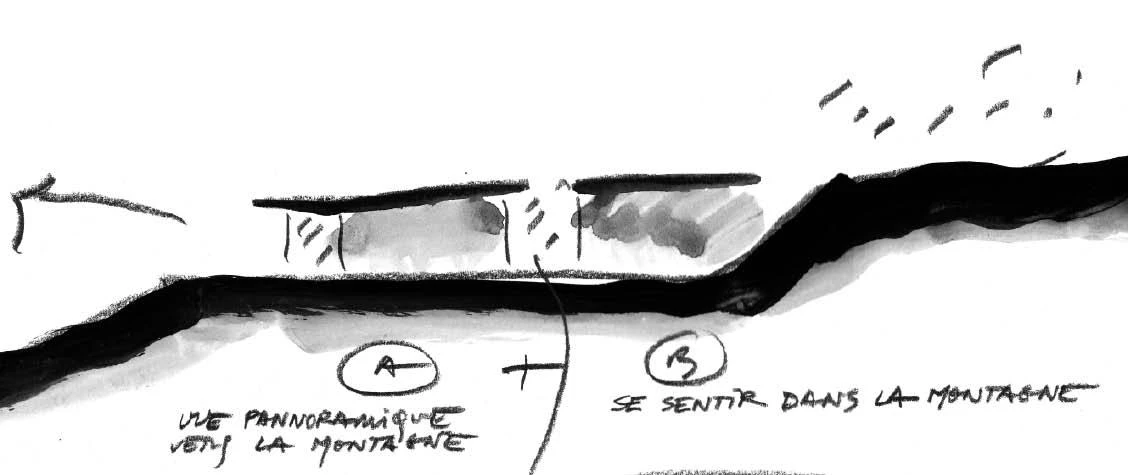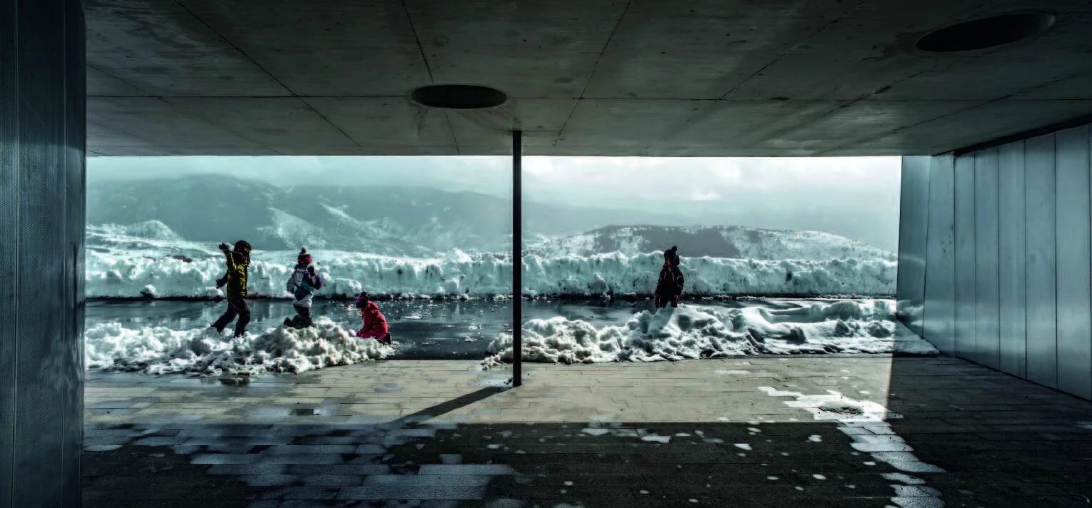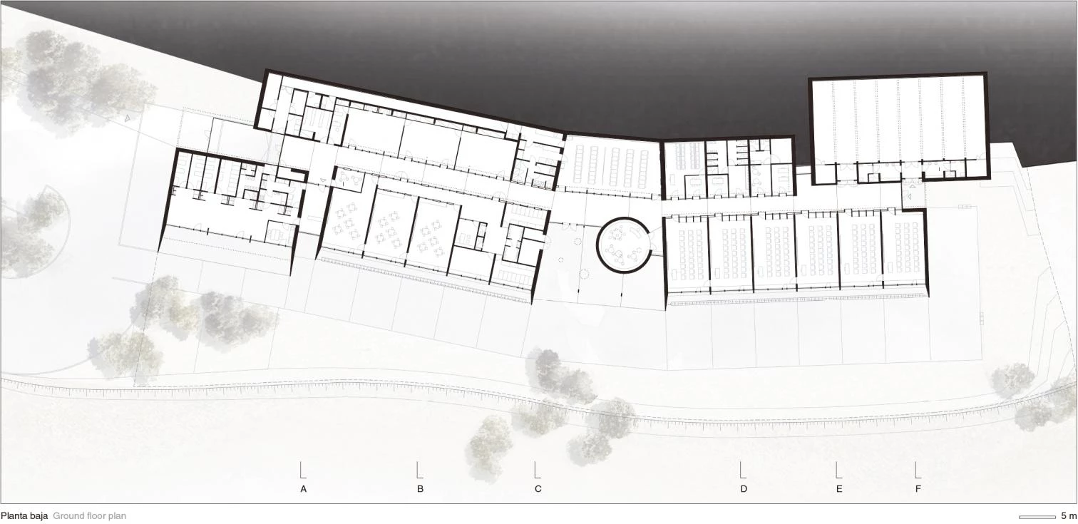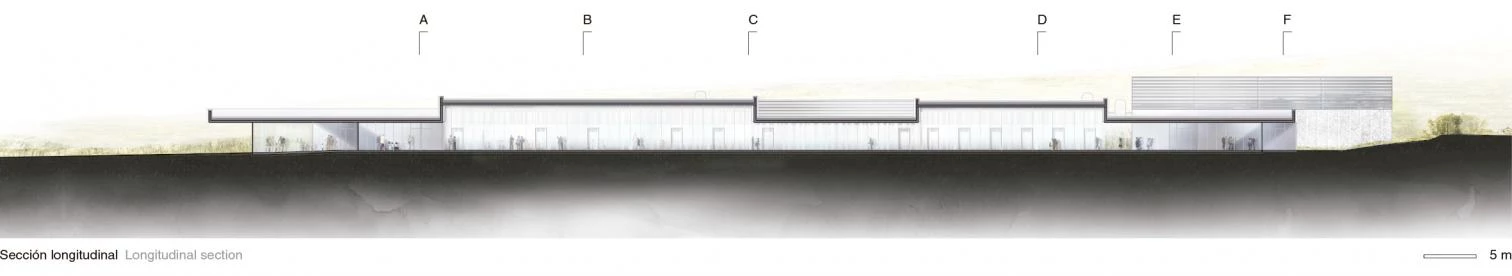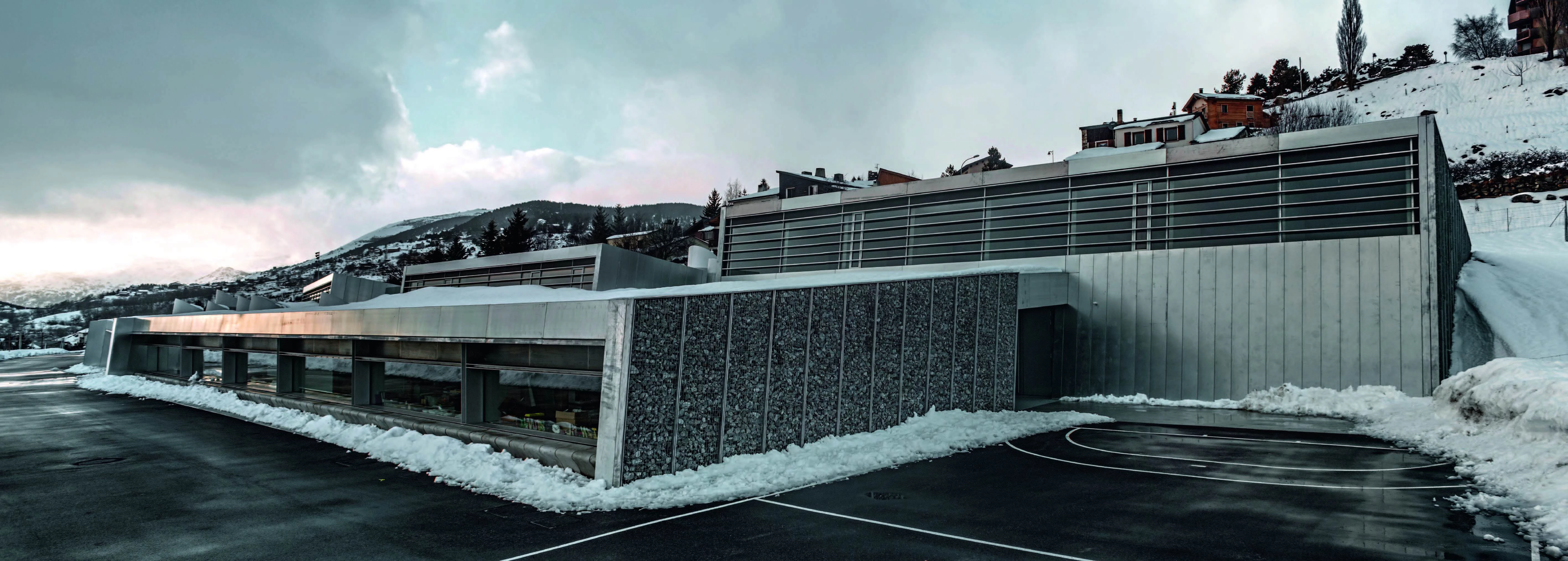 Located on a hillside facing south in the Eastern Pyrenees, the school complex includes different facilities for kindergarten and primary school for three towns: Font-Romeu, Odeillo and Via. The situation of the site, as well as its exceptional views and sunning conditions, determine how the school is planned, stretching on one single level, creating a friendly scale for children and with no stairs. The classrooms, organized by ages, are distributed in boxes that are partially buried in the slope and covered by a single green roof, with the south facade open to the mountainous landscape. This guarantees thermal inertia in the spaces for teaching and also that they have natural light throughout the day, and the building is respectfully embedded in the hillside. An interior passage vertebrates the building, connecting the communal program from the access to the sports hall, located at the opposite end. The section of this passage takes different forms as it moves forward, making sure that the different areas receive light, and it opens up midway to a covered courtyard for rainy or snowy days. In contrast with the glass surfaces of the southern front, the side facades and roof have a granite gravel finish.