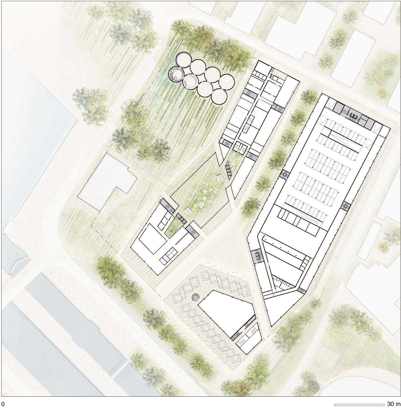 Located north of Bordeaux, across from the locks that close the canal of access to the city’s seaport from the Garonne River, this urban intervention spans a large dock whose port facilities, already obsolete, are replaced by a complex of mixed-use buildings including services and housing. Because of its strategic urban situation, the complex includes a market, offices, a hotel, shopping areas and apartments. It also maintains some of the existing structures if still useful or when they have an aesthetic value, such as the control house of the locks or a series of large storage silos. Instead of a single massive piece, which would break the scale of the place, the project proposes a series of volumes with interior streets for shops, whose facades are separated or broken to create small squares and interrupt the linear perspective. Furthermore, the volume of these pieces is in tune with the height of the surrounding buildings, maintaining the horizontal character of the facades along the river. The facades, drawn up as metal latticeworks that wrap the volumes, leave the front at street level open, showing the activity taking place inside. The first level of roofs offers landscaped spaces with views over the river and the city.