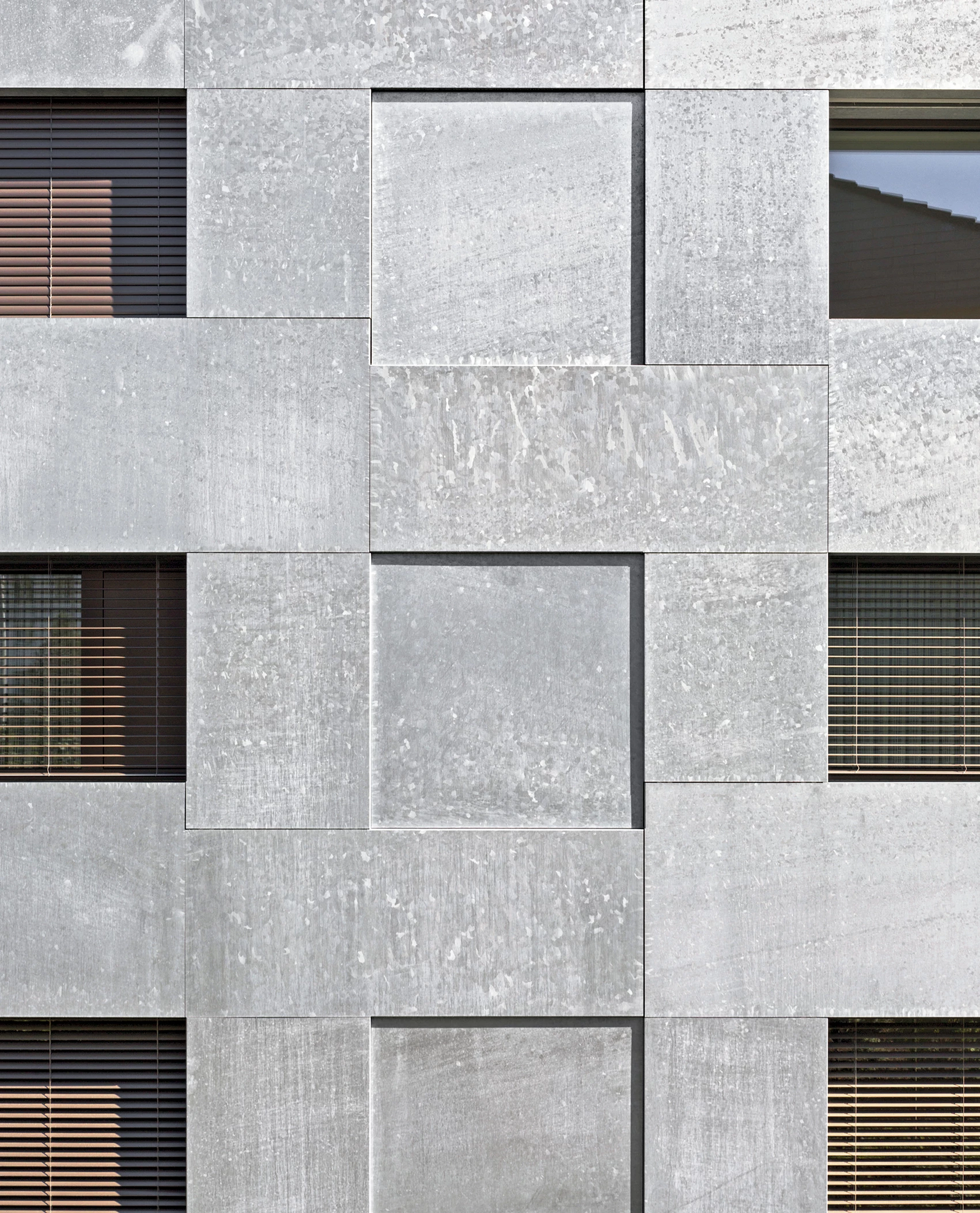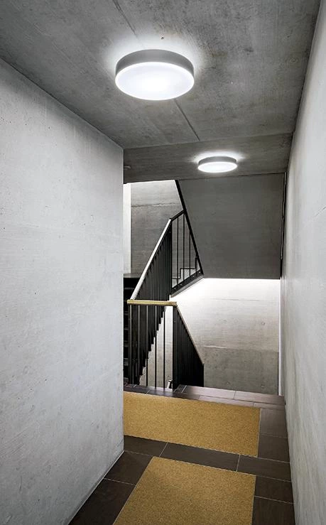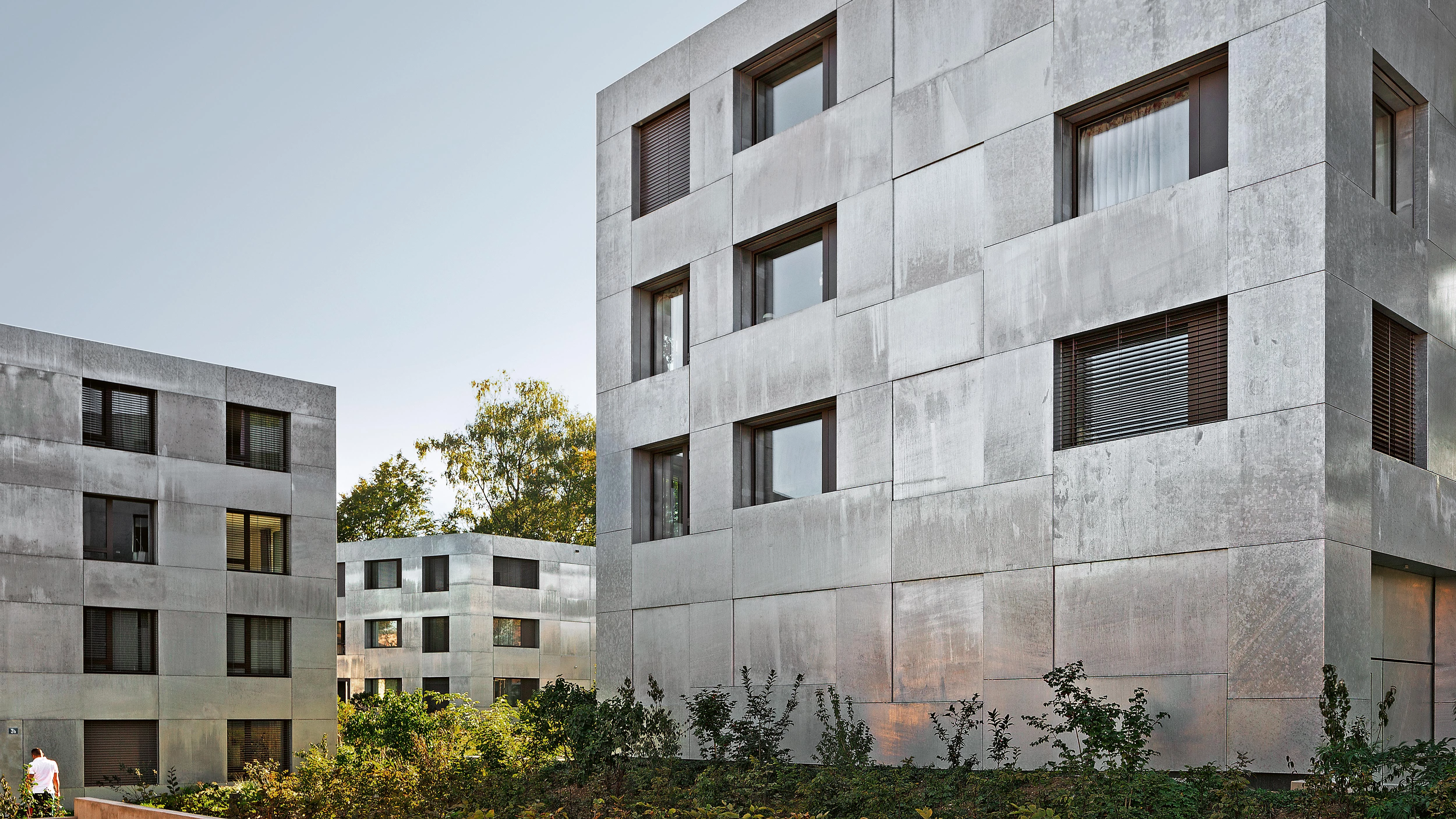 Surrounded by trees and plenty of greenery, the three residential blocks that form the Chilestieg complex rise on a large plot of land in the municipality of Rümlang. The Swiss commune of 8,000 inhabitants – located close to Zurich’s airport – is mainly composed of farmland, woods, and low-density developments. These apartment buildings echo the peace and quiet of their suburban environment, but instead of merging with nature in a dispersed manner, they make a compact grouping, saving as many of the mature trees as possible. The result is a striking contrast between the mineral quality of the solid volumes and the botanical nature of the rest of the premises.