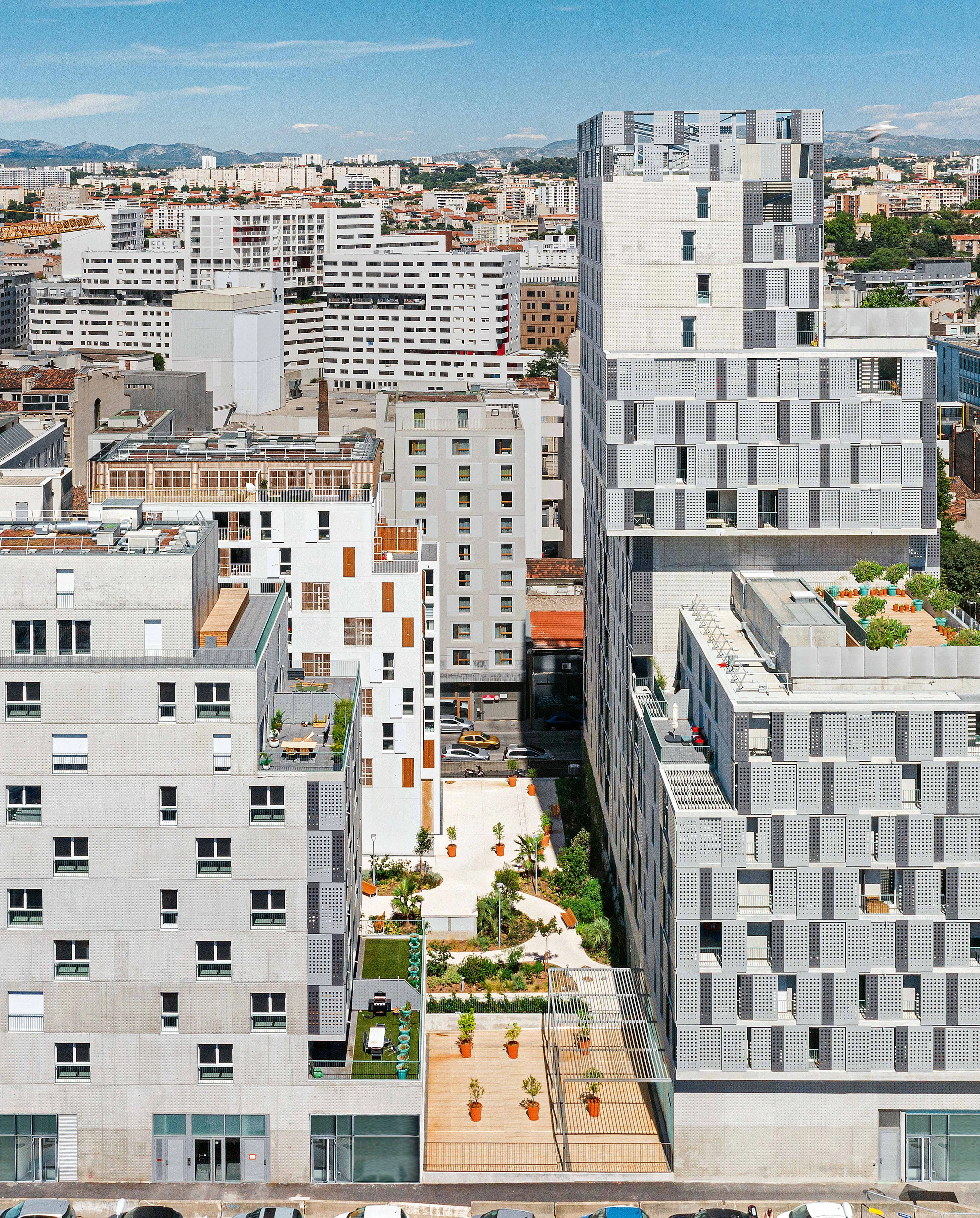 The Mistral residential complex is part of EuroMed, a mixed-use development built in Mar-seille on the grounds of the old port. In accordance with the masterplan, the complex pre-sents an urban scheme of a certain density; an intermediate volume made up of well-oriented horizontal prisms and an upper area in which the floors reduce their size so that all apartments benefit from long views, sunsets, and sea breezes. The development mixes so-cial housing and free-market housing, collective gardens and terraces, communal spaces and agricultural areas, and a system of accesses that does not segregate residents by social group. Construction-wise, the project uses basic technical systems, including a facade of light, perforated panels easy to manipulate by the users, generating a sequence of intermediate spaces that form a sort of parallel open-air housing. The loggias and facade ensemble turns each dwelling into a device for negotiating the meteorological conditions typical of Medite-rranean cities that oscillate from mild to stormy weather including the strong mistral, a northwesterly wind that blows from the coast towards the sea and lends the project its name...[+]