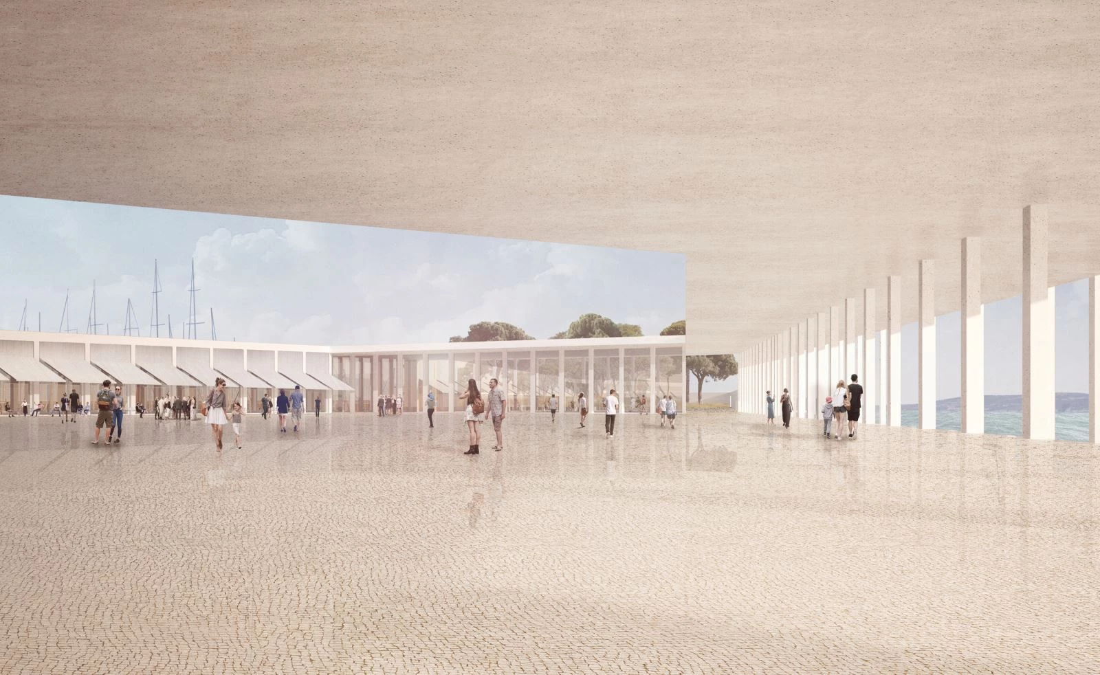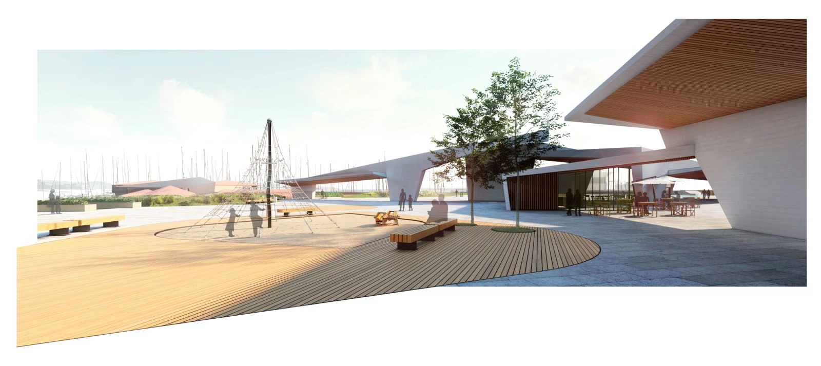 The winning design, titled ‘Batea en tierra,’ includes the harbor master’s building, giving it a new pitched roof, and puts a linear pergola over the existing shops, unifying the complex. A landscaped embankment on the Plaza de los Barcos side negotiates the ground level change and links up the urban courses, adding a passage for vehicles serving the fishing port. Finally, a new shelter will accommodate events, a square volume with transparent facades and a combination of wood, EFTE, and a system of metal struts.