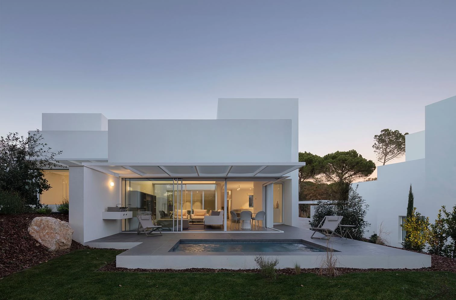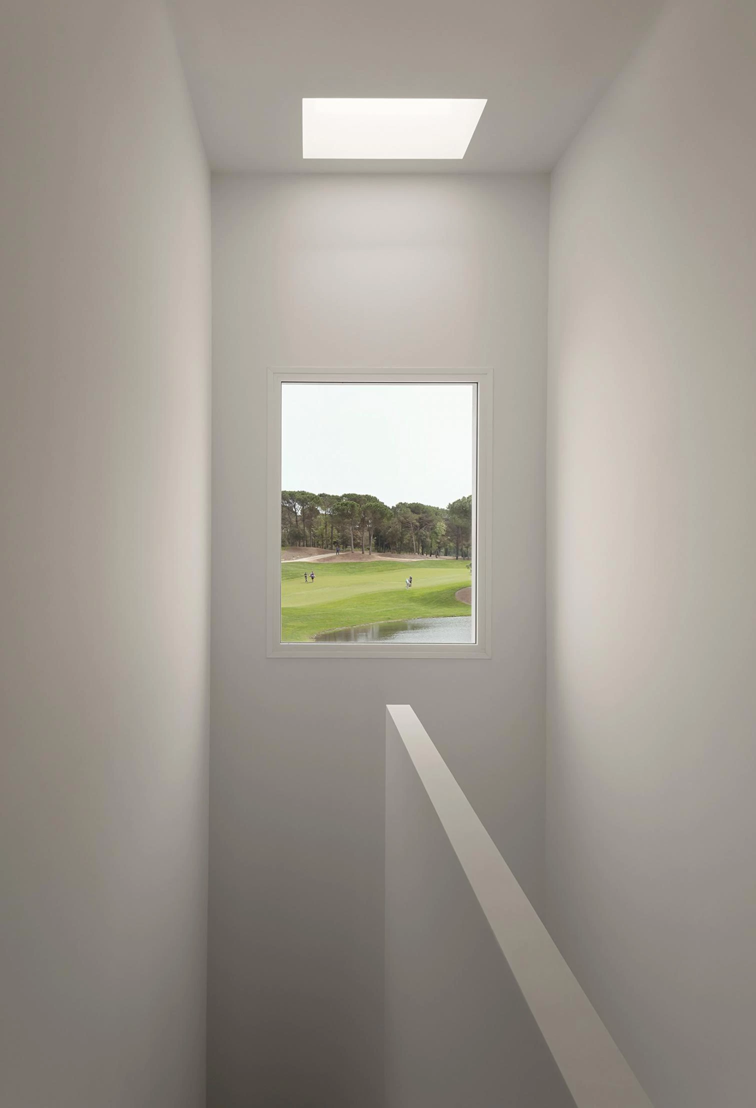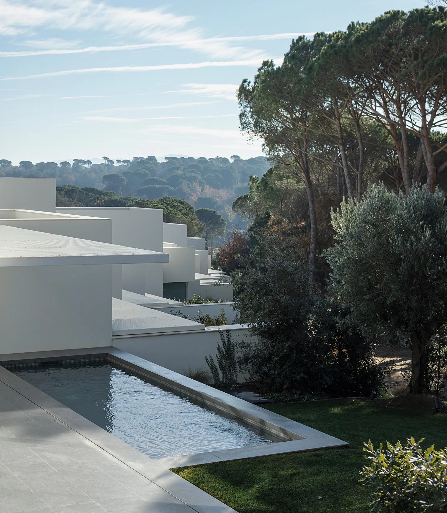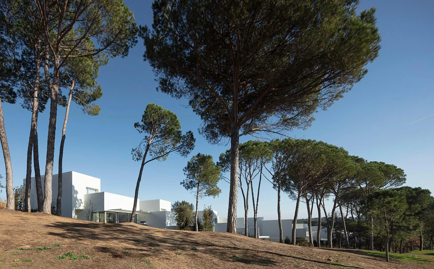 These 23 homes, surrounded by pine trees, are located beside the Camiral golf course of Caldes de Malavella, a municipality in Girona province, in the comarca of La Selva. A work of the architect Jaime Prous in collaboration with Antón Monedero, Àlex Pineda, and Eduardo Romero, the white volumes of varying size form a small village adapted to the topography, optimizing views of the surroundings. Inside, the rooms are concatenated fluidly, preventing transition spaces from forming.