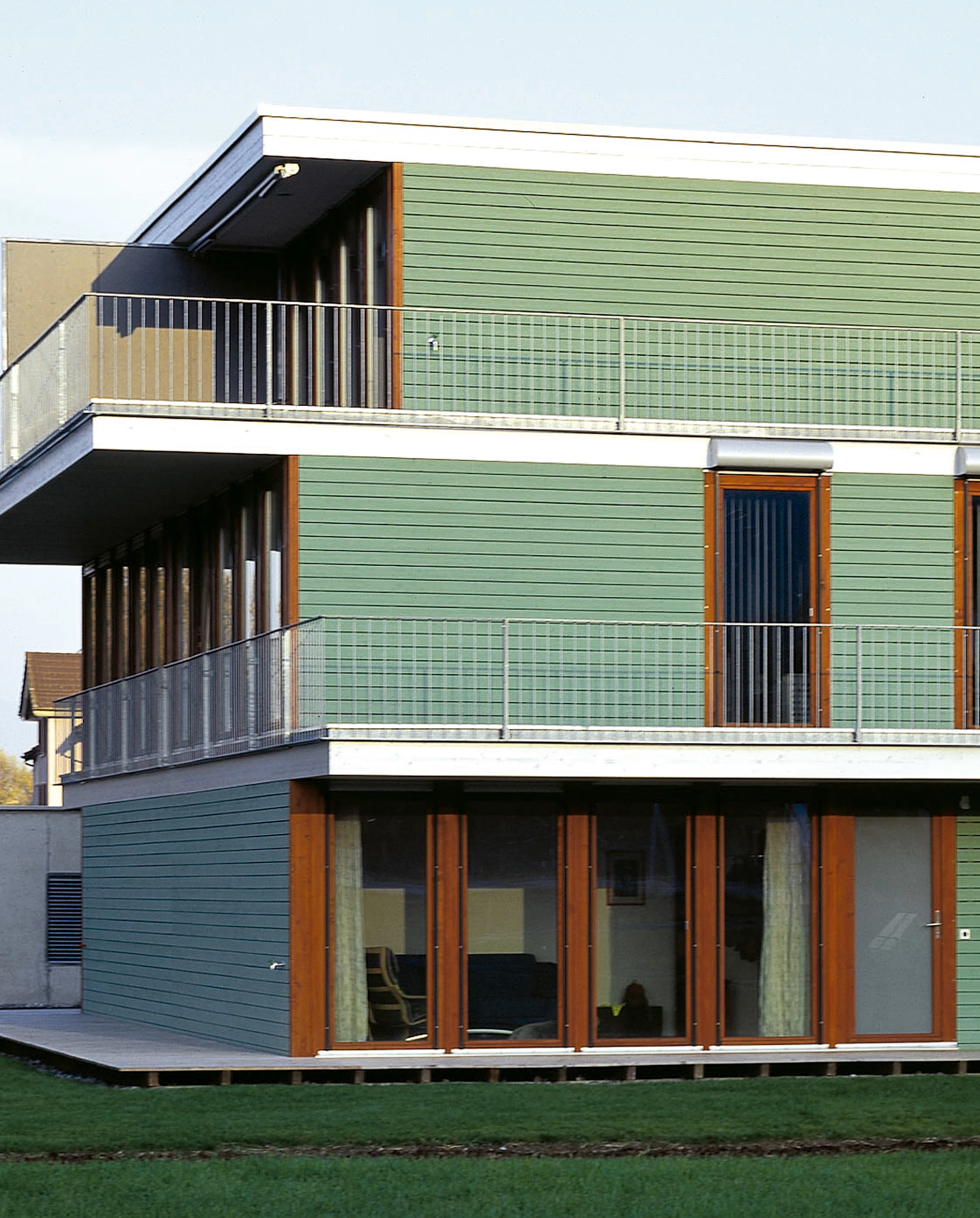 La pequeña población de Altendorf, en el cantón suizo de Schwyz, tiene su mayor atractivo en las vistas hacia el lago de Zúrich. En un terreno situado a orillas del mismo, junto a un muelle de embarcaciones de recreo, se ha construido un conjunto de ocho viviendas agrupadas en cinco volúmenes de planta cuadrada. A pesar de guardar poca distancia entre sí, los volúmenes se han dispuesto de modo que todas las casas tengan buenas vistas hacia el lago, a lo que contribuye la ausencia de setos altos o cierres entre las propiedades. El interior de la parcela es un único espacio comunitario sobre el cual surgen los bloques, delimitados por sencillas tarimas de madera. En los laterales del solar se sitúan los garajes, diseñados en un principio como pérgolas y finalmente construidos como galpones ciegos de hormigón.