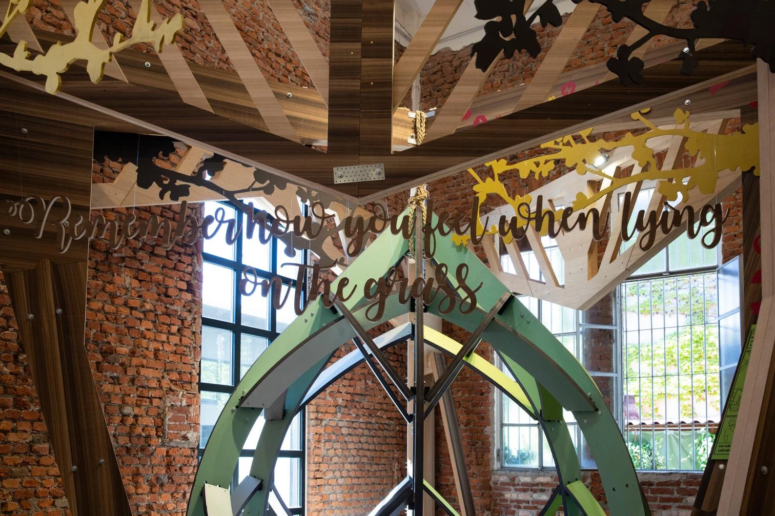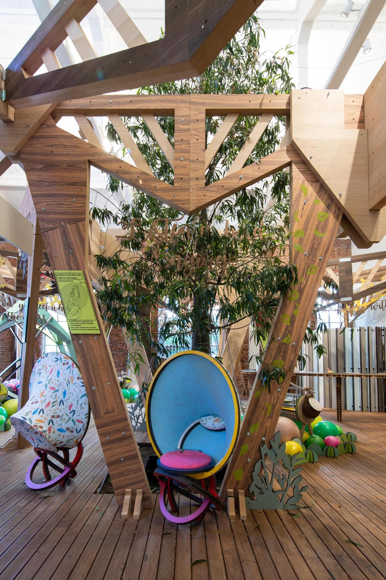 Under a pergola of triangular trusses, eight different installations form a route intended to stimulate our senses and recreate reassuring emotions, from the joy of lying on the grass to the awareness of one’s own physical weight. All this through an imaginative display of wood-based solutions that forms an enchanted forest inhabited by ergonomic furniture pieces and relaxing swings.