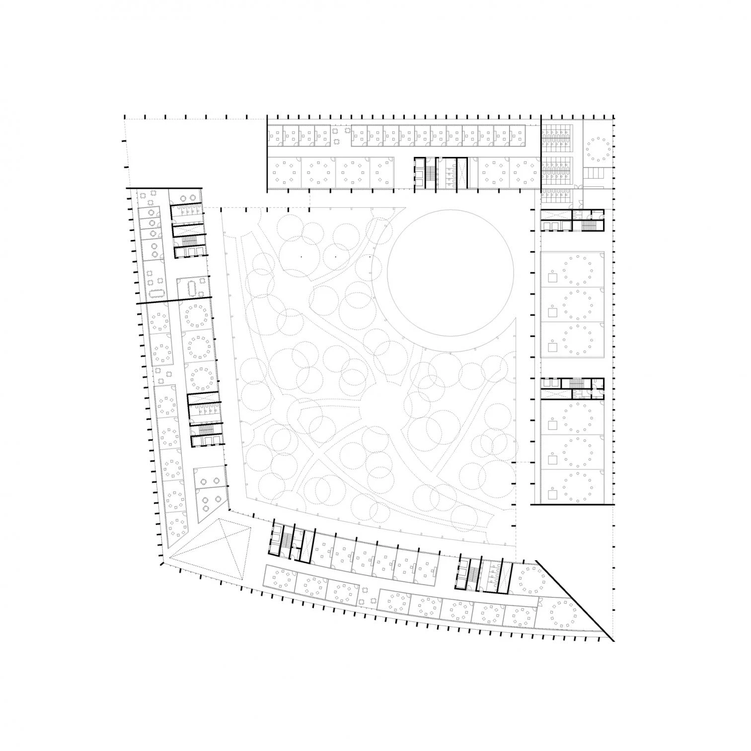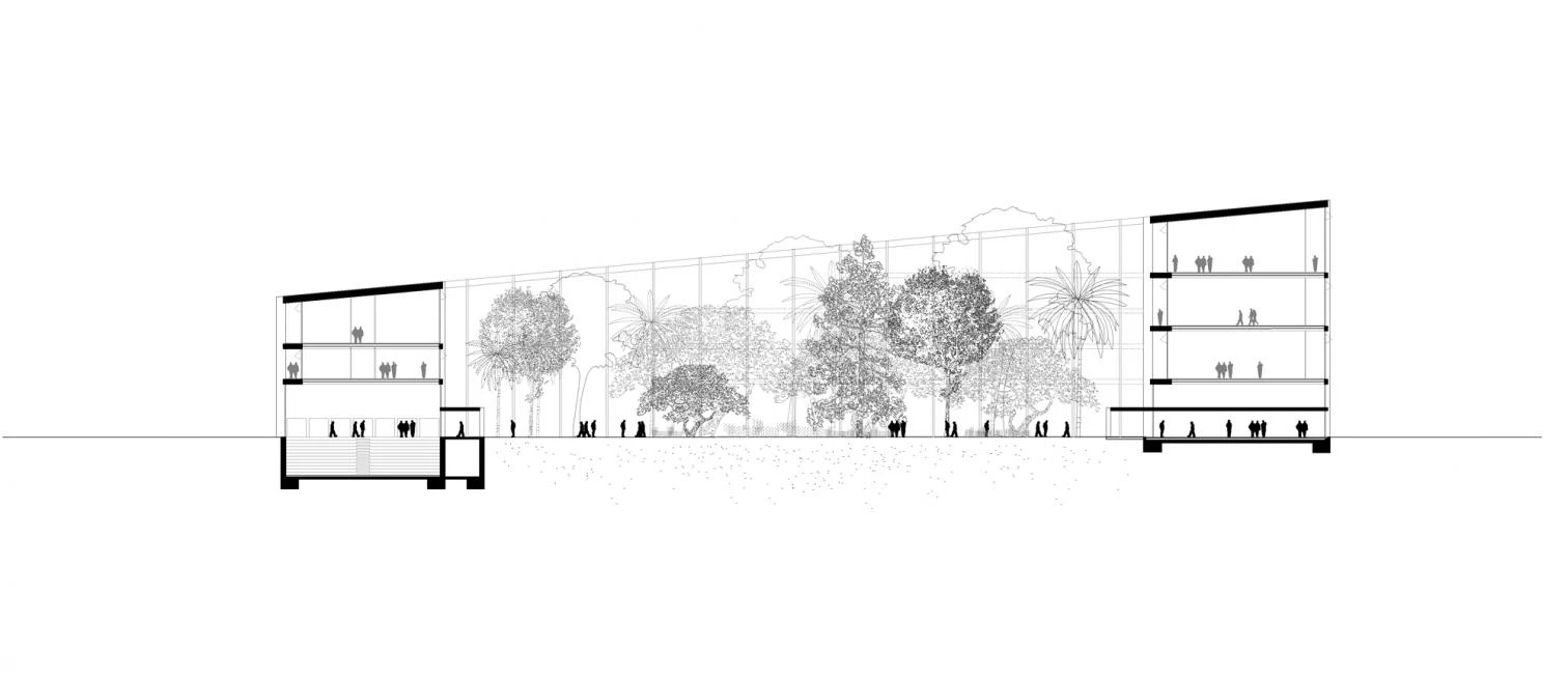 The three independent buildings are separated by the accesses to the inner garden. In section, the volume is topped with a roof whose slope starts low and rises gradually to block the view of the residential blocks behind. The different buildings, varying in width in accordance with needs, are built with no indoor pillars, maximizing versatility. The two facades are made up of lines of screened ceramic concrete pillars that hold up slabs of cross-laminated timber. At ground level, the most public and shared spaces – such as the four auditoriums, the library, the café, and the accessways to the three buildings – are connected by a perimeter porch leading out to the garden that acts as a cloister.
