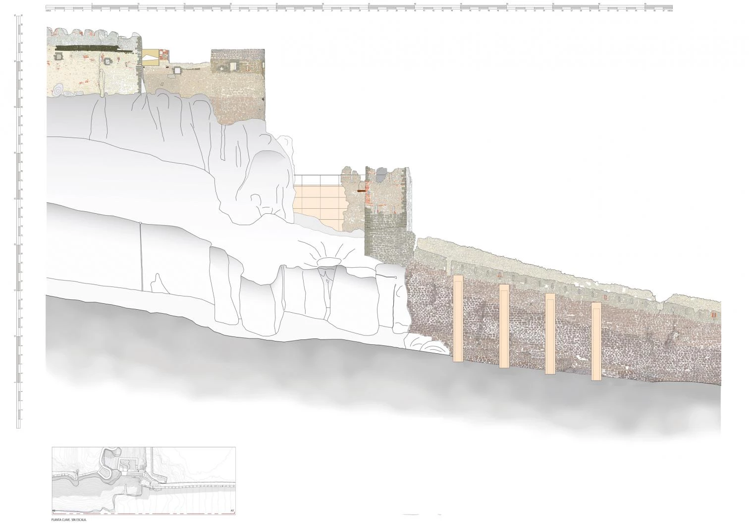 The 70-meter-long, 14-meter-high crenellated wall was strengthened on the outside with four buttresses. On the inside, fillings dating back to Carlist times that were structurally debilitating the wall were removed, and plenty of archaeological remains appeared in the process. A system of canals and pavements now channels rainwater, main cause of damage in the castle’s masonry, into a preexisting outdoor pool.