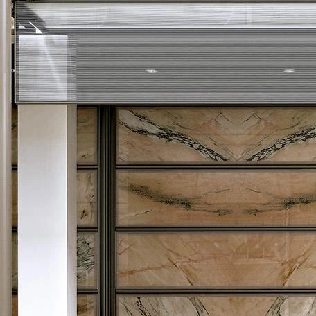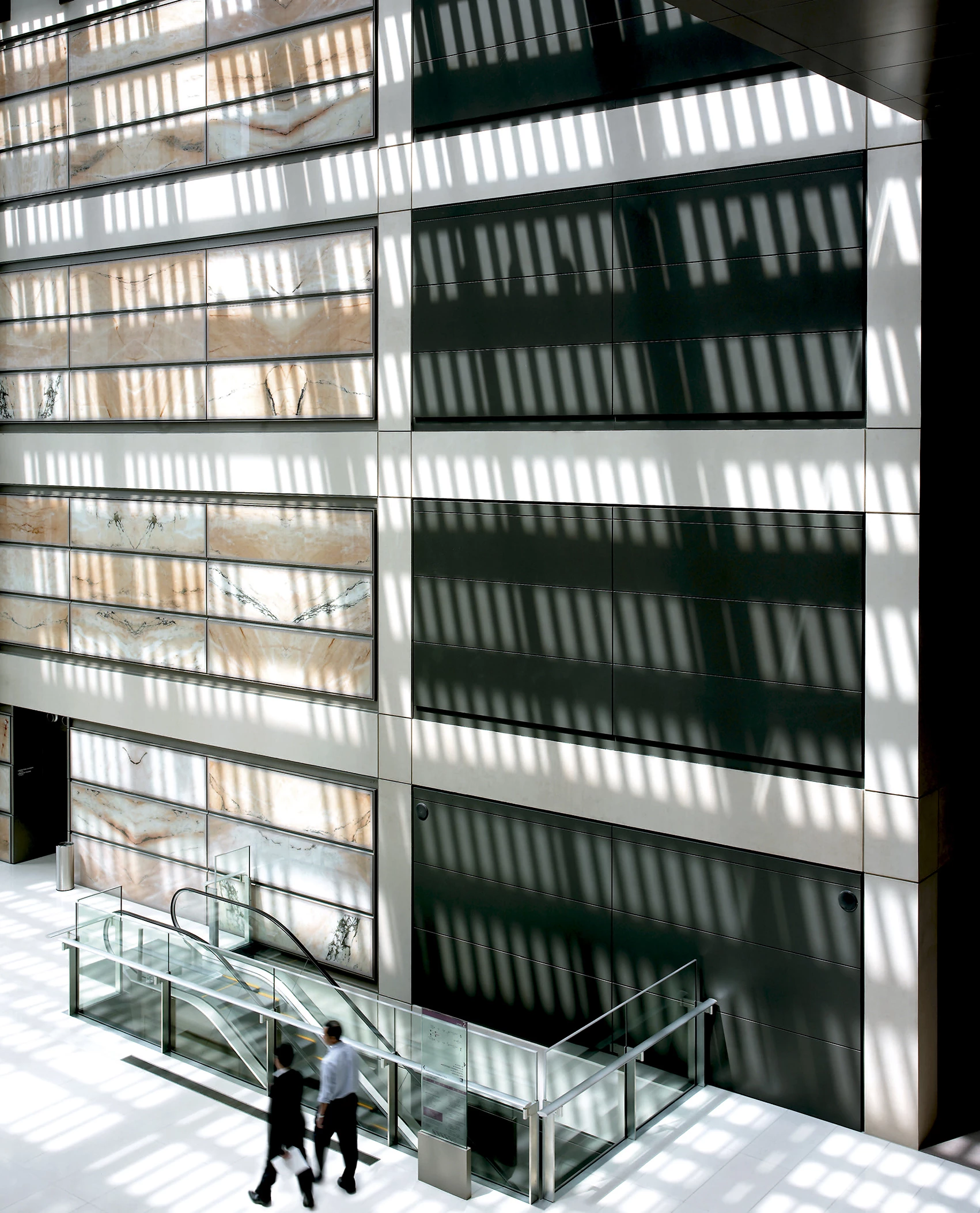 The blocks containing the courts are punctuated by a broad central atrium, which forms the main circulation route through the building, and brings daylight down to all the lower floors. The Supreme Court employs a palette of high-quality materials including a laminate of glass and stone – which