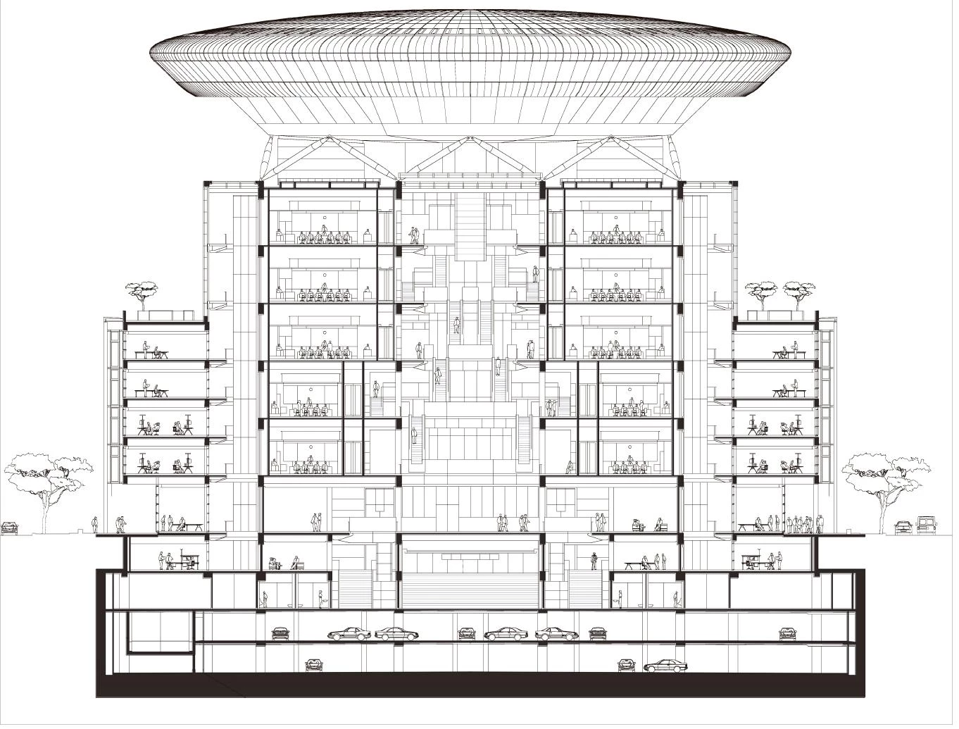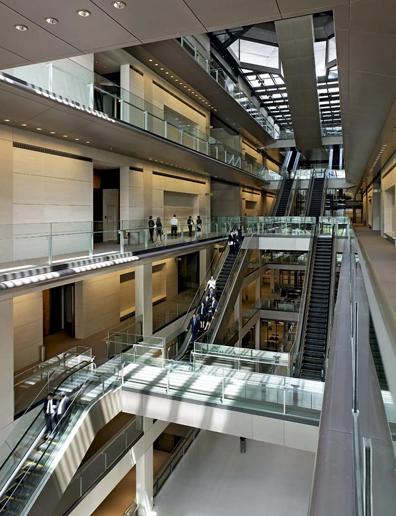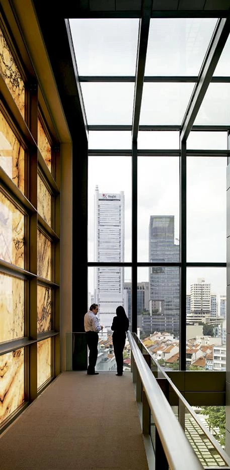 appears solid, but by day allows light to filter through it, and by night emits a warm glow. It incorporates a range of passive climate-control devices, including shading to the east and west facades to protect the office spaces from direct sunlight. The roof terraces of the office blocks are planted with trees to form a continuous blanket of greenery.